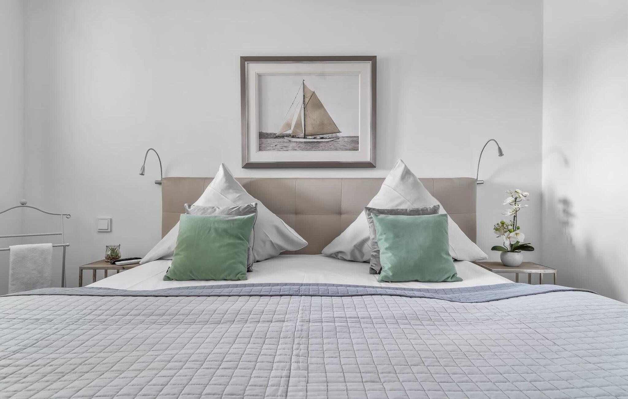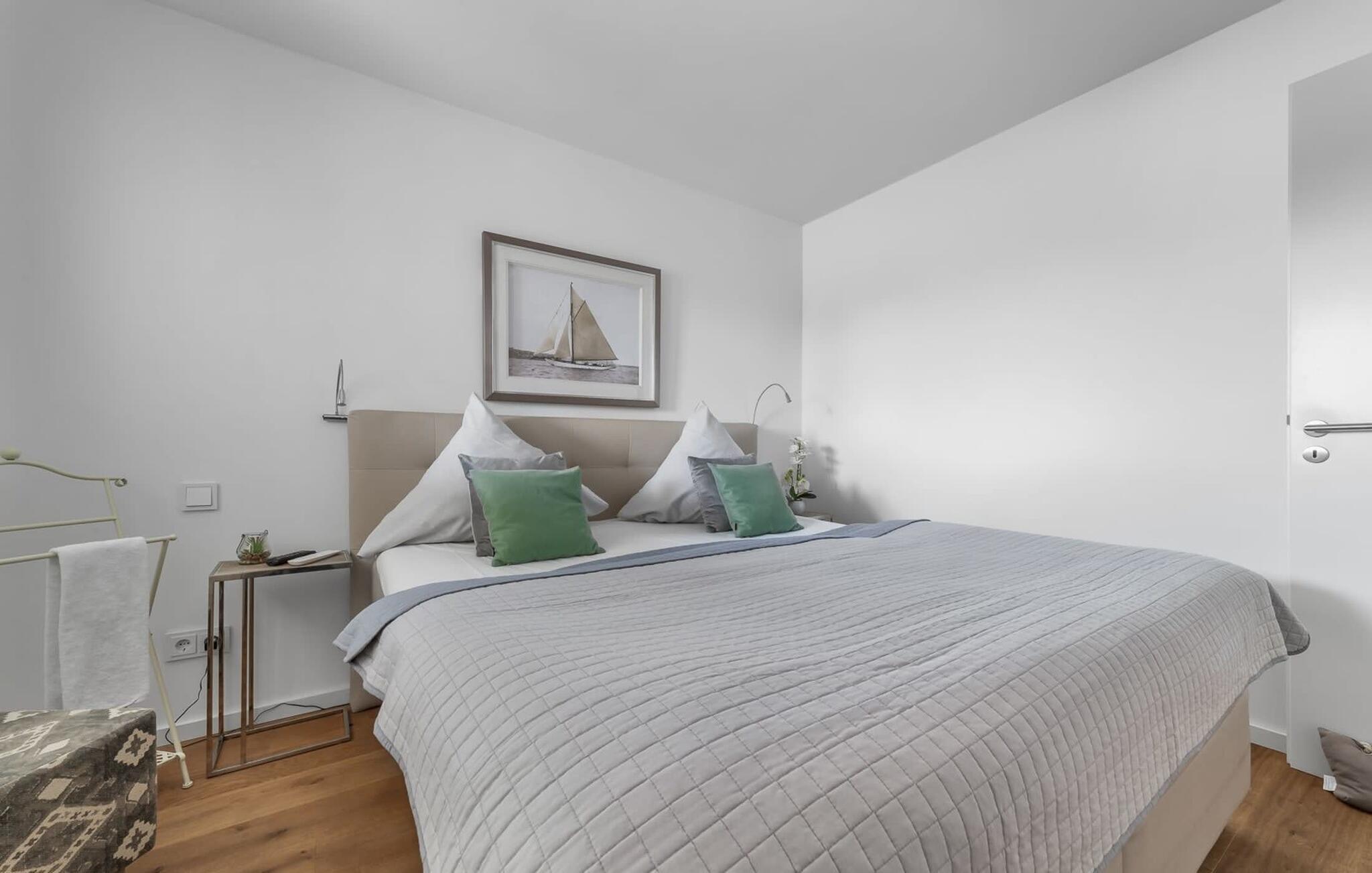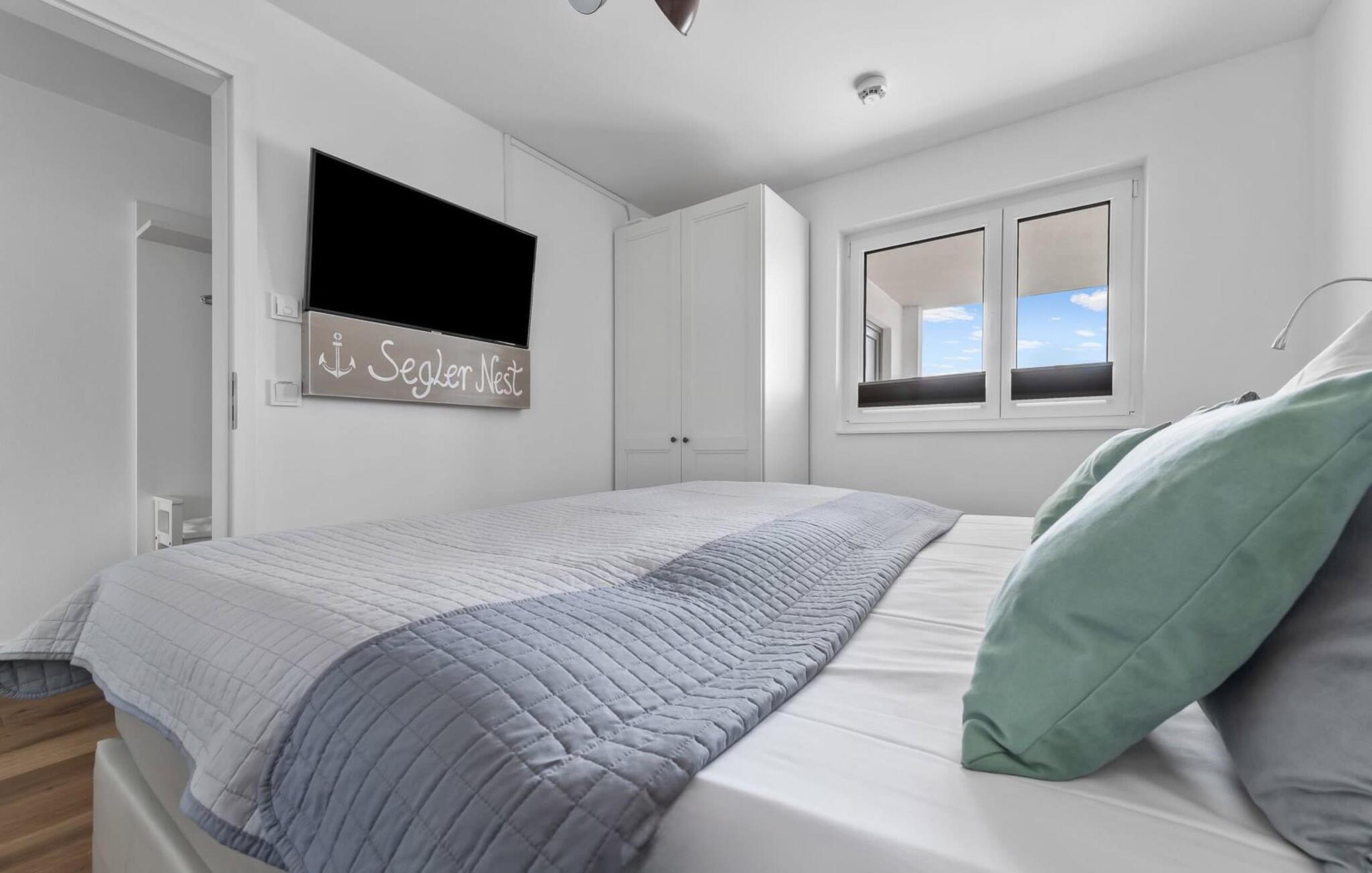 Det hyggelige soveværelse, udstyret med en dobbeltseng med boxspring og et ekstra fladskærms-tv, giver mulighed for en afslappende feriesøvn.
