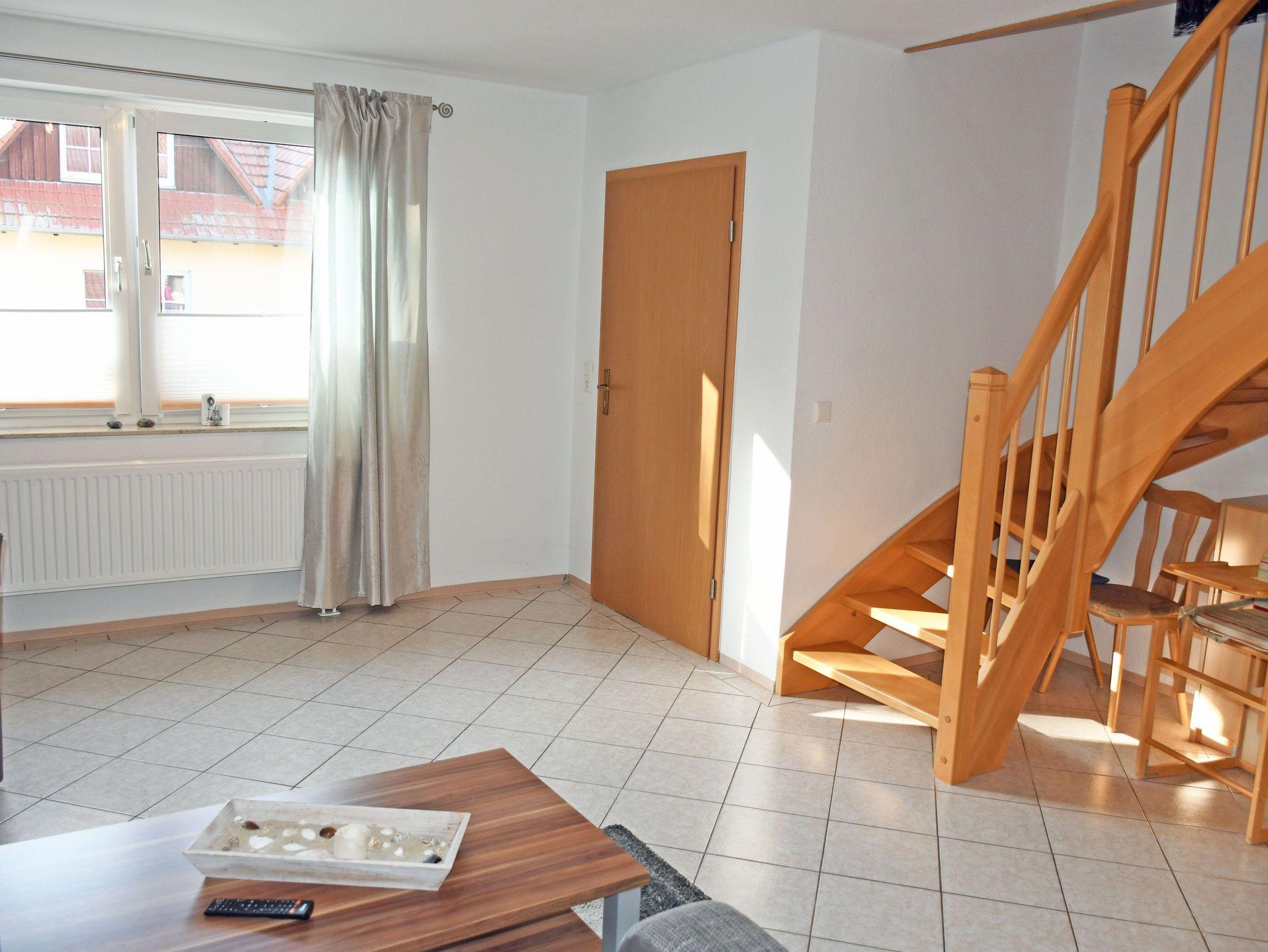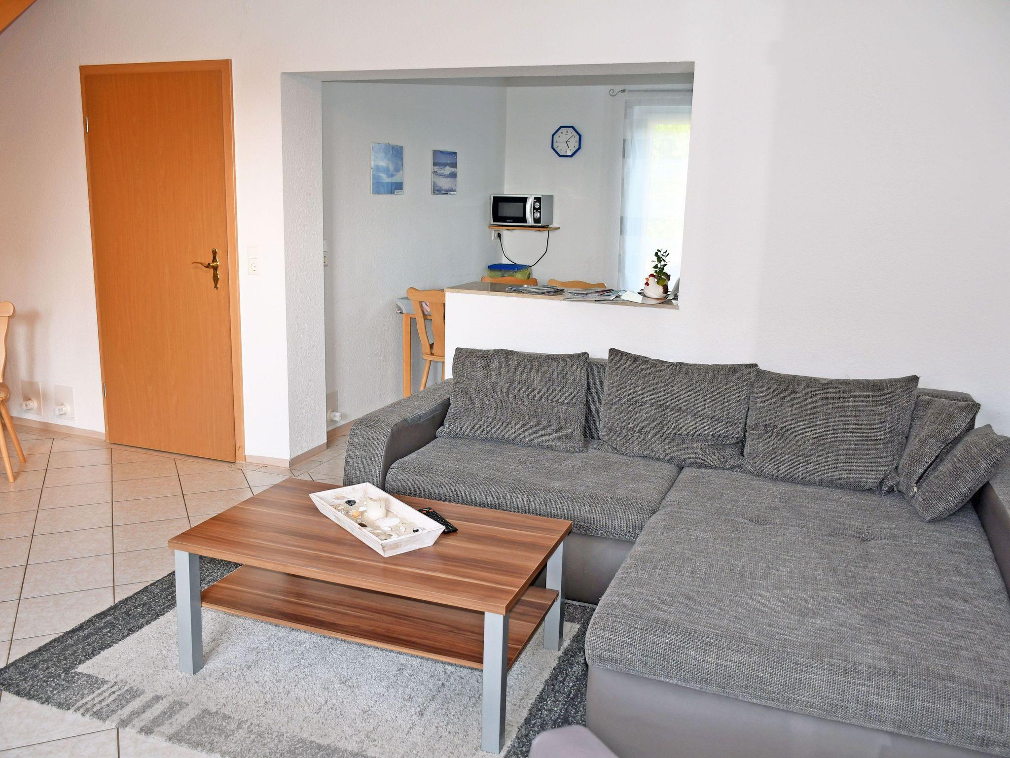 Im Erdgeschoss betritt man die Appartements über einen Flur mit Garderobe. Im großen Wohnraum befinden sich eine Couch mit Sessel und Tisch, Schrank, Flachbild-TV und eine Musikanlage.