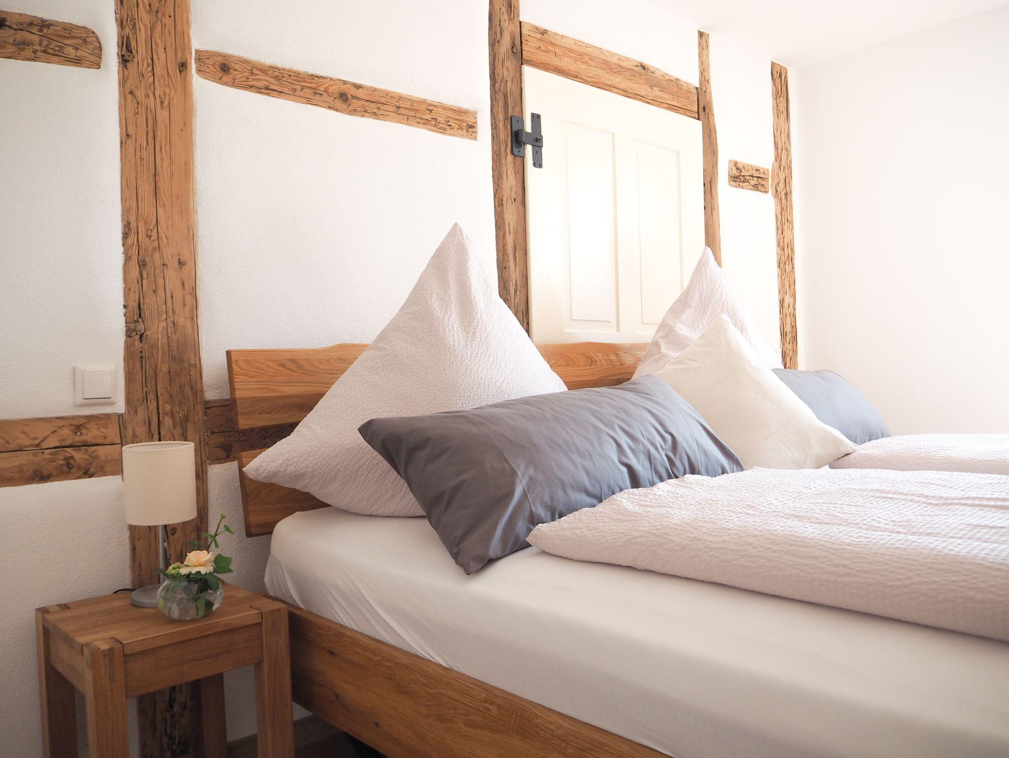 Das Schlafzimmer mit Doppelbett 180x200cm besticht mit dem gemütlichen Fachwerk.