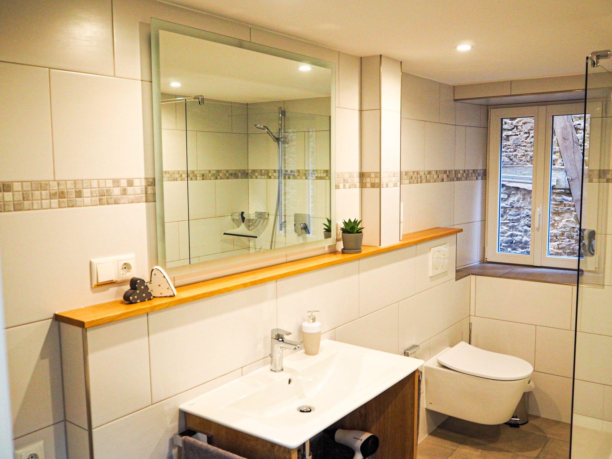 Das Bad verfügt über eine begehbare Dusche mit Waschbecken und WC, Handtücher und Haartrockner sind vorhanden.