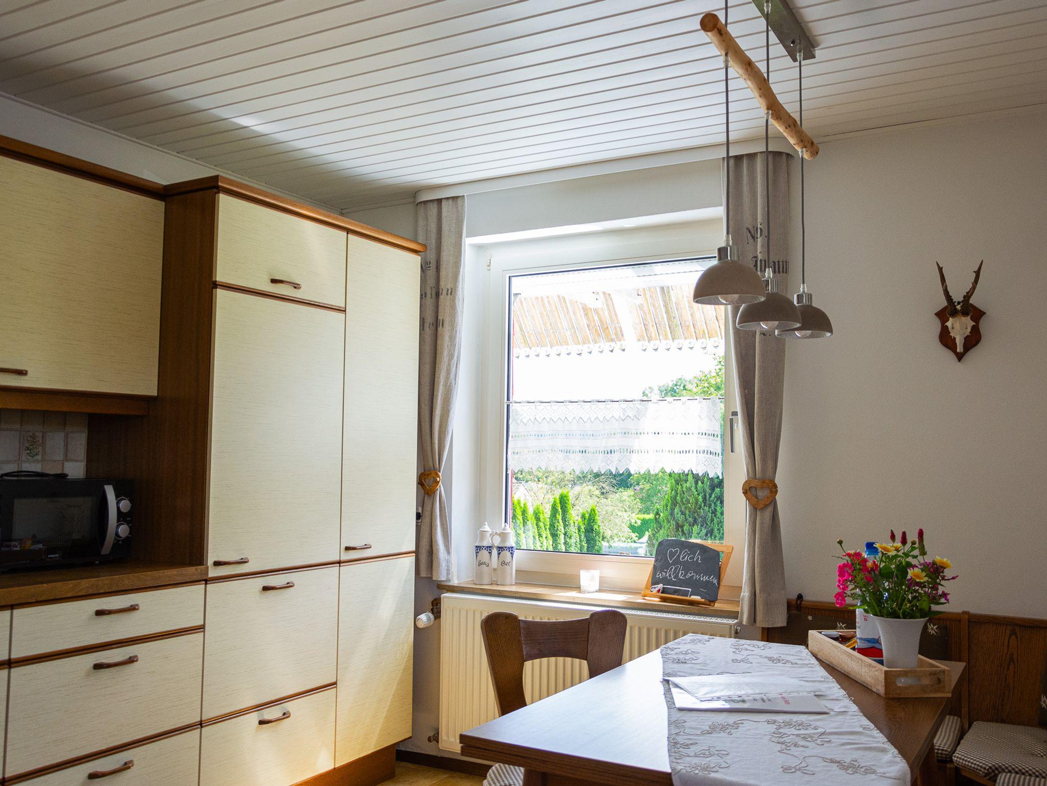 Das eingezäunte Grundstück und die dazugehörige, im Landhaus-Stil komplett eingerichtete 60qm Ferienwohnung, befindet sich im ersten Stock.