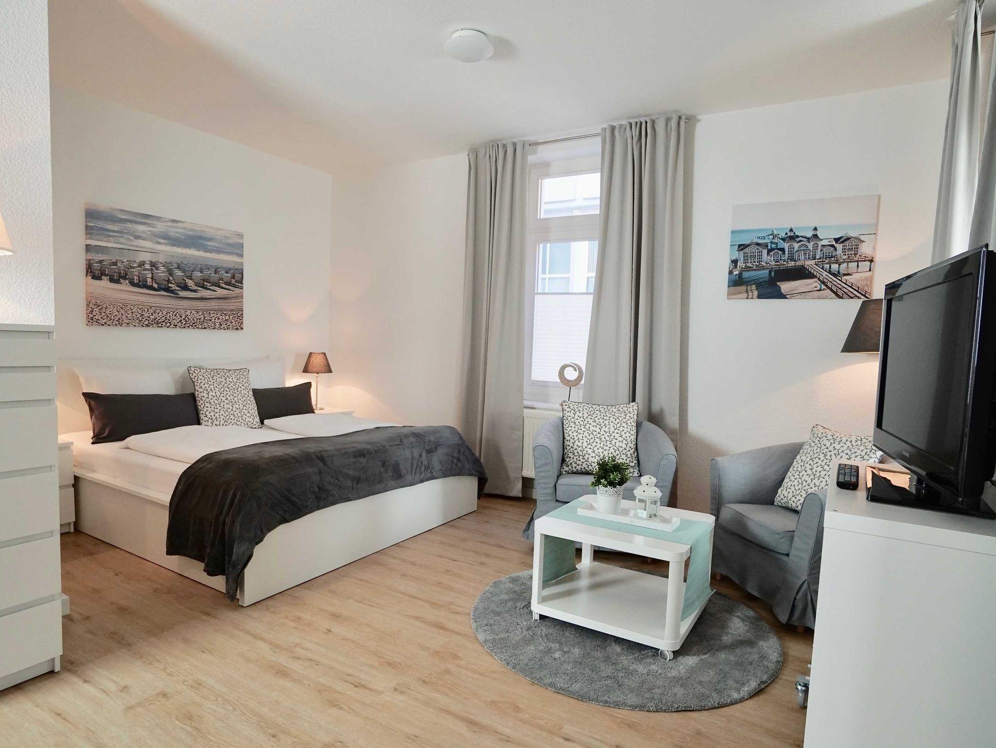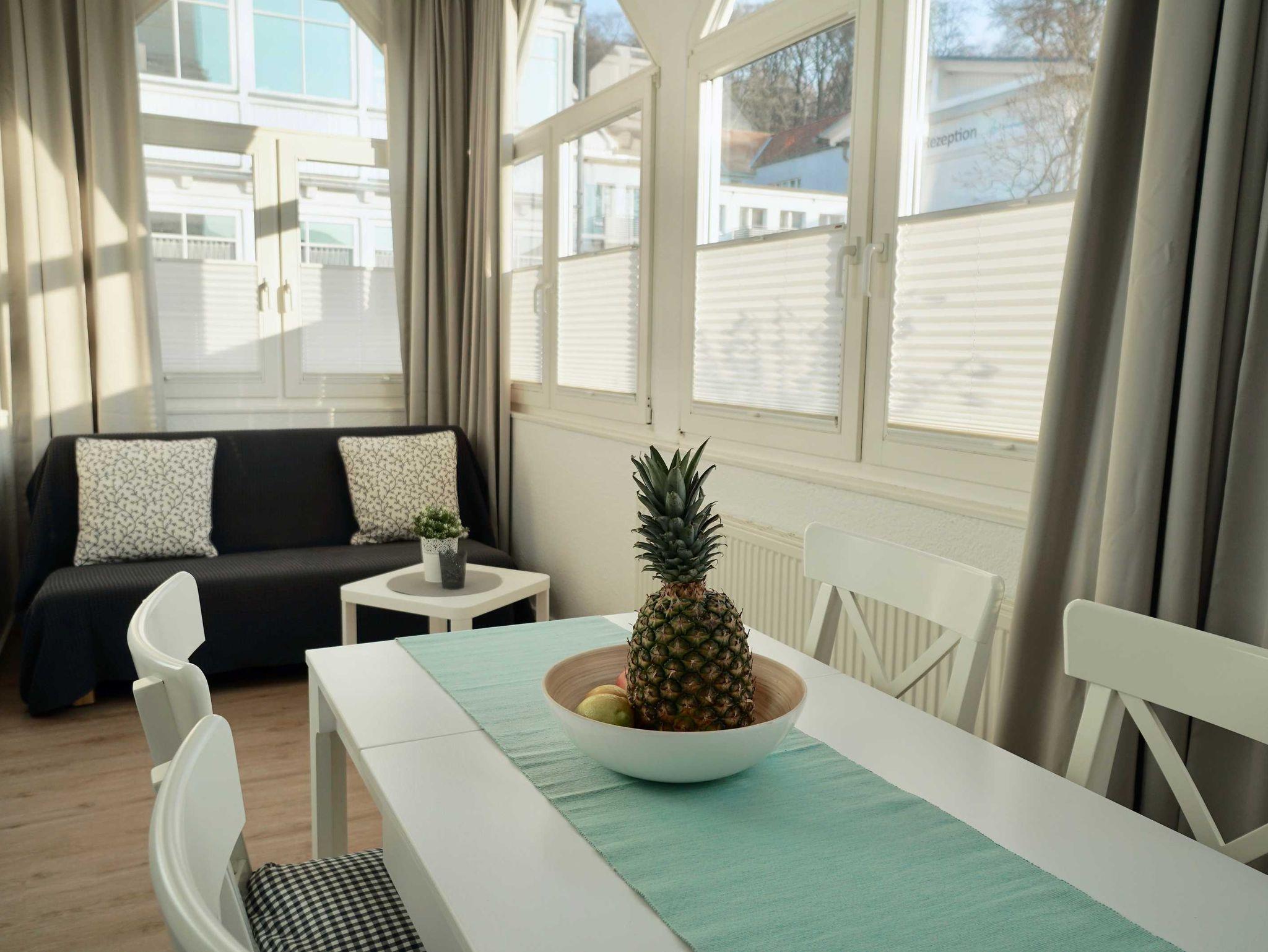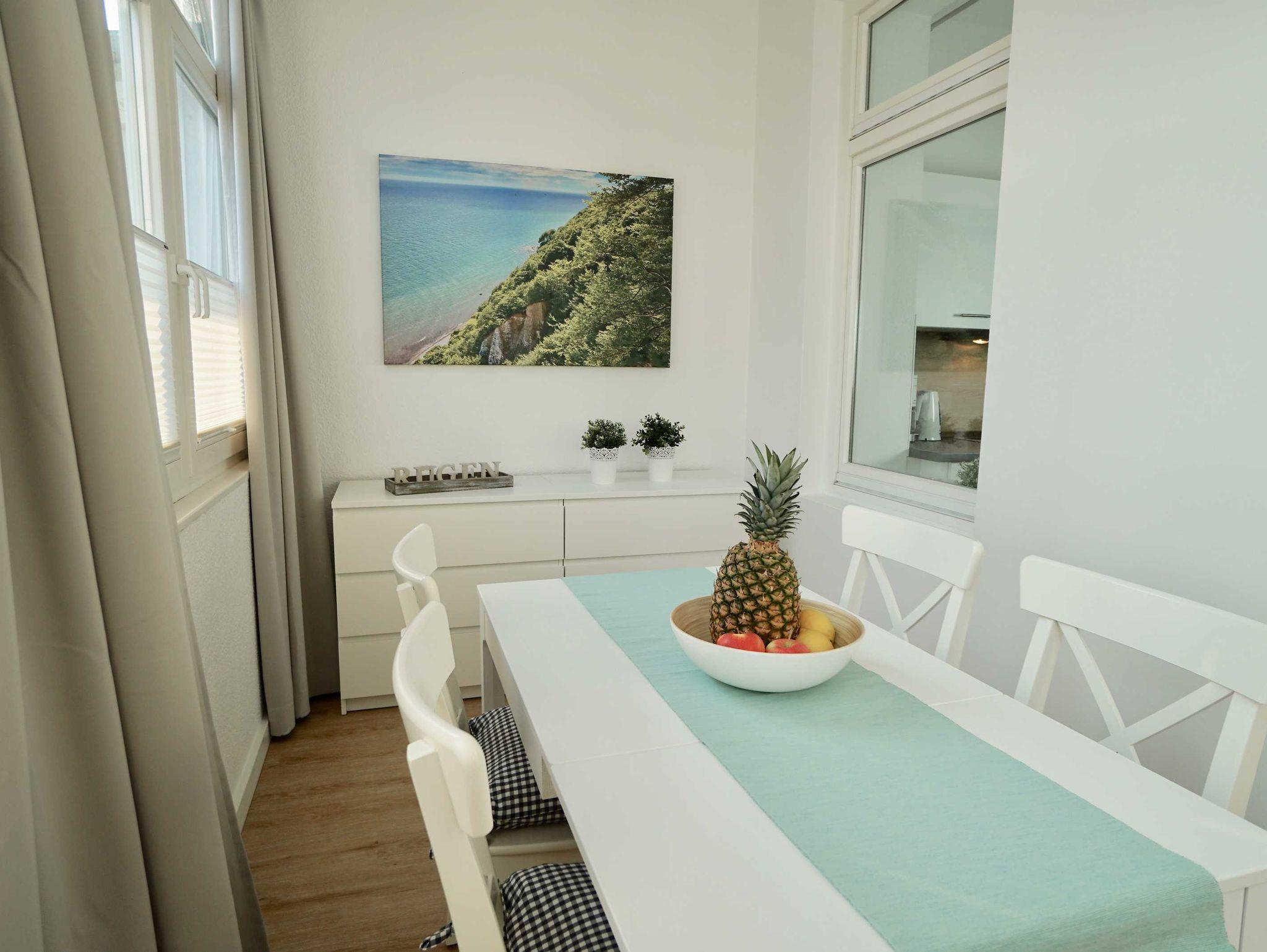 Diese Ferienappartements Vilm für 1 bis 2 Personen, verfügen über einen Wohn-Schlafraum mit Doppelbett, Einbauküche sowie einen separaten hellen Wintergarten mit Schlafsofa. Vom Wintergarten aus haben Sie einen schönan Ausblick zur Hofseite mit Blick zum Laubwald und Abendsonne. Die 49 qm großen Ferienwohnungen liegen im Erdgeschoss (2), im 1. Obergeschoss (5) und im 2. Obergeschoss (8). Ausstattung des Appartements: Küchenzeile, Kühlschrank, Spülmaschine, Heizung, Flachbild-TV, Backofen, Handtücher, Hochstuhl, Schlafsofa, SodaStream