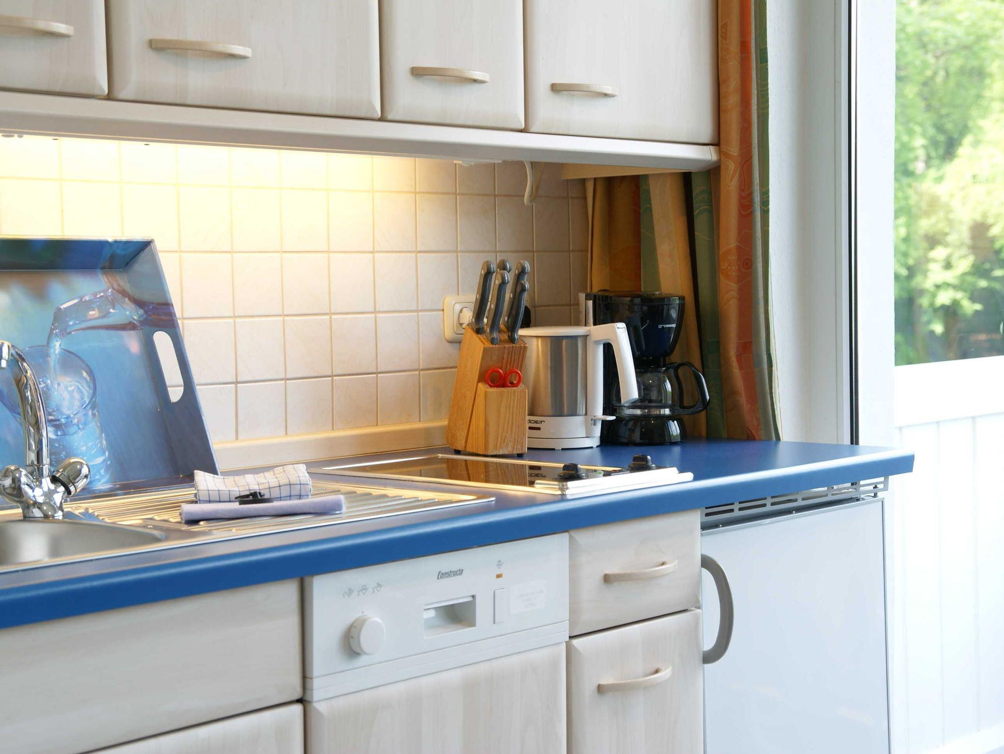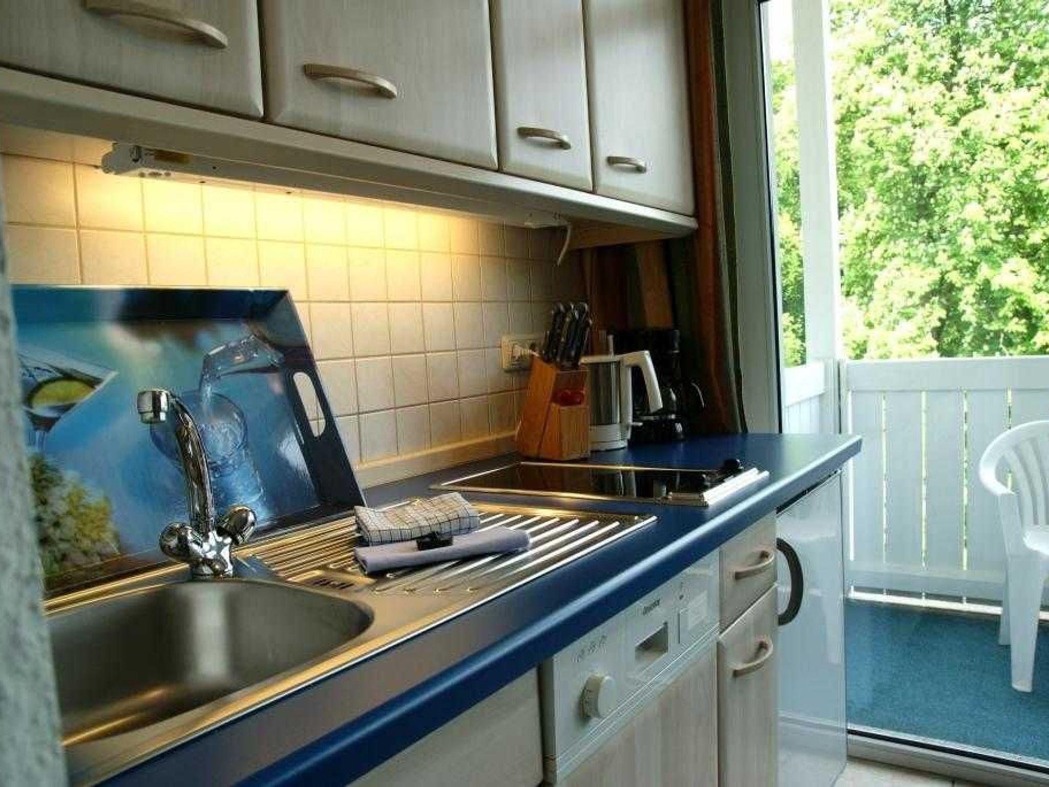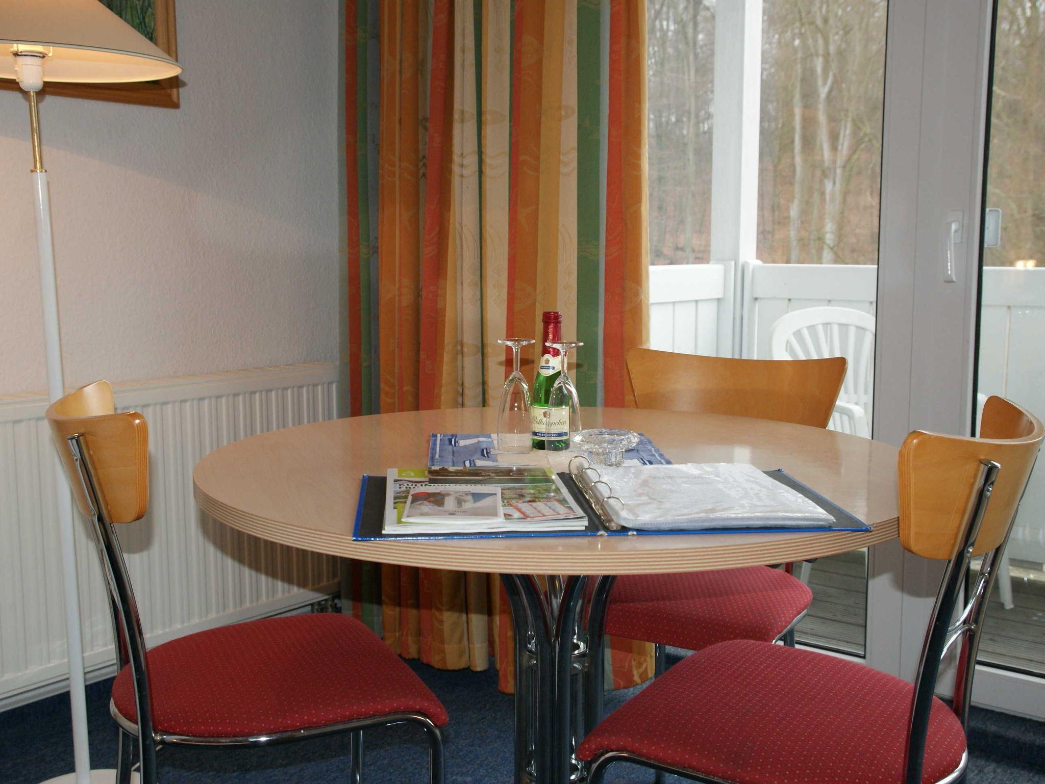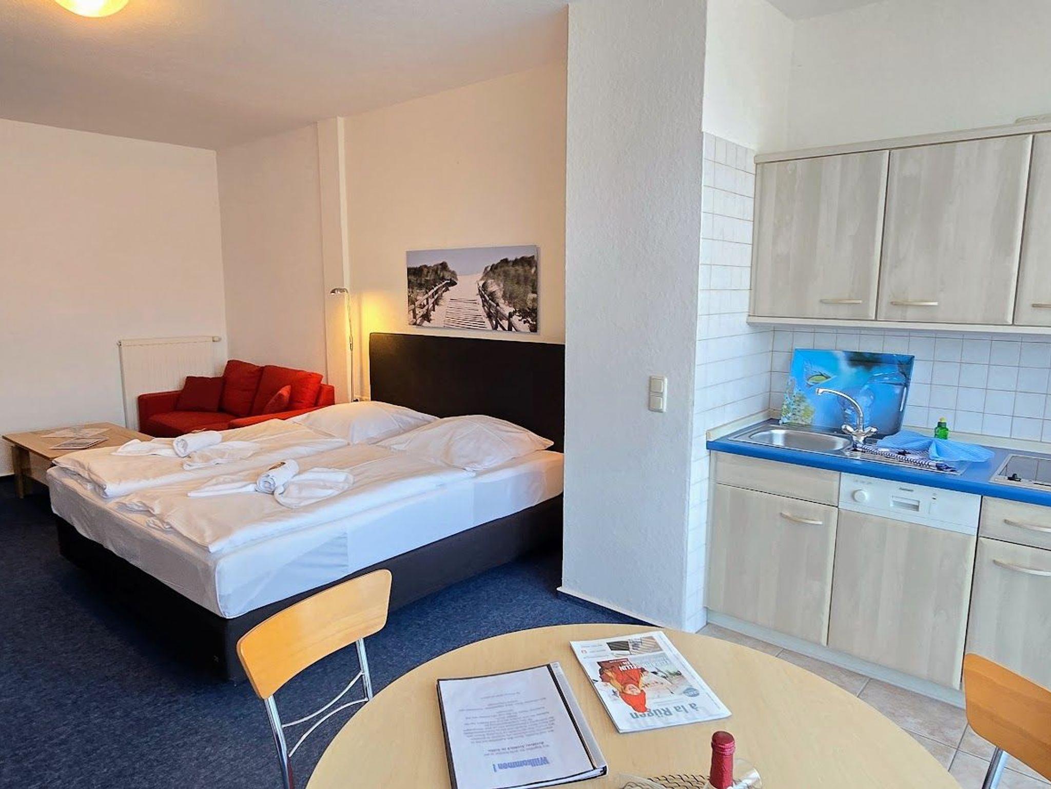 Das 1 Raumappartement hat einen Wohn-Schlafraum mit Doppelbett für 2 Pers.und einer ausziehbaren Couch, Kabel-TV,CD Stereoanlage ,Esstisch, gut ausgestattete Küchenzeile mit Geschirrspüler, Kaffeemaschine, Toaster und Microwelle. Babybett ( ohne Wäsche )und Hochstuhl für die kleinen stellen wir zur Verfügung ( bitte vorbestellen ) .