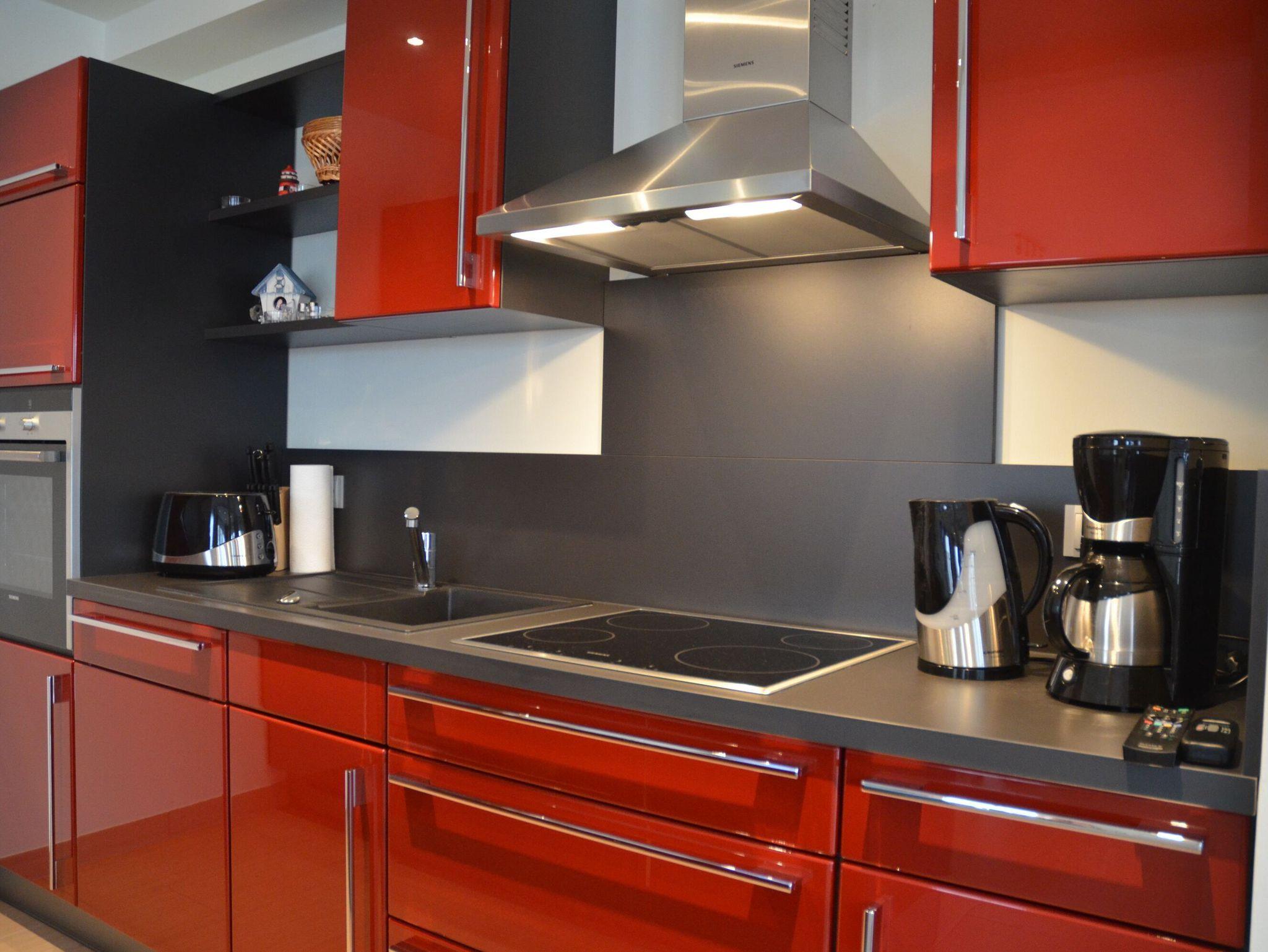 Die voll ausgestattete Küchenzeile verfügt u.a. über einen Kühlschrank mit Gefrierfach, eine Geschirrspülmaschine, ein 4-Zonen-Cerankochfeld mit Backofen, eine Mikrowelle, einen Mixer, eine Kaffeemaschine, einen Wasserkocher, Toaster und diverses Kleininventar, das die sehr gute Ausstattung komplettiert.