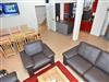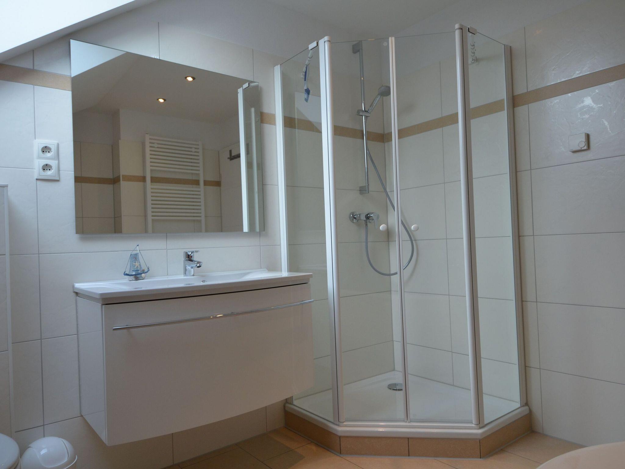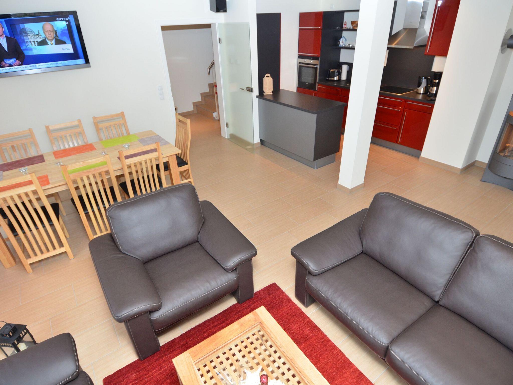 Im Erdgeschoss befinden sich der großzügige Wohn-/Essbereich mit integrierter Küchenzeile sowie ein Badezimmer mkit Dusche/WC. Der Wohnbereich ist mit einer hochwertigen Ledersitzgruppe, einem großformatigen Fernseher, einer Stereo-Audio-Anlage mit DVD-Player und einem Esstisch mit Platz für bis zu 6 Personen ausgestattet. Internet per DSL 7000-Flat steht Ihnen kostenfrei zur Verfügung. Ein Highlight in diesem Raum ist der moderne Kaminofen mit komfortabler Erdgasbefeuerung per Fernbedienung - Behaglichkeit auf Knopfdruck!