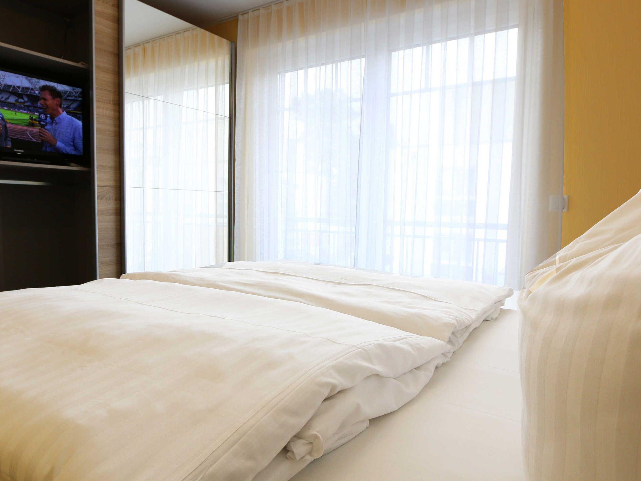 Die komfortabel eingerichtete Ferienwohnung 1 in der Villa Gina mit ca. 108 m² bietet Ihnen ausreichend Platz für 2 bis 6 Erwachsene + 1 Kleinkind bis 3 Jahre im Kinderreisebett. Bereits in der großzügigen Diele erwarten Sie 2 Garderoben. Anschließend kommen Sie in den lichtdurchfluteten Wohn-/Essbereich mit großen bodentiefen Fensterelementen mit einer perfekt geplanten Markenküche. Mit der Kücheninsel mit angrenzendem Tresen und Barhockern werden Sie Freude am gemeinsamen Kochen mit Familie und Freunden haben. Zur Ausstattung gehören ein großer Kühlschrank, Gefrierschrank, Geschirrspüler, Backofen, Ceranfeld sowie eine Mikrowelle. Zu den weiteren kleinen und großen Küchenhelfern gehören Kaffeemaschine, Senseo-Kaffeeautomat, Wasserkocher, Eierkocher, Toaster, elektrische Zitruspresse, Standmixer, Hand- und Stabmixer. Die LED-Beleuchtung an Sockeln und Tresen machen die Küche zu einem gemütlichen Aufenthaltsort. Im angrenzenden Essbereich haben 6 Personen auf bequemen Schwingstühlen ausreichend Platz, ihre Mahlzeiten zu genießen. Im Wohnbereich können Sie es sich auf der großen Ledercouch oder dem Ledersessel bequem machen. Mit einem guten Buch können Sie sich hier entspannen oder auf dem 55 Zoll Smart-TV in Full-HD-Qualität mit Sky (Auswahl von Sport, Film, Dokumentation), LED-Hintergrundbeleuchtung und Netflix Ihre Lieblingssendung anschauen. Auf dem Blu-Ray Player mit USB können Sie Ihre mitgebrachten Filme abspielen. Eine Stereoanlage mit CD, USB und Bluetooth, die auf einem großen Sideboard steht sowie WLAN runden das Entertainmentequipment ab. Die Fußbodenheizung sorgt in Kombination mit den exklusiven Designböden für ein sehr angenehmes Raumklima. Eine automatische Be- und Entlüftungsanlage sorgt zudem für einen hohen Wohnkomfort. Der elektrische Kaminofen bringt Behaglichkeit an kühleren Tagen. Die Terrasse in Südausrichtung mit Ampelschirm sowie eine überdachte Ost-Terrasse sind vom Wohnbereich zu erreichen und bieten zudem einen Kugelgrill. Falls Sie mit Ihrem vierbeinigen Freund gegen eine Gebühr anreisen, ist selbstverständlich in dem rund 47 m² großen Wohn-/Essbereich ausreichend Platz vorhanden für den mitgebrachten Schlafplatz. Elektrische Rollläden befinden sich an der Süd- und Westseite des Raumes. Ein paar Gesellschaftsspiele, Holzspielzeug für die kleinen Gäste sowie einige Bücher finden Sie ebenfalls vor. Kindersicherungen an den zugänglichen Steckdosen sind vorhanden. Für Ihren erholsamen Schlaf stehen Ihnen insgesamt 3 komfortable Schlafzimmer zur Verfügung. In 2 Schlafzimmern finden Sie jeweils ein Boxspringbett mit Taschenfederkernmatratzen und Komfort-Topper in der Größe 1,60m x 2,00m, Nachttischablagen mit dimmbarer Beleuchtung und USB zum Aufladen von Handys oder E-Books, Radiowecker, einen Kleiderschrank sowie einen 32 Zoll-Flachbild-TV mit Smart-TV. Beide Schlafzimmer haben elektrische Rollläden. Im 3. Schlafzimmer befindet sich ein Boxspring-Einzelbett (1,00m x 2,00m) sowie eine bequeme Schlafcouch (1,50m x 2,00m), die tagsüber als Sofa dient. Abgerundet wird das Schlafzimmer mit einem 32 Zoll-Flachbild-TV mit Smart-TV sowie einem Kleiderschrank und 2 Nachttischablagen mit dimmbarer Beleuchtung sowie Radiowecker. Verdunklungsvorhänge sorgen für einen ungestörten Schlaf. Die beiden hochwertigen Tageslicht-Bäder mit Fußbodenheizung sorgen dafür, dass es zu keinem morgendlichen Stau kommt. Das eine Badezimmer ist ausgestattet mit einer bodentiefen Echtglasdusche, Badewanne, 2 Waschplätzen und Spiegelschrank, WC, Kosmetikspiegel, Handtuchtrockner und Fön. Das zweite Bad hat eine Walk-In-Dusche, 1 Waschtisch und Spiegelschrank, WC sowie ebenfalls Handtuchtrockner und Fön. Zusätzlich gibt es in der Wohnung noch einen Abstellraum. Hier befinden sich ein Hochstuhl für die kleinen Gäste sowie Staubsauger und Reinigungsutensilien. Im Untergeschoss befindet sich ein Wirtschaftsraum mit Waschmaschine und Trockner, die kostenfrei genutzt werden können. Ein Wäschetrockner, Bügelbrett und ein Bügeleisen stehen Ihnen ebenfalls zur Verfügung. Des Weiteren finden Sie hier die gemeinschaftliche Sauna mit einer separaten Walk-In-Dusche mit Waschbecken und WC sowie einen angrenzenden Ruheraum mit Liegen und Relax-Stühlen, außerdem ein elektrischer Wandkamin und eine atemberaubende Fototapete. Lassen Sie sich überraschen. Im Außenbereich finden Sie jeweils einen Parkplatz (Nr.01) sowie einen abschließbaren Fahrradschuppen mit Steckdose zum Aufladen für Ihr E-Bike für jede Wohnung. Darin befinden sich auch die kostenlos zur Verfügung gestellten Bollerwagen für Ihre Strandutensilien. Die Erstausstattung eines Wäschepaketes (komplette Bettwäsche, 1 Duschhandtuch, 1 kleines Handtuch) können Sie bis 14 Tage vor Anreise gegen einen Aufpreis dazu buchen oder durch eigene ergänzen. Ab 2 gebuchten Paketen erhalten Sie einmalig 1 Geschirrhandtuch und 1 Duschvorleger hinzu. Wir wünschen Ihnen einen erholsamen und erlebnisreichen Urlaub!