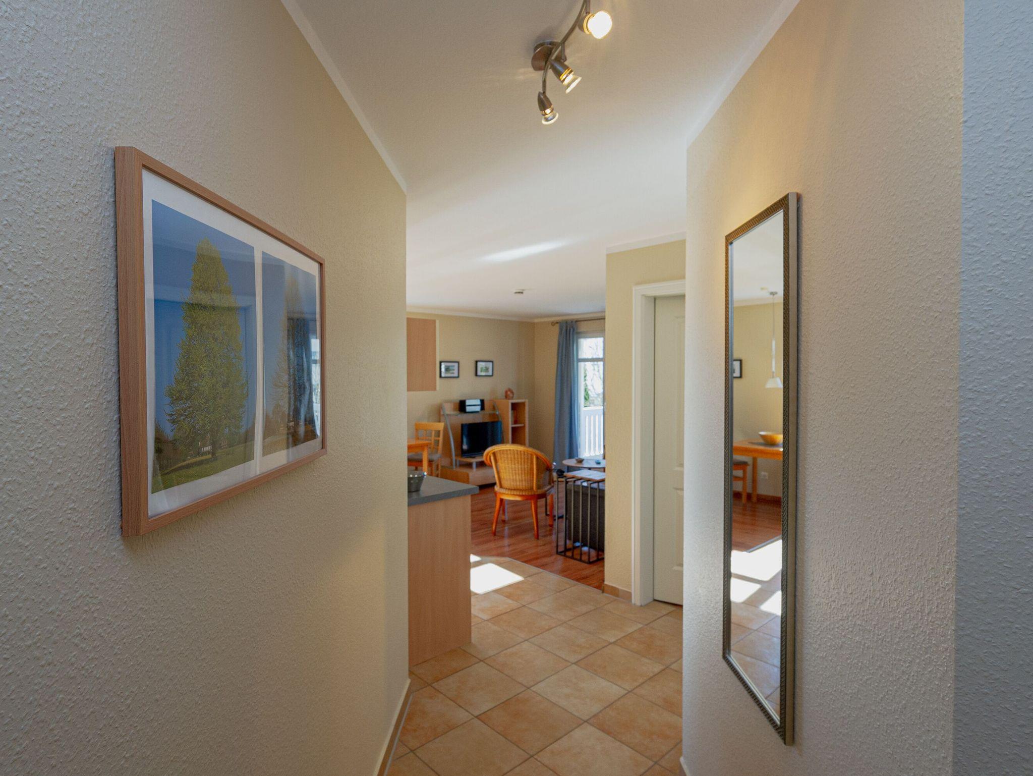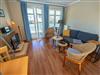 Der helle, freundliche Wohnraum ist mit einer bequemen Schlafcouch (Aufbettungsmöglichkeit für 2 Personen), zwei Sesseln, einem Flachbild-TV, einer Mini-Stereoanlage mit CD-Player und einem Esstisch eingerichtet. Die harmonisch im Wohnbereich integrierte Küchenzeile ist ausgestattet mit einem Kühlschrank mit Gefrierfach, einem 4-Platten-Cerankochfeld, einem Backofen, einer Geschirrspülmaschine, einer Mikrowelle, Wasserkocher, Kaffeemaschine, Toaster und diversem Kleininventar, das die Küchenausstattung komplettiert.
