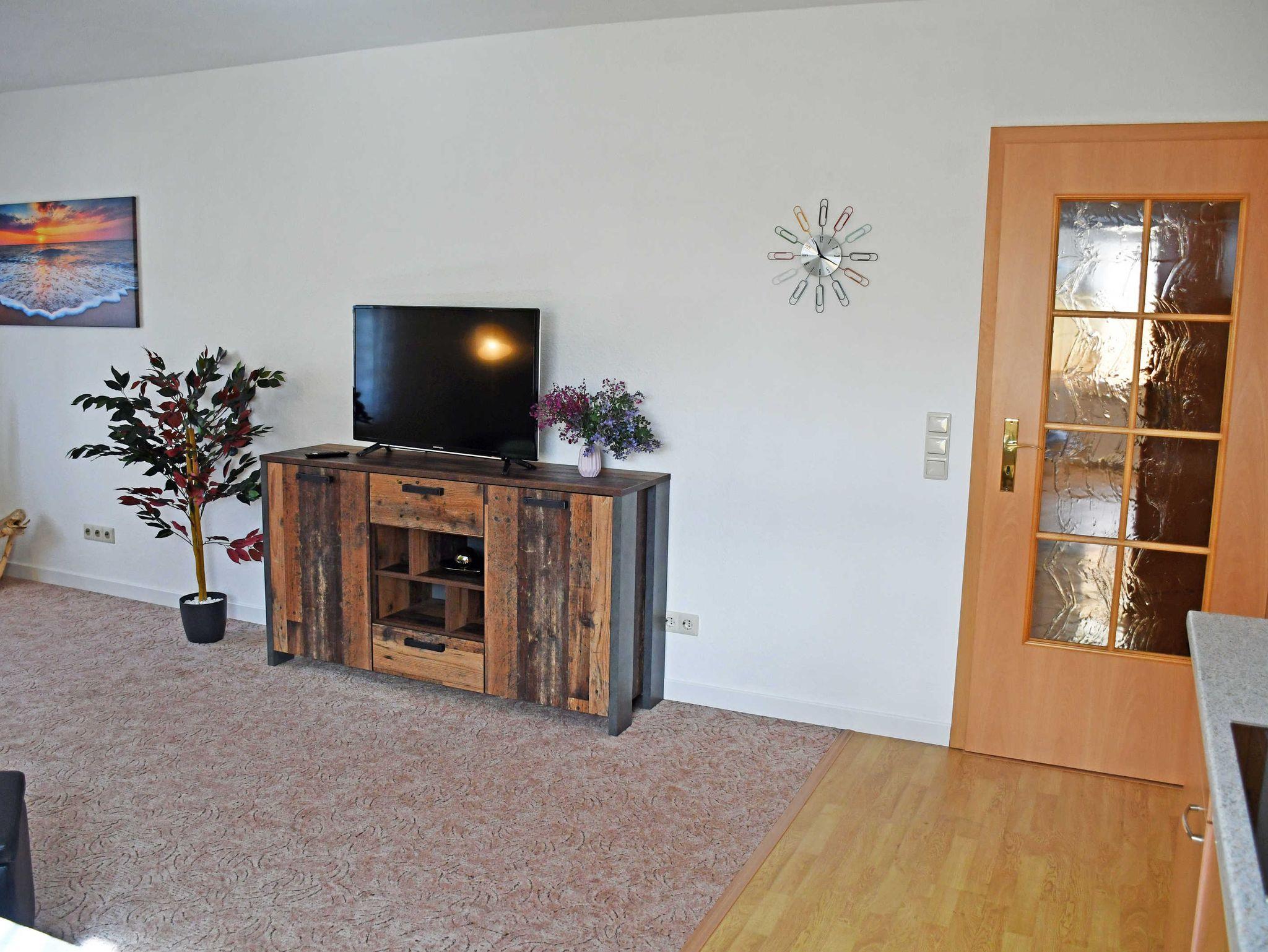 Die 2-Raum Ferienwohnung 02 zwischen Ostsee und Bodden (50 qm, max. 2 erw. Gäste) hat getrennte Wohn- und Schlafräume. Im Wohnzimmer stehen Sitzcouch, Tisch und Stühle, ein Flachbild-TV und eine moderne Küchenzeile. Diese ist mit Ceranfeldherd, Spülmaschine, Wasserkocher, Kaffeemaschine, Toaster, Kühlschrank und Mikrowelle ausgestattet.