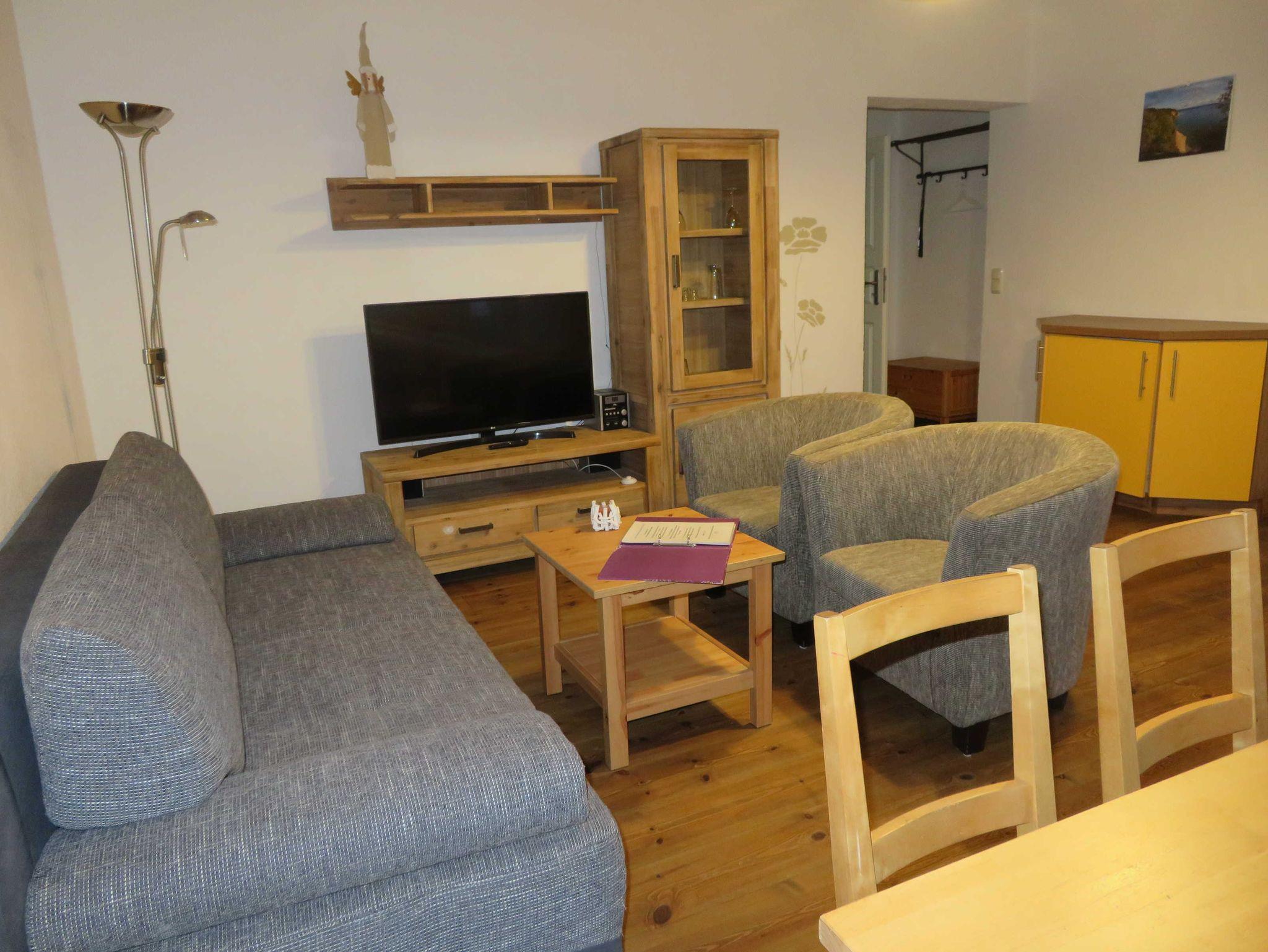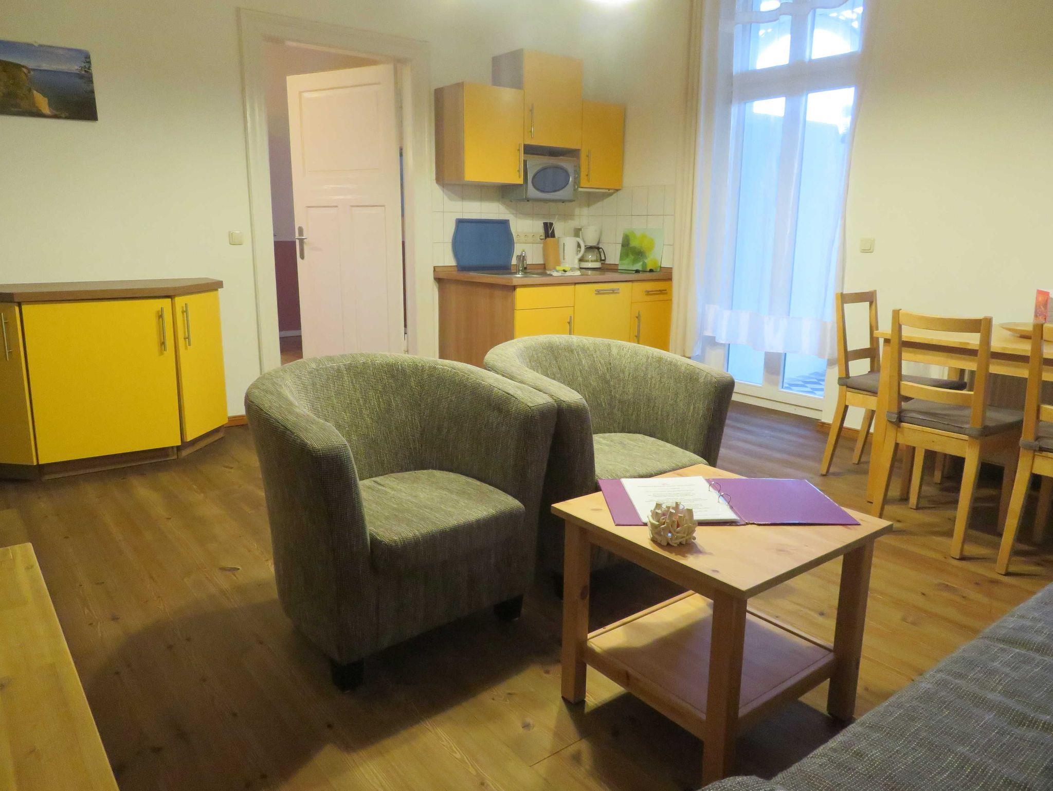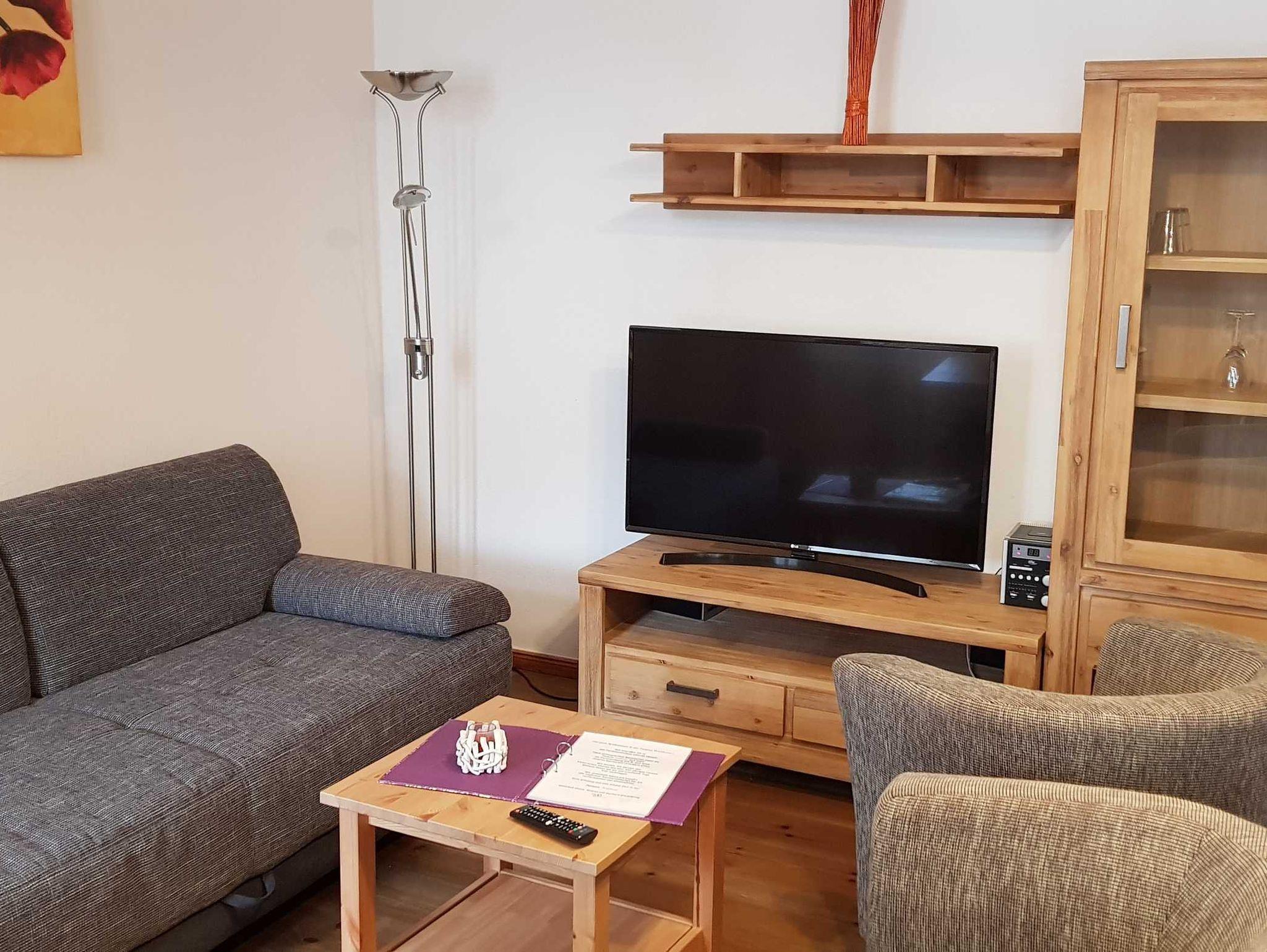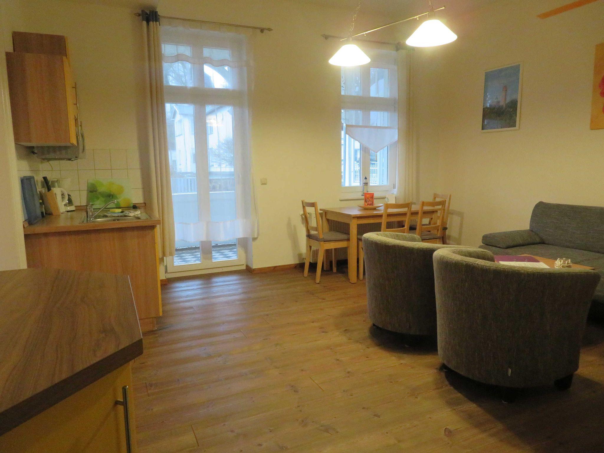 Die 2- Raum- Ferienwohnung hat ein Schlafzimmer mit einem Doppelbett und im Wohnzimmer ein Schlafsofa mit zwei weiteren Schlafplätzen. Im Wohnzimmer befindet sich die Küche mit Kühlschrank, Geschirrspülmaschine, Mikrowelle, Kaffeemaschine, Toaster und Wasserkocher. Die Ferienwohnung ist mit Kabel- TV ausgestattet und hat einen Balkon.