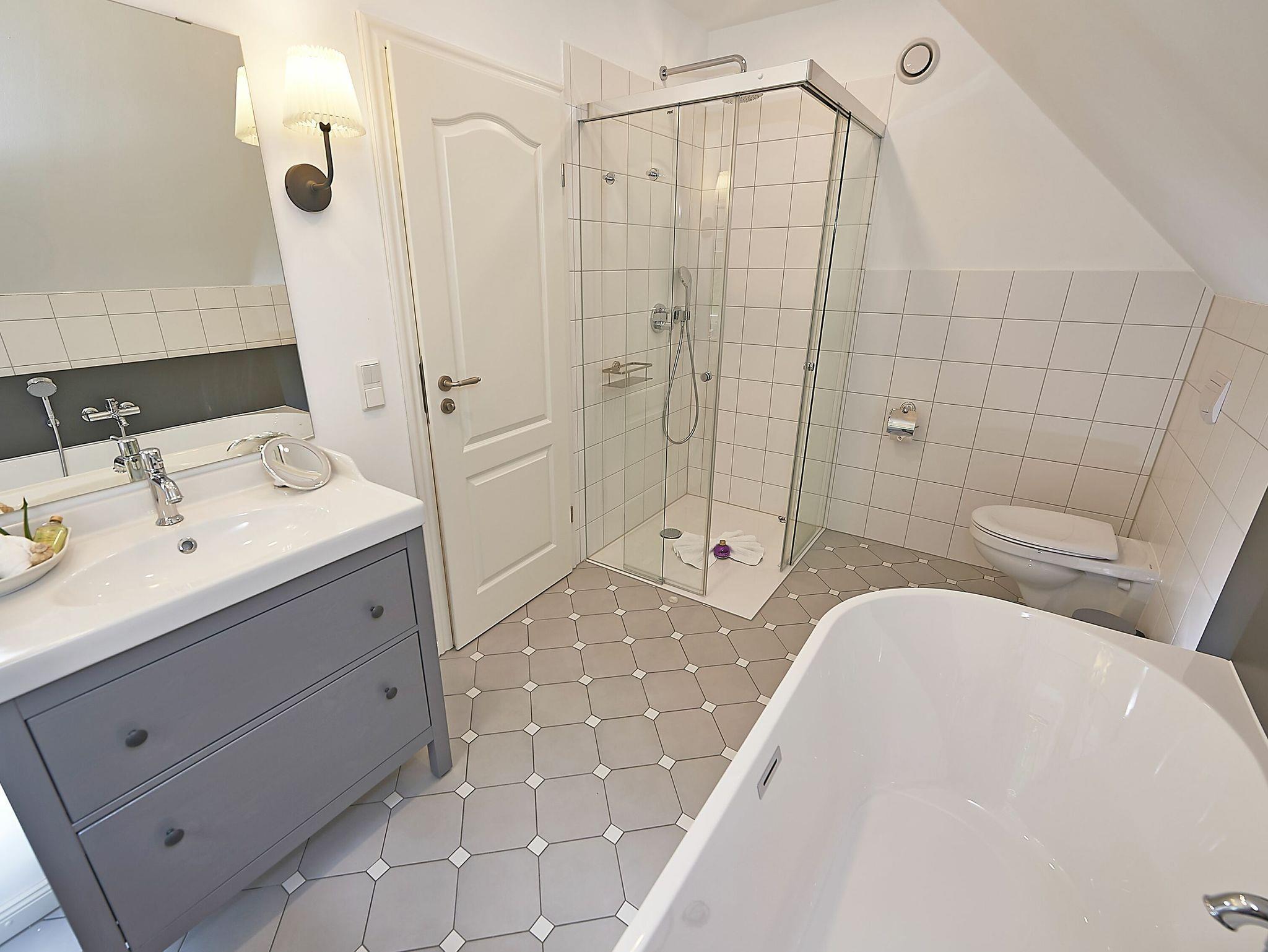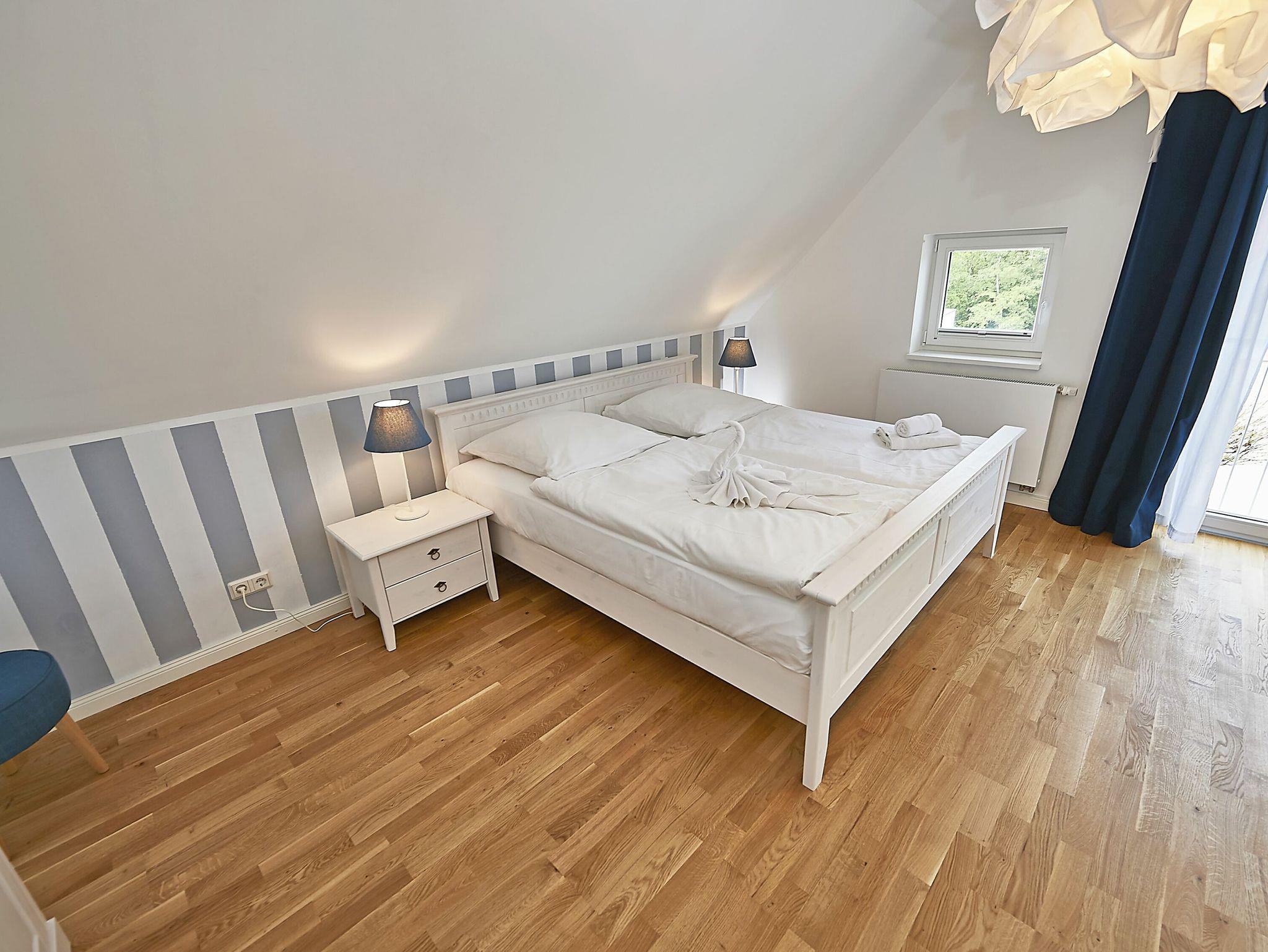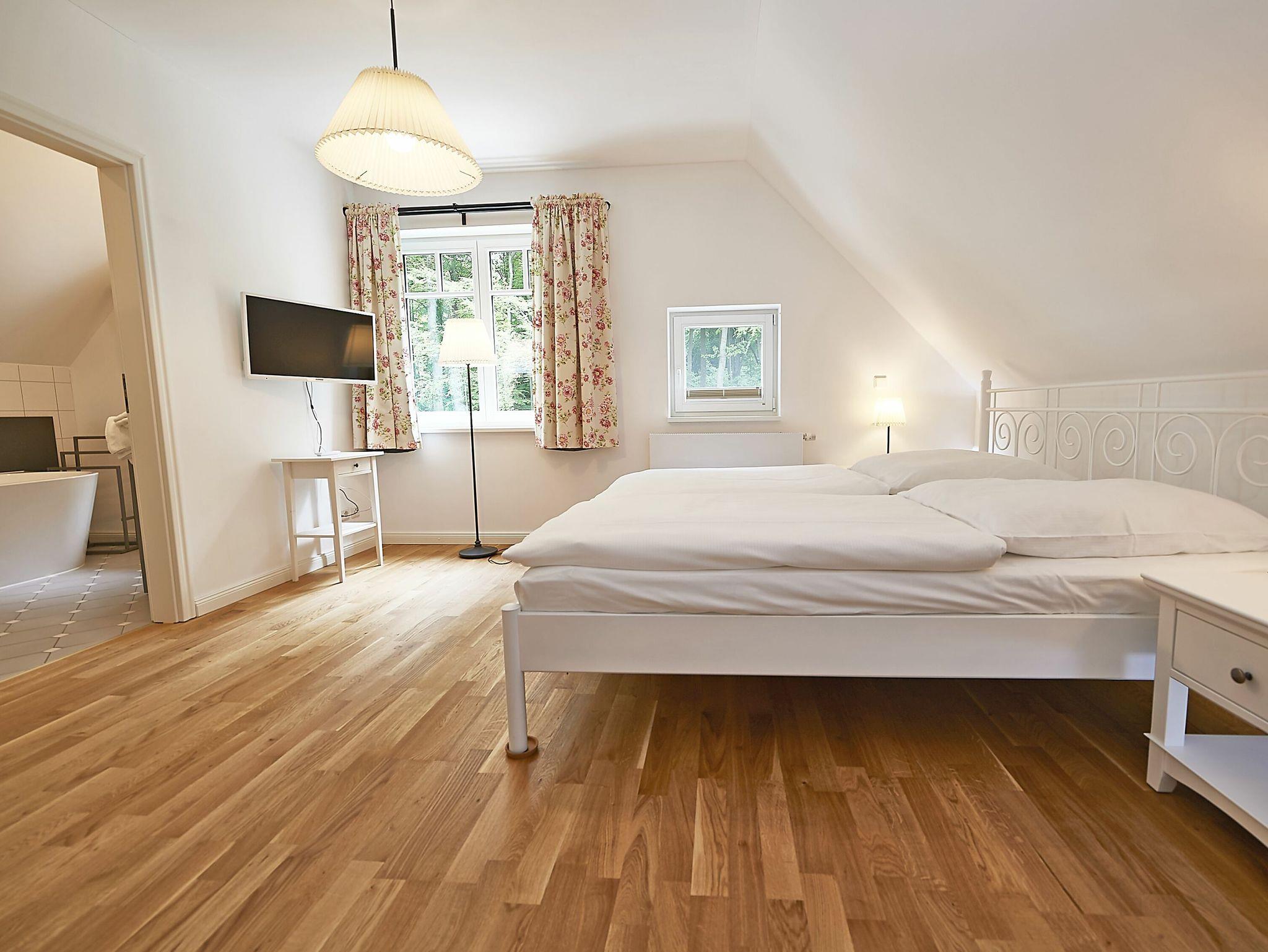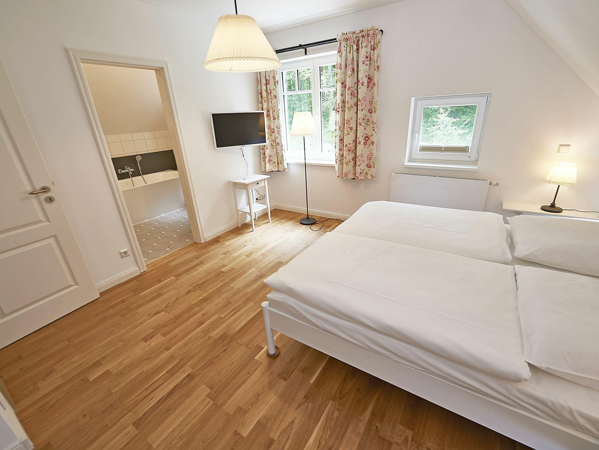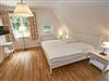 Im Dachgeschoss sind die beiden Schlafzimmer mit je einem großen Doppelbett und je einem separaten Bad untergebracht. Beide Bäder verfügen über eine Dusche und ein Bad zusätzlich über eine Badewanne. Der Fußboden ist mit einem Eichenparkett belegt. Die Heizung erfolgt über Wandheizkörper, welche sich individuell regeln lassen.