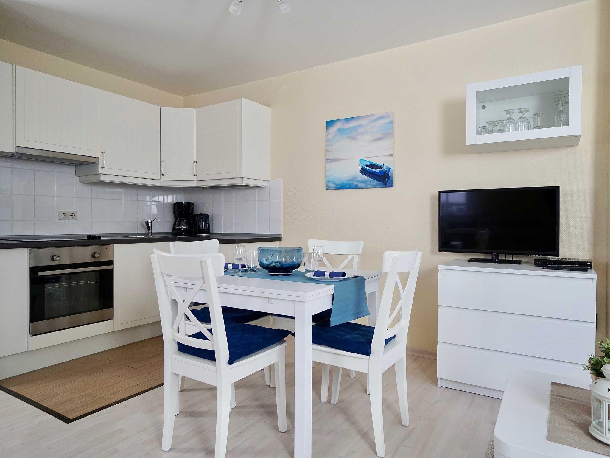 Das komfortable Ferienappartement bietet auf 44 m² Platz für 4 Personen. Gemütliche Schlafplätze bieten in dieser Wohnung ein Doppelbett und ein Schlafsofa, das für 2 Personen aufgebettet werden kann. Beides befindet sich im Wohn- und Essbereich des Appartements mit integriertem Wintergarten, der Ihnen mit dem bequemen Lesesessel Platz zur Entspannung bietet. In diesem Raum finden Sie ebenfalls eine Küchenzeile, die Ihnen im modernen Landhausstil allen Komfort bietet, den Sie im Urlaub zum Kochen benötigen. Neben einem Wasserkocher und einer Kaffeemaschine stehen Ihnen auch ein Backofen sowie ein Cerankochfeld zur Verfügung. Der WLAN-Zugang und ein SodaStream steht Ihnen kostenfrei zur Verfügung. Ein modernes Tageslicht-Badezimmer mit WC und Dusche mit Fön ist ebenfalls vorhanden. Ein Kinderbett (bis zwei Jahre) kann bei Bedarf bereitgestellt werden.