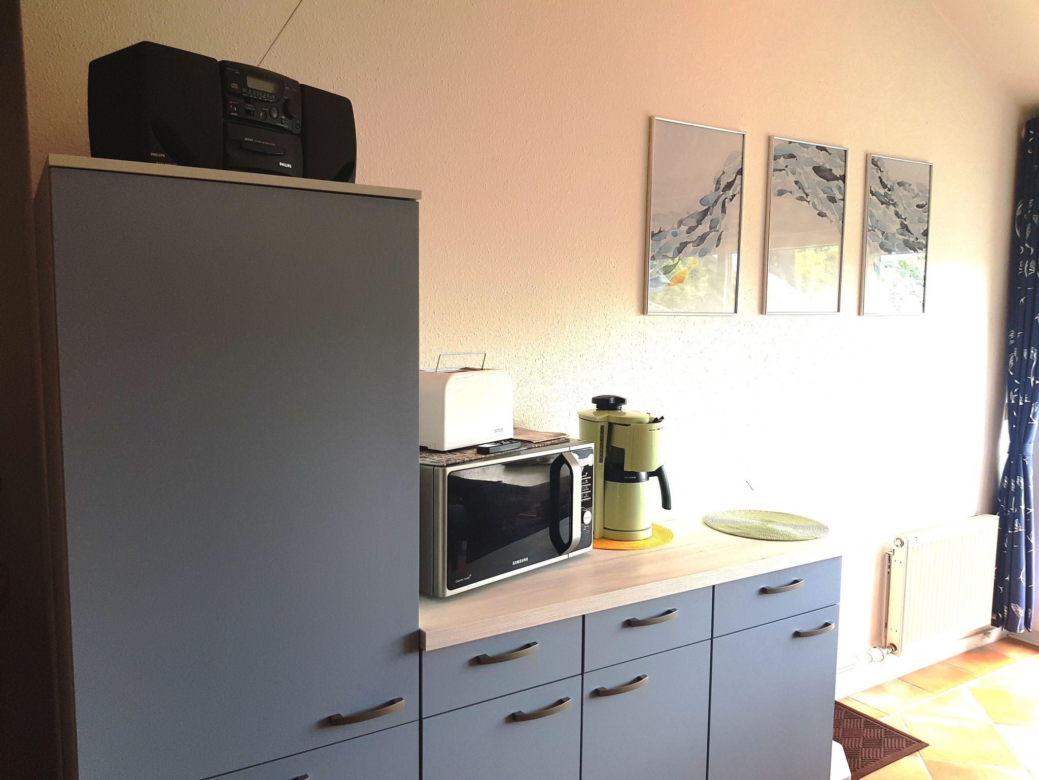 Die Küchenzeile ist komplett ausgestattet mit Mikrowelle, Geschirrspüler und Kühlschrank mit Gefrierfach. Alle nötigen Küchenutensilien, sowie ausreichend Besteck sind vorhanden. WLAN und Telefon ins deutsche Festnetz sind kostenlos.