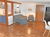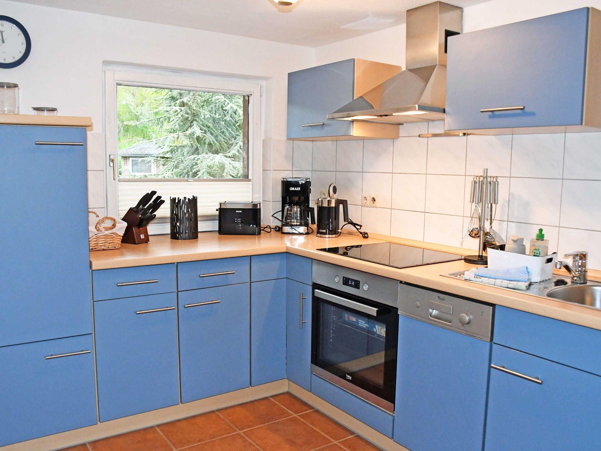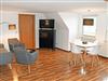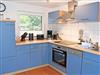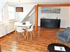 Über einen Flur kommen Sie in den Wohnraum. Hier stehen eine Couch, ein Tisch mit Sesseln und ein modernes Flachbild-TV-Gerät. Die Küchenzeile im Wohnbereich, ist mit Elektroherd mit Ceranfeld, Backofen, Kühlschrank mit Gefrierfach, Kaffeemaschine, Wasserkocher, Toaster komplett ausgestattet. Hier steht auch ein Esstisch mit Stühlen.