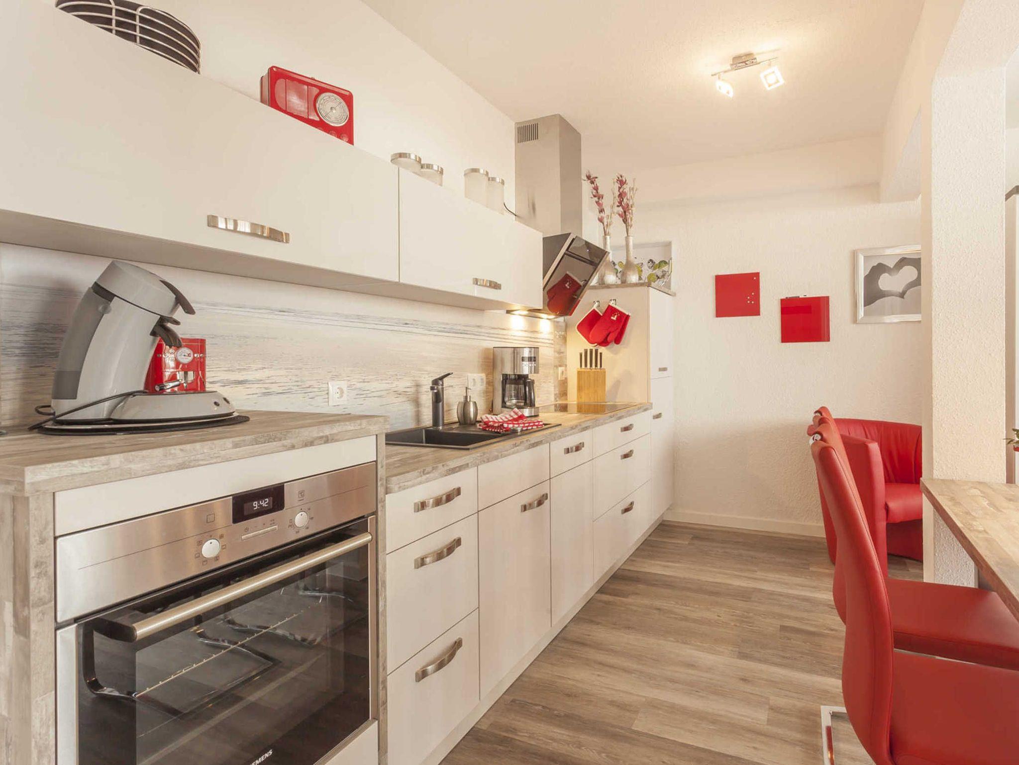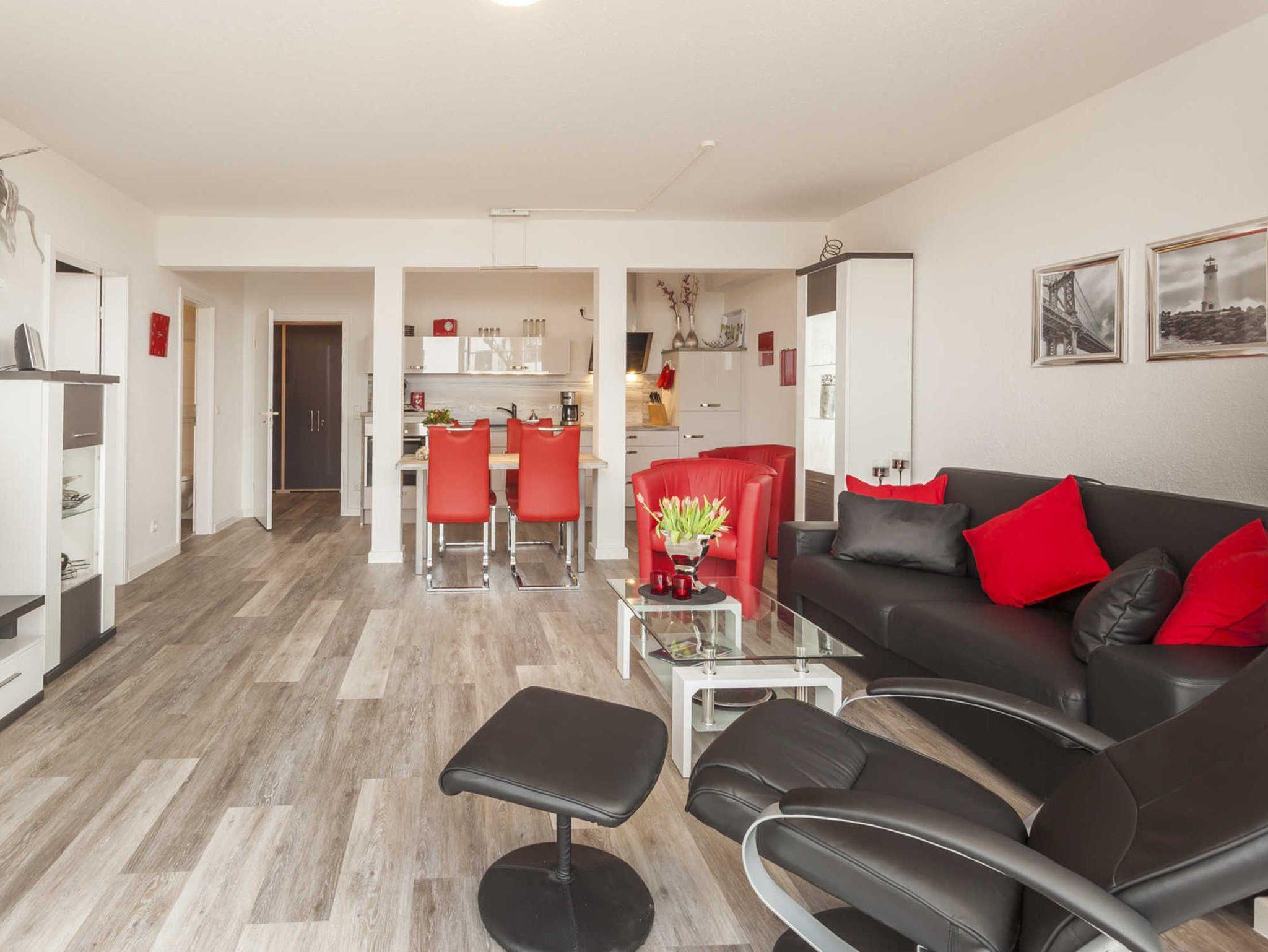 Die Ferienwohnung bietet ein geräumiges Wohnzimmer mit offener Küche, in der sich alles findet was man benötigt. Im Wohnzimmer befindet sich ein Schlafsofa, welches 2 Personen Platz bietet.