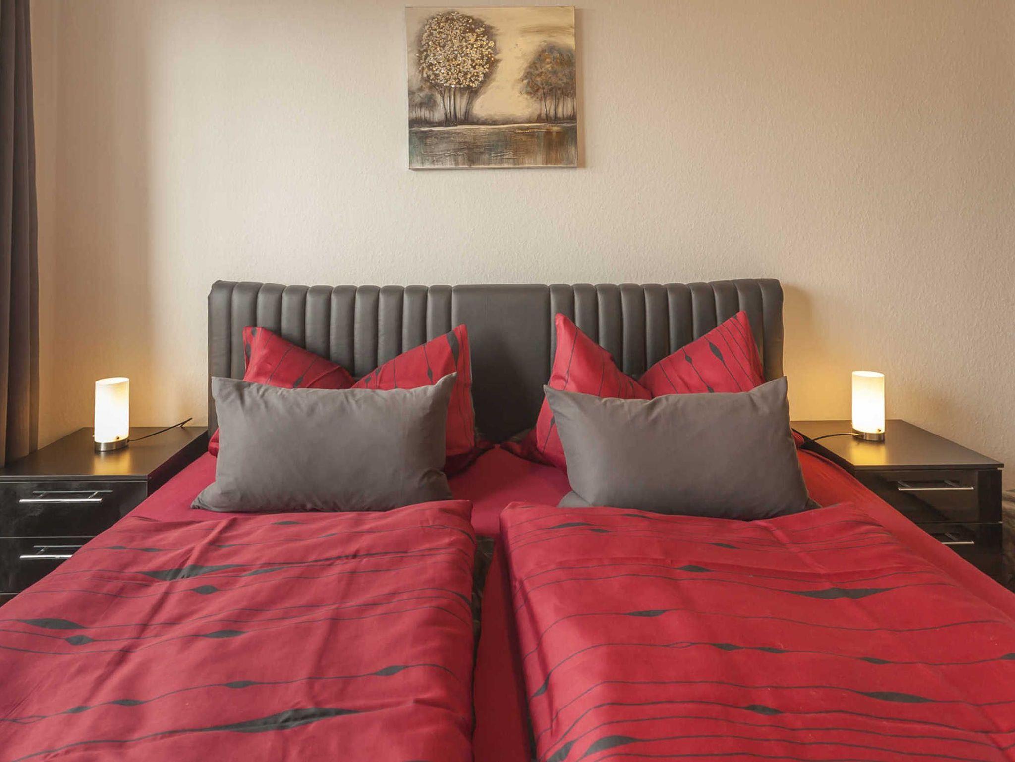 Das Schlafzimmer besteht aus einem Doppelbett mit Nachtischkonsolen, Kleiderschrank und TV-Gerät.