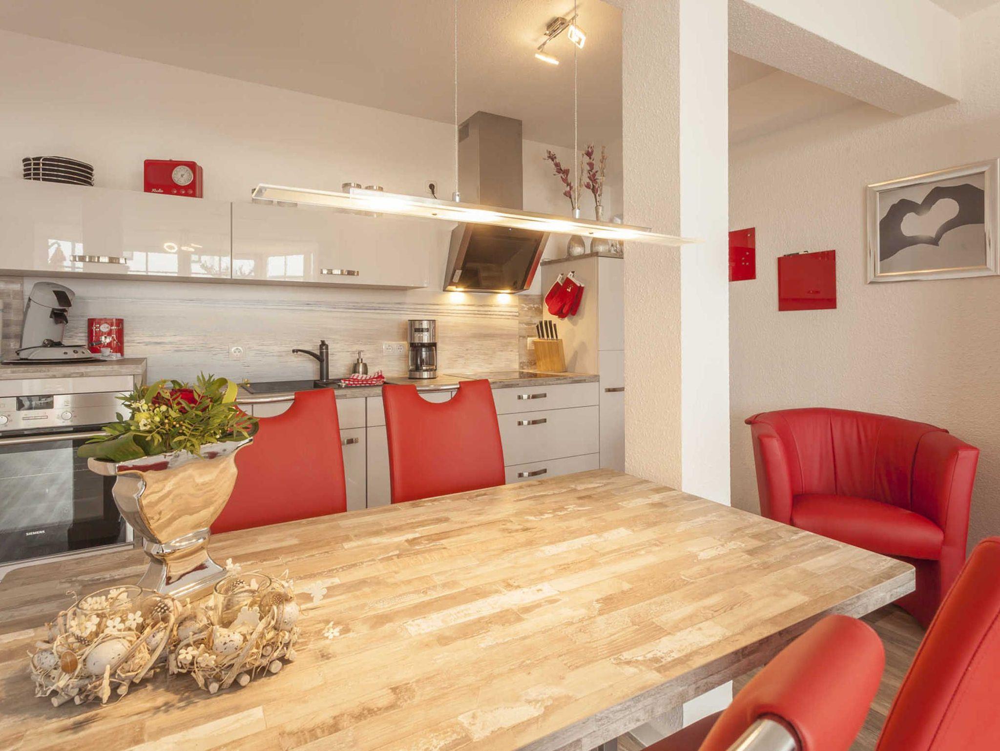 Ein Esstisch für 4 Personen ist ebenfalls vorhanden. Des Weiteren finden Sie in der Küche eine Senso, einen Toaster und einen Wasserkocher.