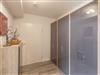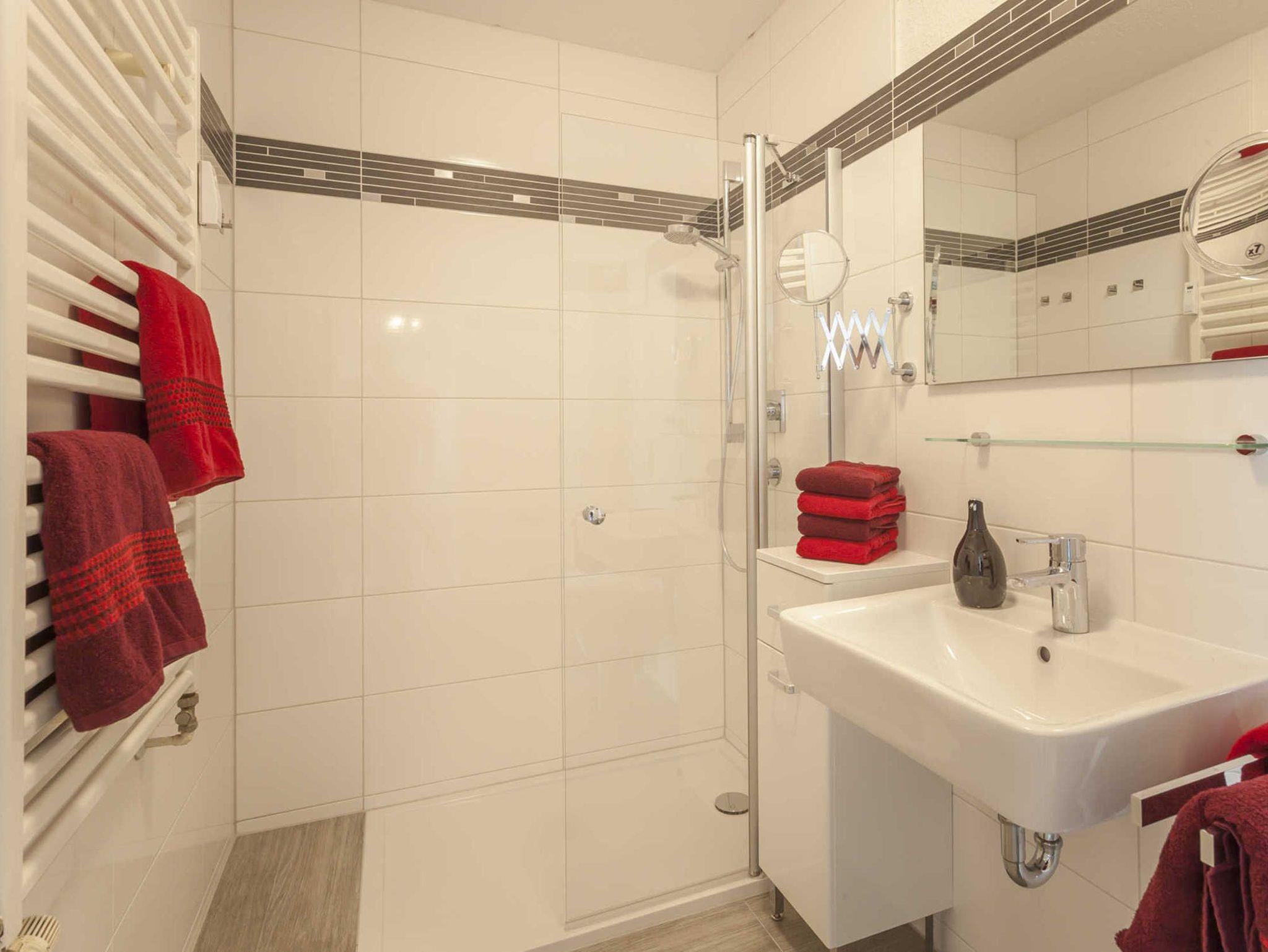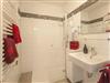 Das Badezimmer verfügt über eine Dusche mit WC und Waschtisch.