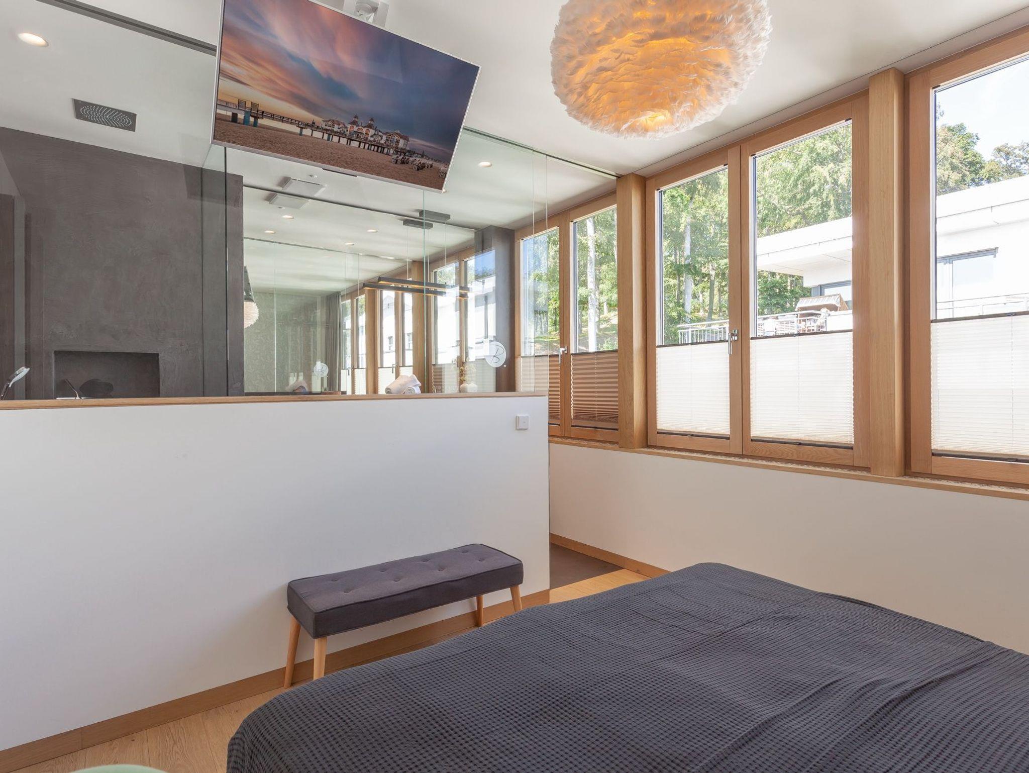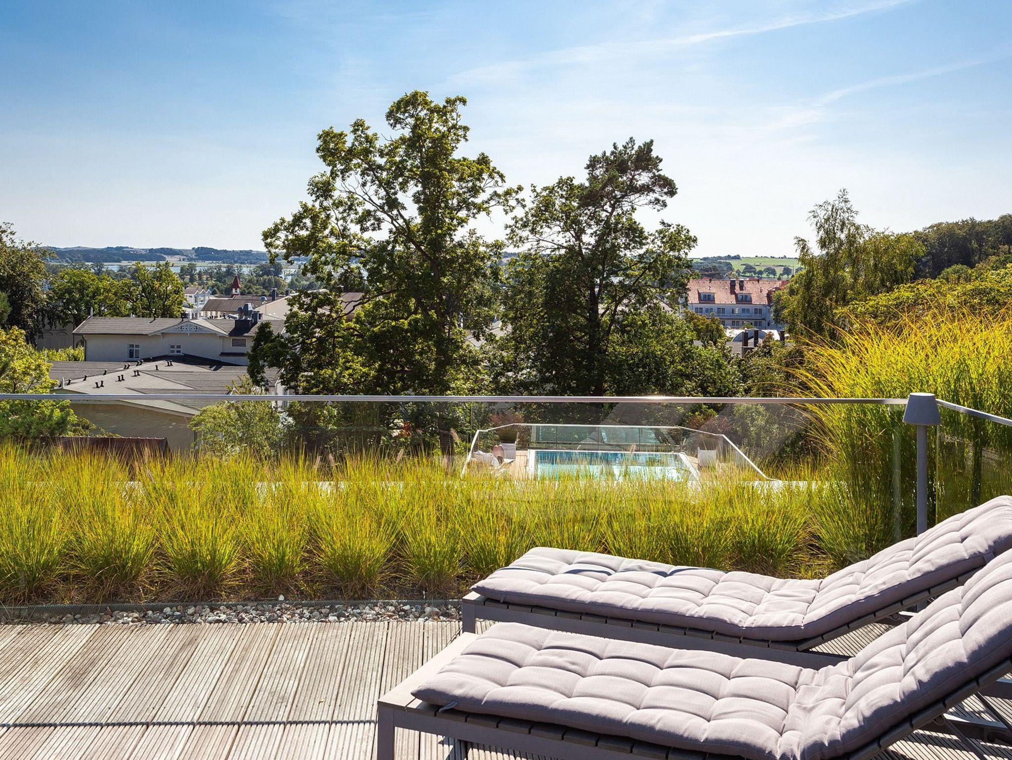 Das Penthouse unter dem Dach der Villa Baltic im Ostseebad Sellin bietet Ihnen und Ihrer Familie auf 150 Quadratmetern Wohnfläche und drei Etagen ein Urlaubsambiente der Extraklasse. Schon auf den ersten Blick begeistern die hochwertigen, perfekt aufeinander abgestimmten Möbel und das überaus harmonische Farbkonzept. Bodentiefe Fenster unterstreichen den von gebeizter Eiche, edlem Glas und poliertem Beton geprägten Loft-Charakter Ihres Urlaubsdomizils. Eine Treppe führt hinauf und man kann es kaum erwarten, in einem der bequemen Lounge-Sessel auf der stolzen 60 Quadratmeter großen und von Dünengras gesäumten Dachterrasse Platz zu nehmen, um die Sonne und den weiten Ausblick über Sellin und den Selliner See bis zu den sanften Hügeln des Umlandes zu genießen. Ja, so lässt es sich leben! Und bis zum Hauptstrand mit der berühmten Seebrücke sind es über die Wilhelmstraße nur rund 150 Meter Fußweg - besser geht es kaum.