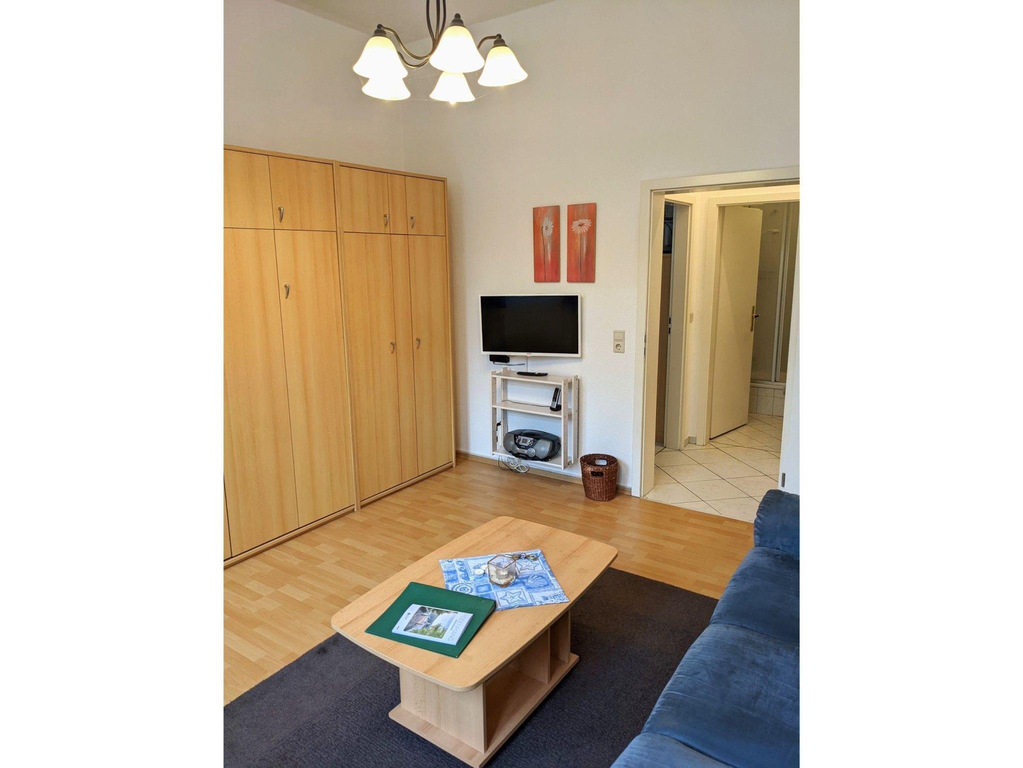 • kombiniertes Wohn-/Schlafzimmer mit Schrankbett, Couch sowie Flachbild-TV