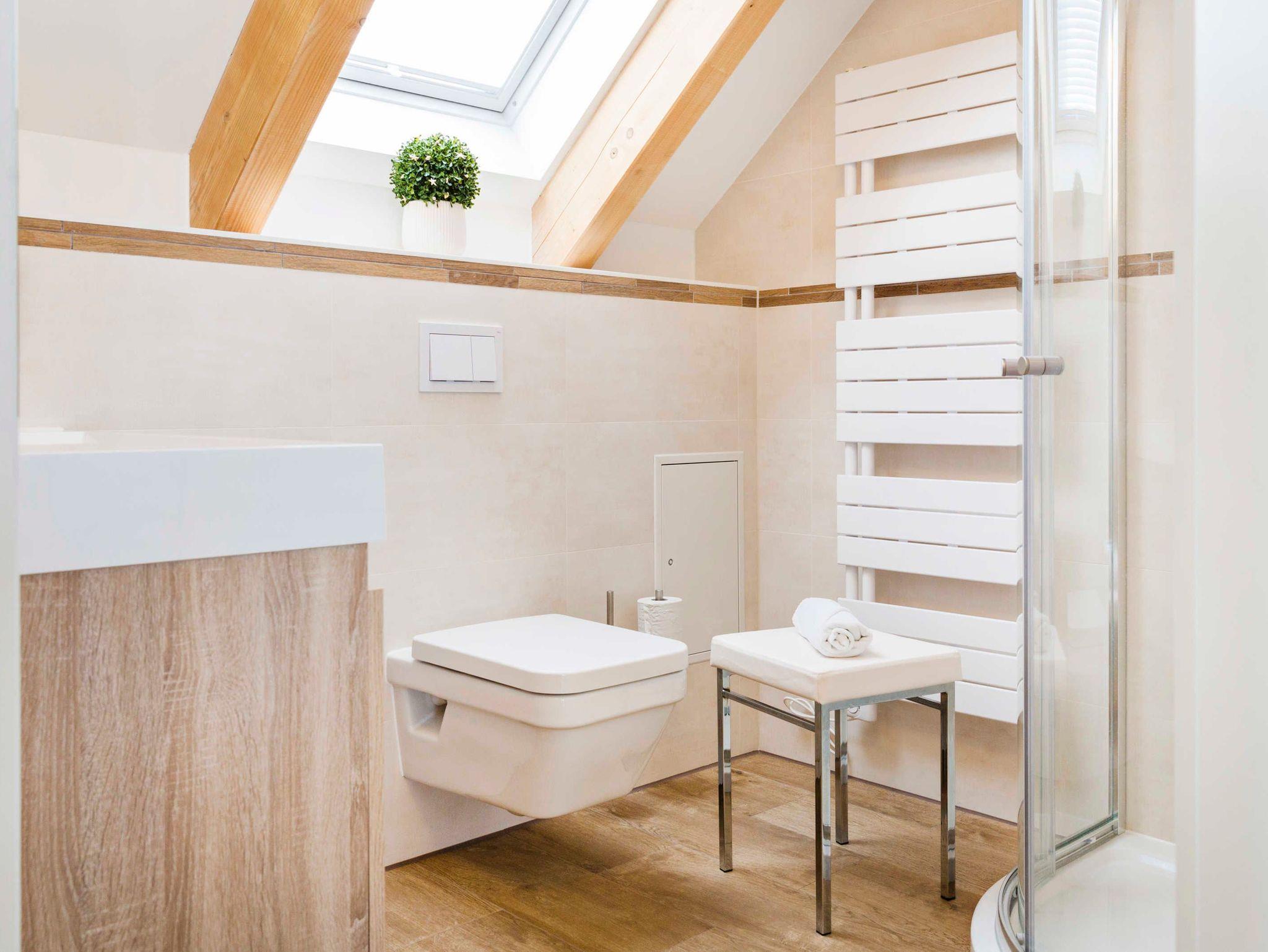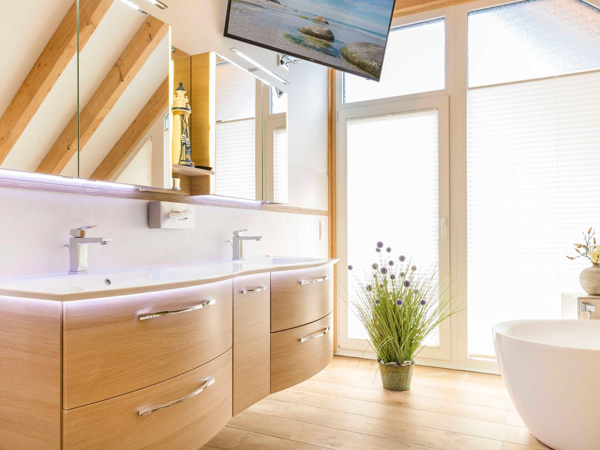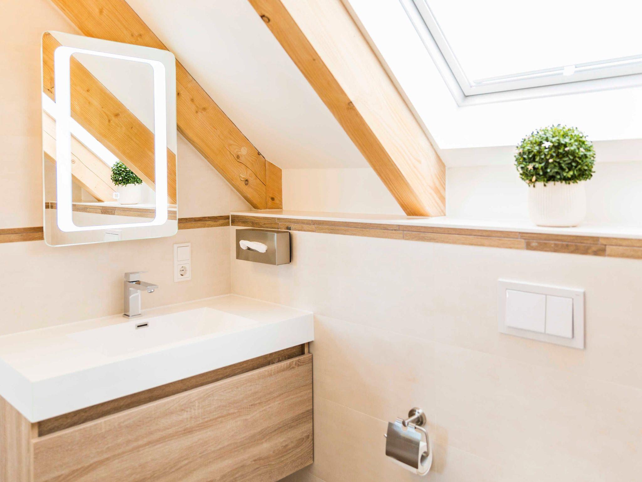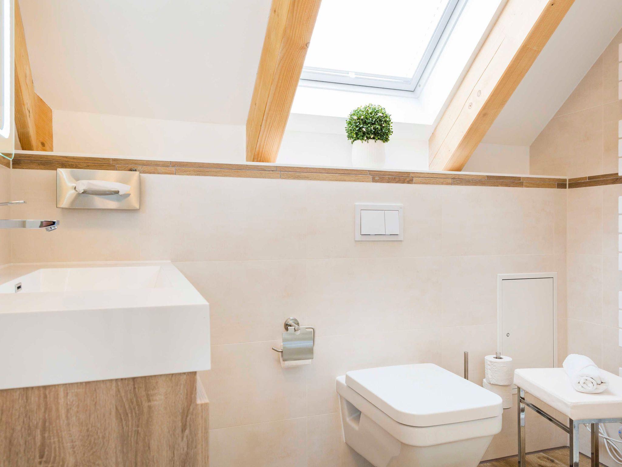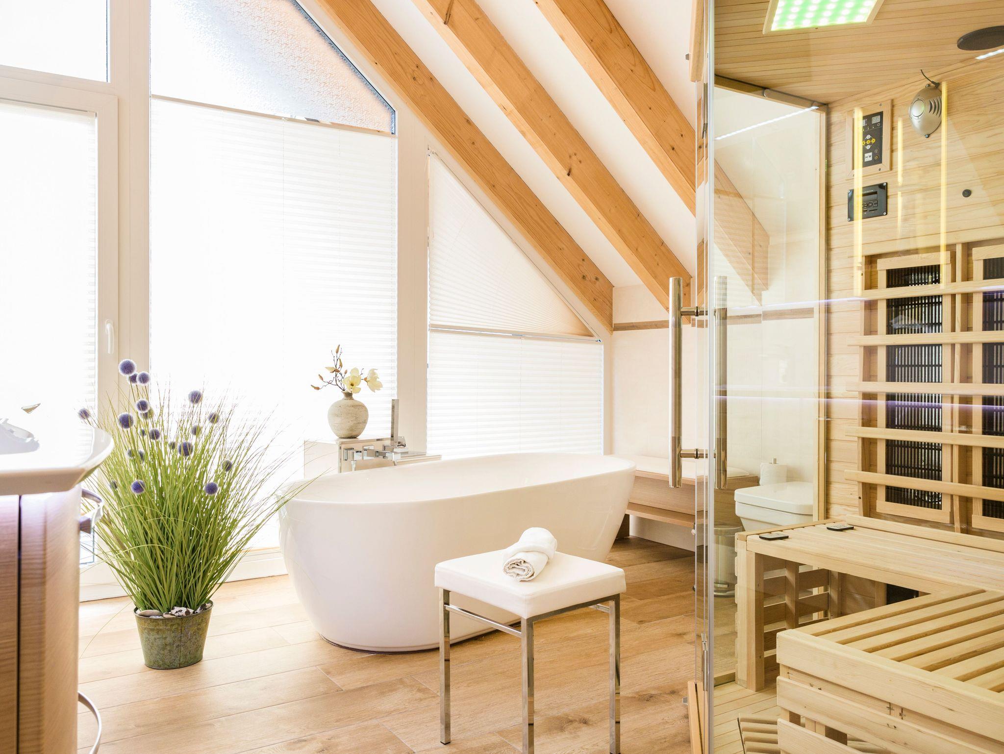 Die Wohnung bietet Ihnen 2 Badezimmer und ein zusätzliches WC. Das große Badezimmer ist mit einer freistehenden Badewanne, einem doppelten Waschtisch mit Spiegelschrank sowie einer Walk-In Dusche mit zusätzlicher Regendusche ausgestattet. Wer etwas länger in der tollen Badewanne zur Ruhe kommen möchte, freut sich sicher auch über den dort vorhandenen 55 Zoll Flachbild-Smart-TV (4K). Ein besonderes Highlight ist die Vollspektrum-Infrarotkabine mit Glasfront.