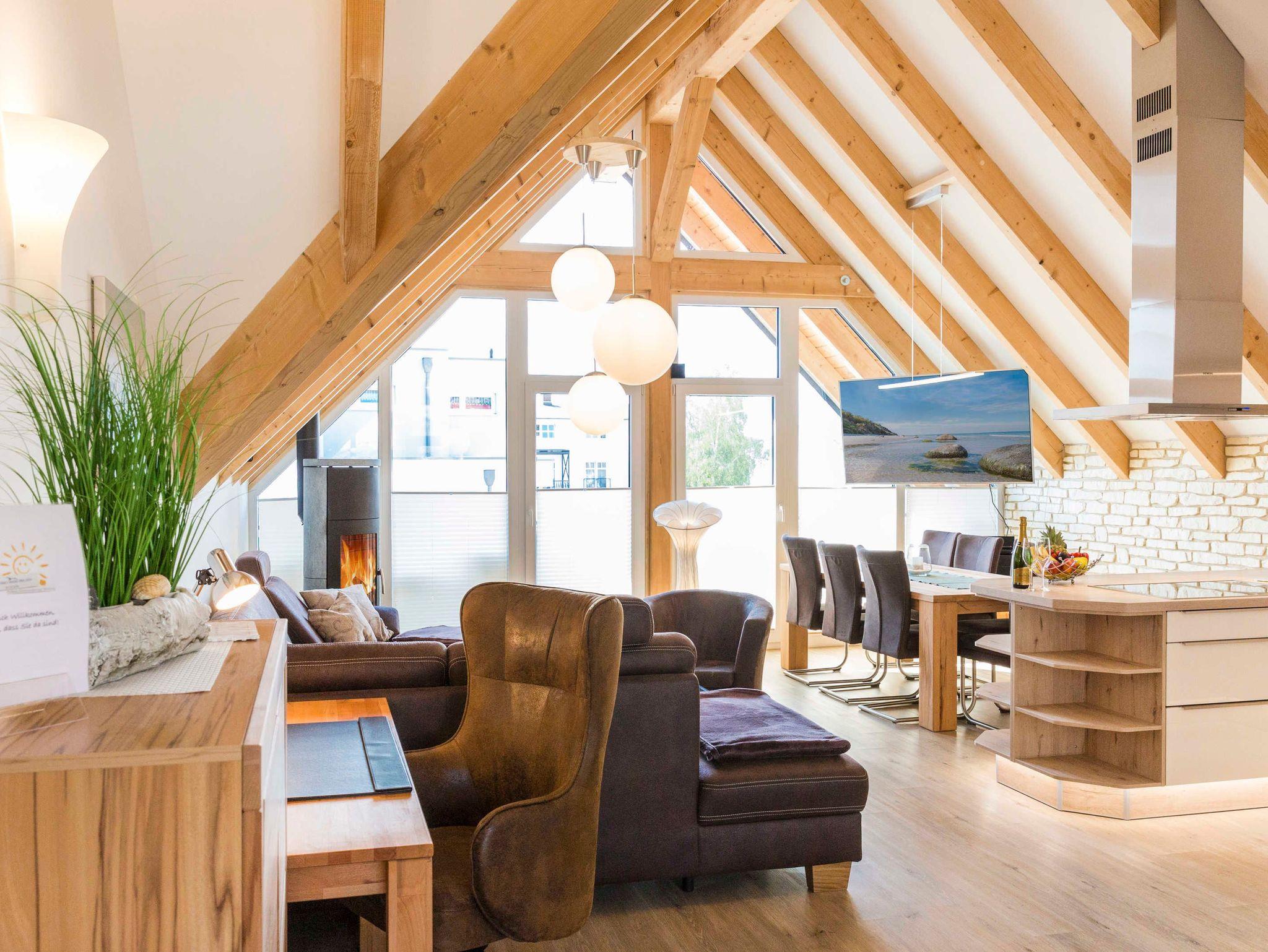 Die Ferienwohnung Möwenglück im Obergeschoss ist durch ihre drei Glasgiebel lichtdurchflutet und beeindruckt durch ihre großzügige, offene Bauweise. Sie ist über eine Außentreppe erreichbar. Die 3 Balkone sind nach Osten, Süden und Westen ausgerichtet.