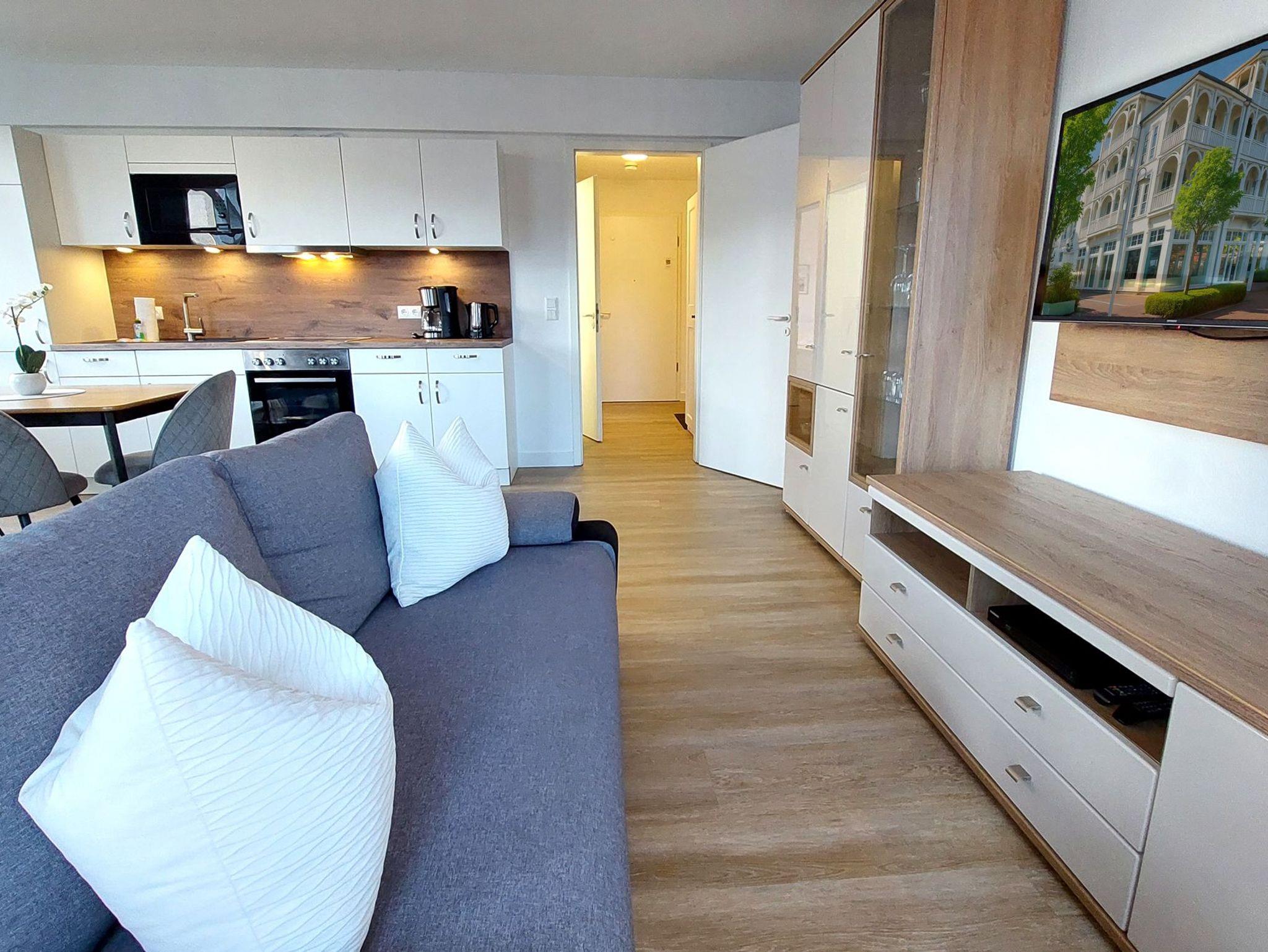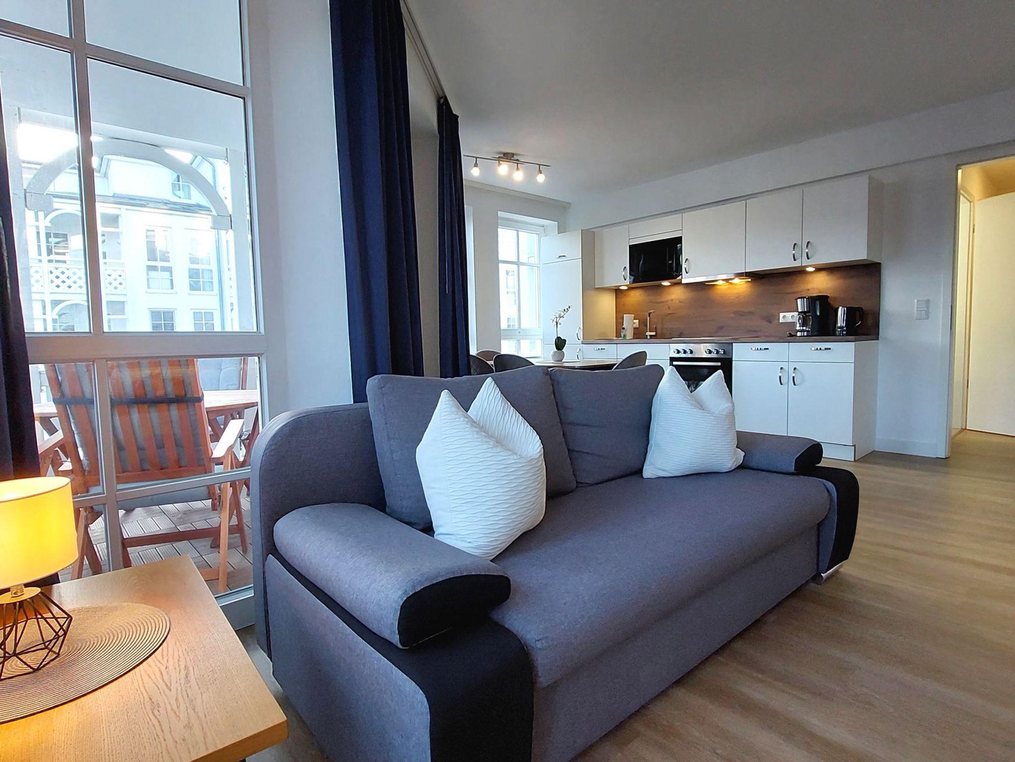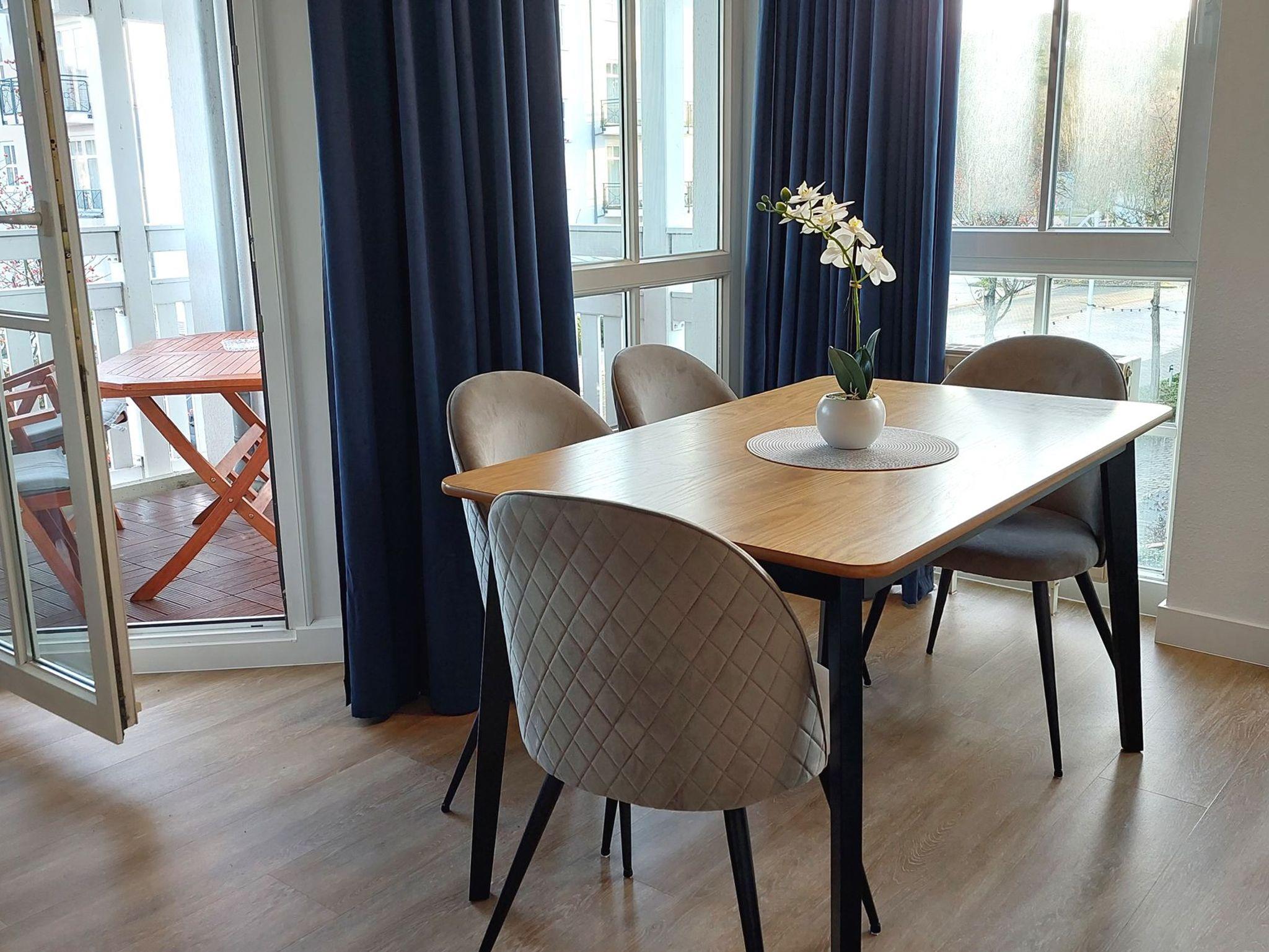 Das Wohn- und Esszimmer ist das Zentrum der Wohnung und verfügt über eine ausklappbare Sofalandschaft, die zum Entspannen einlädt. Für Unterhaltung bei jeder Wetterlage sorgen ein Smart-TV mit Blu-ray-Player, ein Radio mit CD-Player und eine kostenfreie WLAN-Verbindung. Der Essbereich bietet Platz für 4 Personen und es gibt Zugang zum möblierten und überdachten Eckbalkon in Richtung Nordosten. Die moderne Einbauküche ist komplett ausgestattet mit unter anderem einem Geschirrspüler, einem Kühlschrank, einer Mikrowelle, einem Cerankochfeld, einem Toaster, einer Kaffeemaschine und einem Wasserkocher.