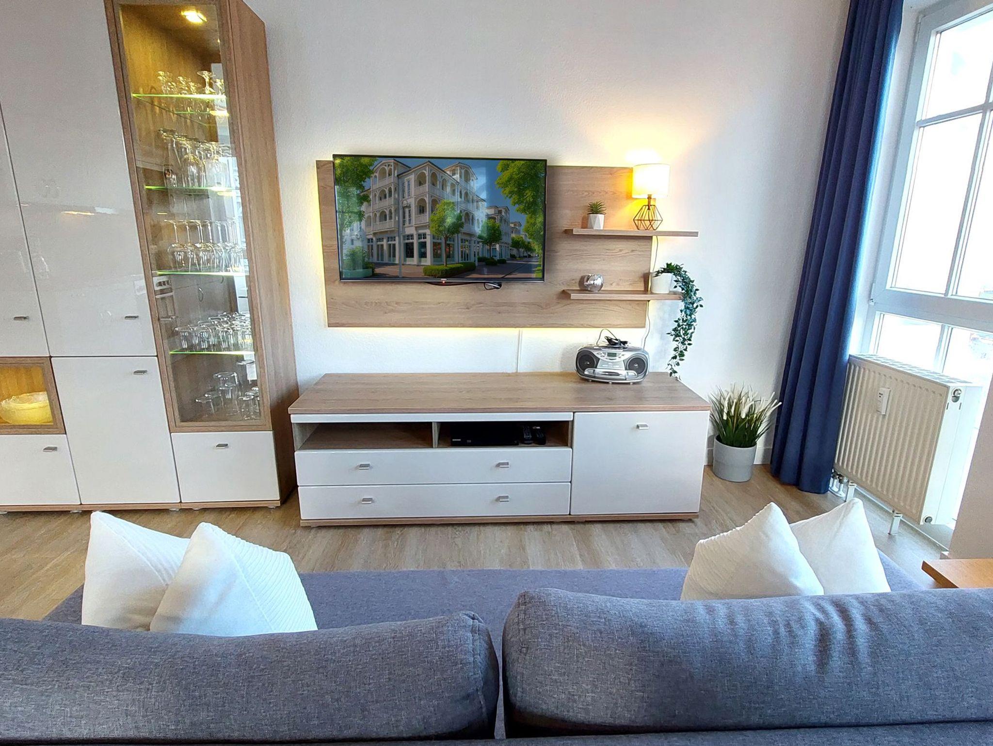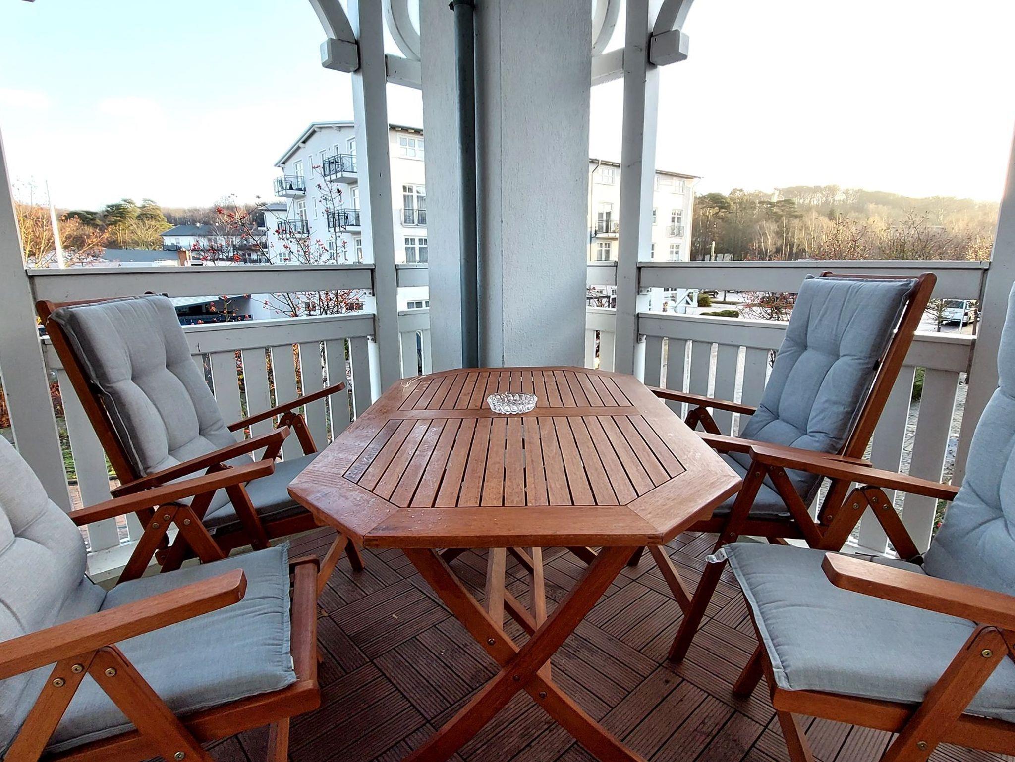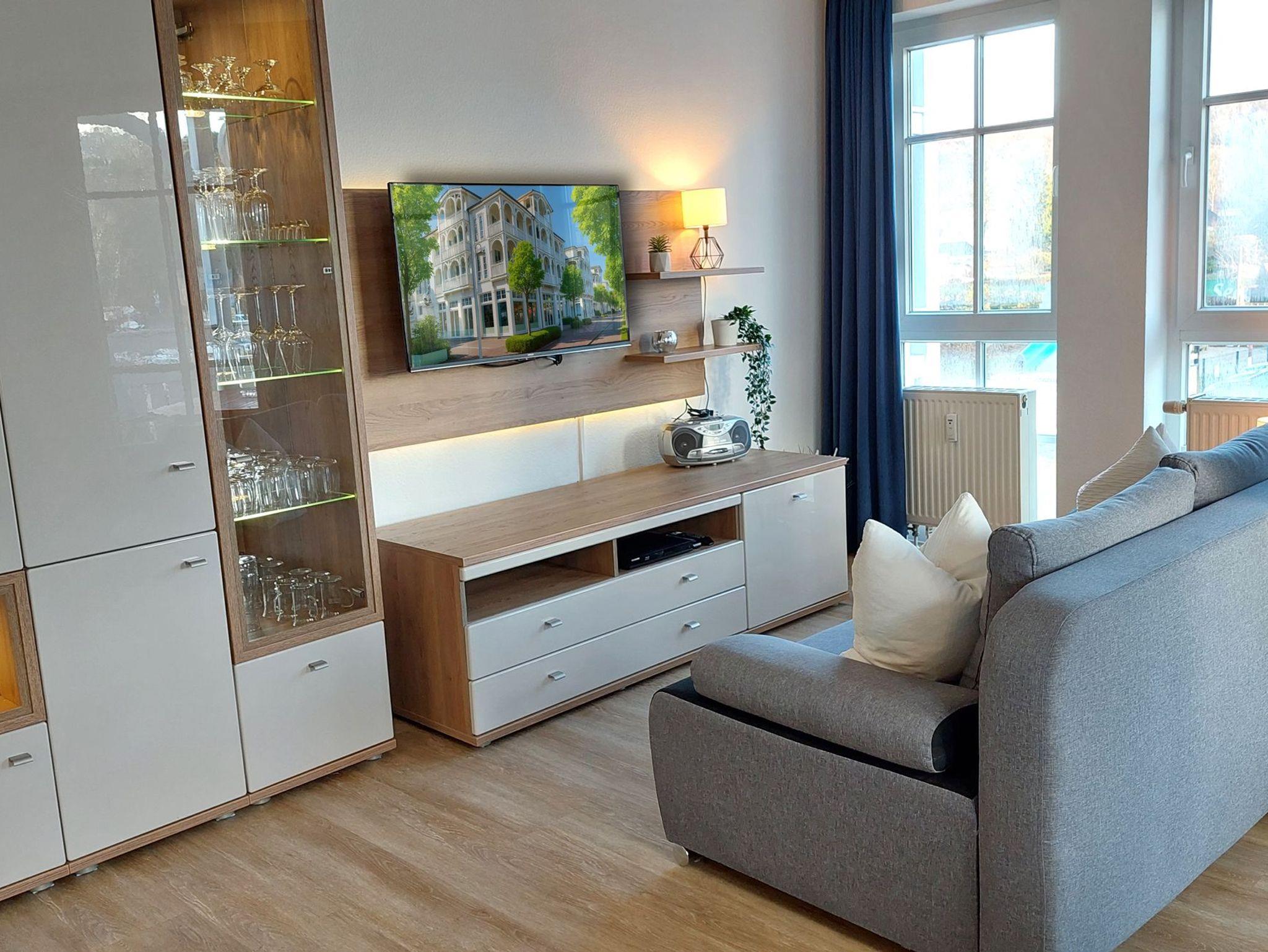 Das Wohn- und Esszimmer ist das Zentrum der Wohnung und verfügt über eine ausklappbare Sofalandschaft, die zum Entspannen einlädt. Für Unterhaltung bei jeder Wetterlage sorgen ein Smart-TV mit Blu-ray-Player, ein Radio mit CD-Player und eine kostenfreie WLAN-Verbindung. Der Essbereich bietet Platz für 4 Personen und es gibt Zugang zum möblierten und überdachten Eckbalkon in Richtung Nordosten. Die moderne Einbauküche ist komplett ausgestattet mit unter anderem einem Geschirrspüler, einem Kühlschrank, einer Mikrowelle, einem Cerankochfeld, einem Toaster, einer Kaffeemaschine und einem Wasserkocher.