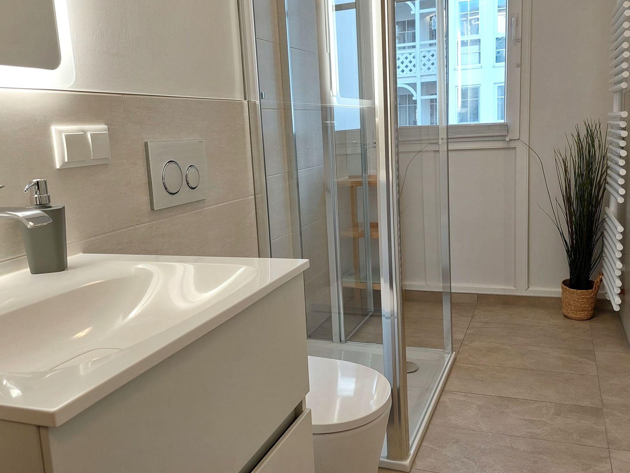 In der Nähe der Wohnung gibt es Einkaufsmöglichkeiten, einen Münz-Waschsalon, einen Spielplatz und ein Spaßbad. Auch die Anbindung zum Rasenden Roland und zum öffentlichen Nahverkehr ist gut.