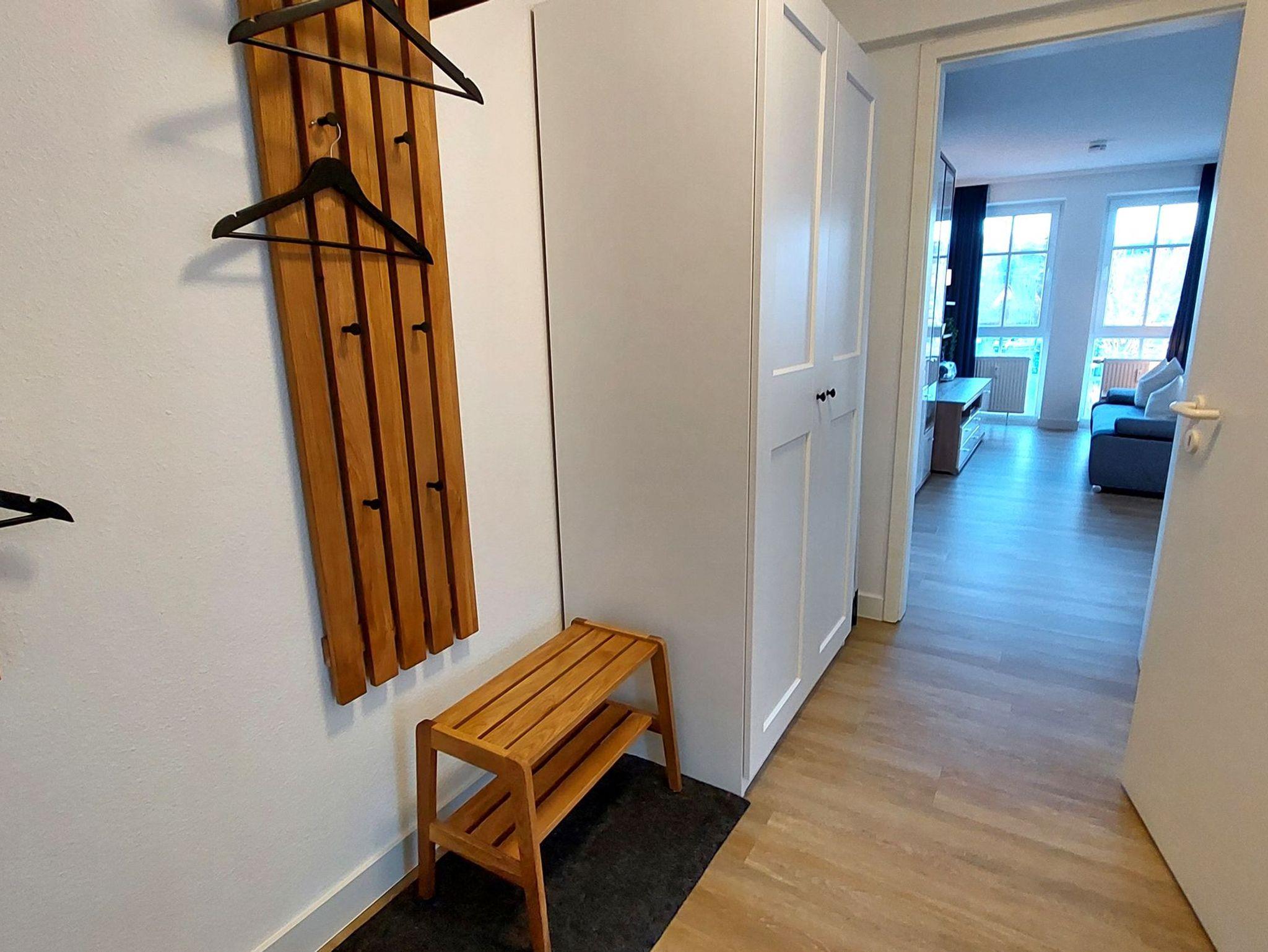 Die Nichtraucher-Wohnung mit der Bezeichnung 60RB463 befindet sich im ersten Stock des Hauses Altensien. Sie ist 50 Quadratmeter groß und bietet Platz für bis zu 4 Personen. Der Flur führt zu verschiedenen Räumen, wie dem Schlafzimmer, dem Badezimmer und dem großen, hellen Wohnbereich. Das moderne Tageslichtbad ist mit einer fast ebenerdigen Dusche, einem Waschtisch, einem WC und einem Fön ausgestattet. Im Schlafzimmer gibt es ein Doppelbett mit Nachttischen und einen großen Kleiderschrank. Außerdem gibt es einen schmalen separaten Balkon.