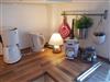 • Wohnzimmer mit Doppelcouch. Geräumige Eßecke, Küchenzeile mit Ceranherd, Mikrowelle, Kühhlschrank, Tiefkühlfach, Kaffeemaschine, Toaster, Wasserkocher, reichlich Geschirr und Gläser