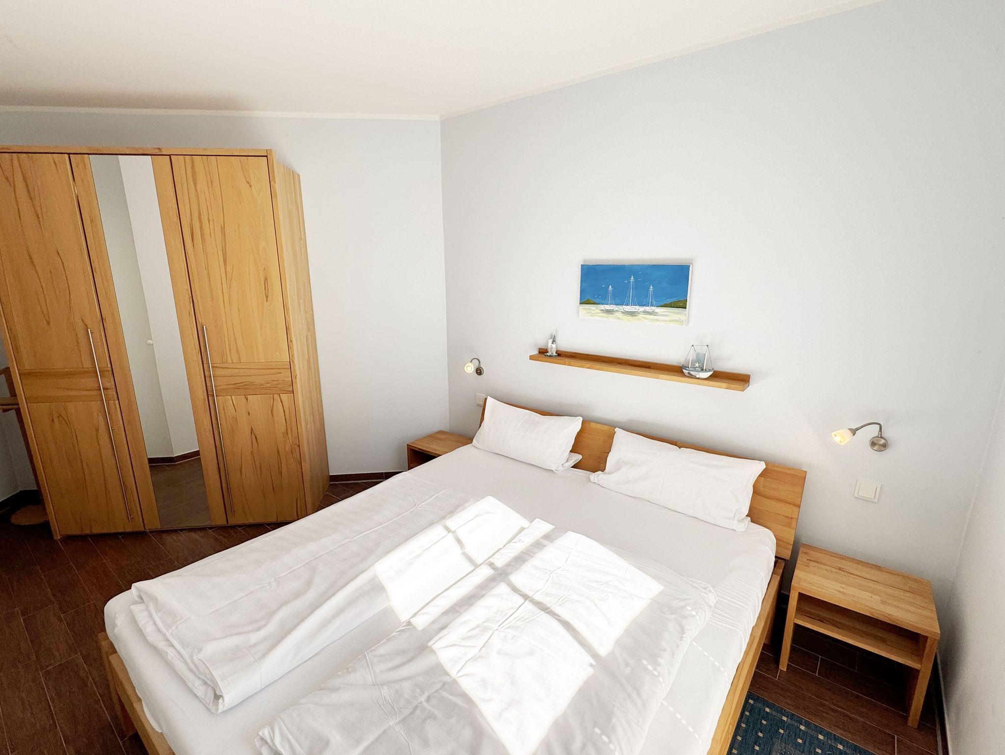 Die modern und gemütlich eingerichtete 3-Raumwohnung Nr. 01 (Nichtraucherwohnung) befindet sich im Erdgeschoss und umfasst eine Wohnfläche von ca. 70 qm und bietet ausreichend Platz für 2 bis 5 Erwachsene. Alle Fenster sind zur Verdunkelung mit Rollladen versehen. Der Wohnbereich ist mit einem Ledersofa mit integriertem Vollbett (Liegefläche 1,50m x 2,00m), 2 Sesseln, Smart-TV, Heimkinoanlage und einer Küchenzeile ausgestattet. Die Küchenzeile ist komplett eingerichtet und beinhaltet Ceranfeld, Backofen, Geschirrspüler, Mikrowelle, Kühlschrank mit Gefrierfach und diversen Küchenutensilien. Ein Essplatz mit einem Tisch und 5 Stühlen ist vorhanden. Das Bad verfügt über eine Dusche (90cm x 90cm), WC, Waschbecken, Kosmetikspiegel, Handtuchtrockner und einem Haar Fön. Ein Gäste-WC mit Waschbecken rundet den Sanitärbereich ab. Die beiden Schlafzimmer bestehen jeweils aus einem Doppelbett (2 x 0,90 m x 2,00m), verstellbare Lattenroste mit Nachttischkonsolen und einem Kleiderschrank (1,50m breit). In einem der Schlafzimmer befindet sich ein Flachbildschirm. In allen Räumen sorgt eine Fußbodenheizung für angenehme Wärme. Die zu der Wohnung gehörende Terrasse mit Terrassentisch, Korbsesseln mit Auflagen zeigt Richtung Süd/West und lädt bei Sonnenschein zum Verweilen ein. An die Terrasse grenzt ein kleiner mit umlaufenden Sträuchern dicht eingefriedeter Garten zur Alleinbenutzung/Südlage. Ein eigener PKW-Stellplatz (Nr.01) ist für Sie in der hauseigenen Tiefgarage (Einfahrtshöhe 1,90m) vorhanden, sowie eine Fahrradabstellmöglichkeit auf dem Areal und der in der Tiefgarage. Auch im Urlaub brauchen Sie in der Wohnung nicht auf einen Internetanschluss (WLAN/LAN) verzichten. Dieser ist für Sie inklusive! Ein Haustier ist in der Wohnung nicht erlaubt. Die Erstausstattung eines Wäschepaketes (komplette Bettwäsche, 1 Duschhandtuch, 1 kleines Handtuch) können Sie bis 14 Tage vor Anreise gegen einen Aufpreis dazu buchen oder durch eigene ergänzen. Ab 2 gebuchten Paketen erhalten Sie einmalig 1 Geschirrhandtuch und 1 Duschvorleger hinzu.