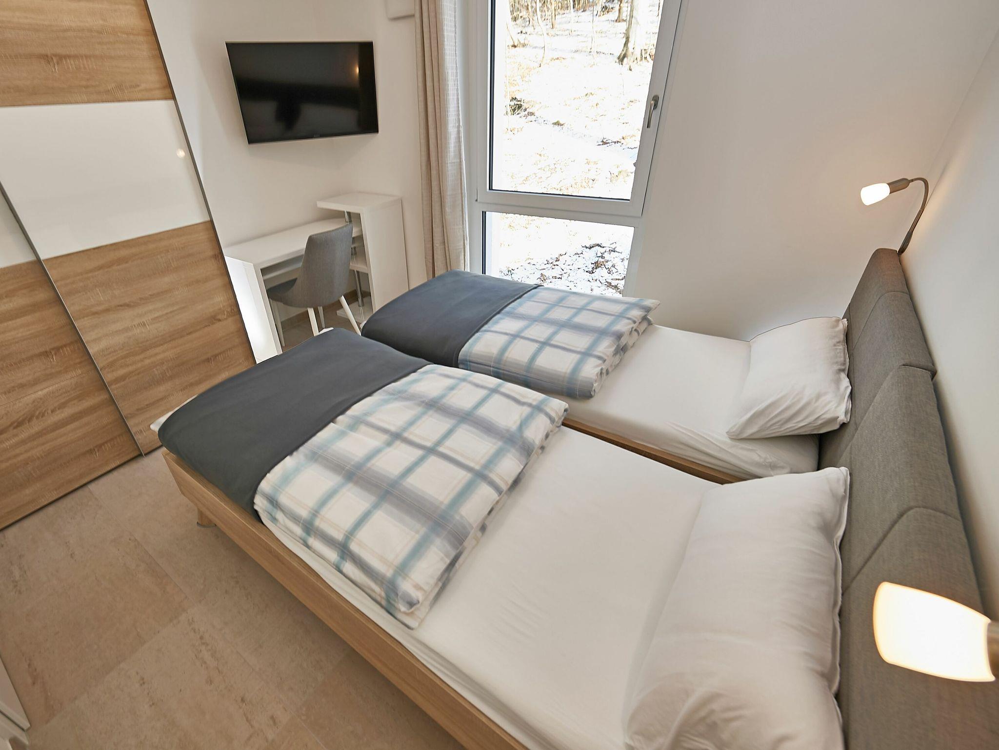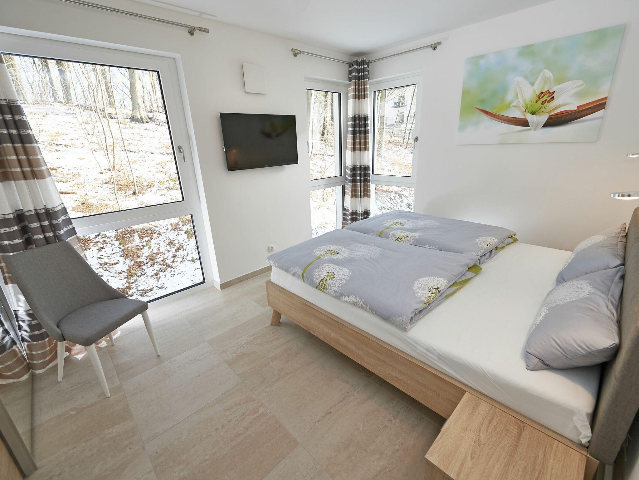 Beide Schlafzimmer verfügen über ein bequemes Doppelbett (1,80m x 2,00m), ausreichend Stauraum für die Urlaubsgarderobe sowie einen extra Fernseher. Der Blick aus den Schlafzimmern fällt direkt in den Buchenwald, wo Sie bei offenen Fenstern das Meer rauschen hören.