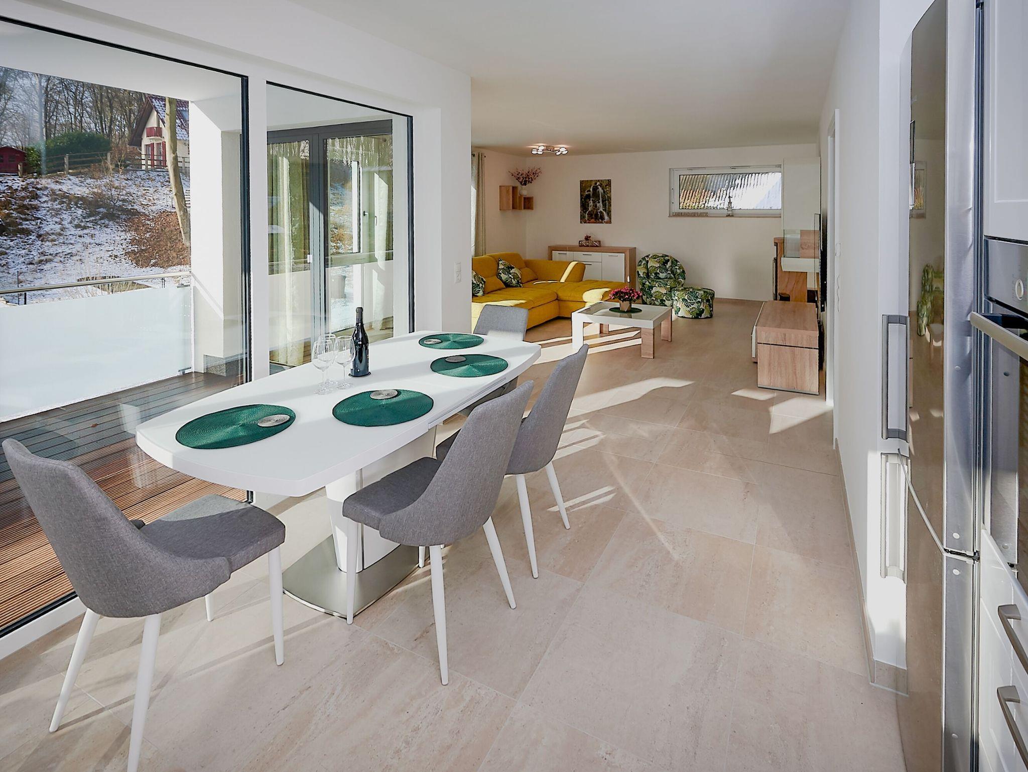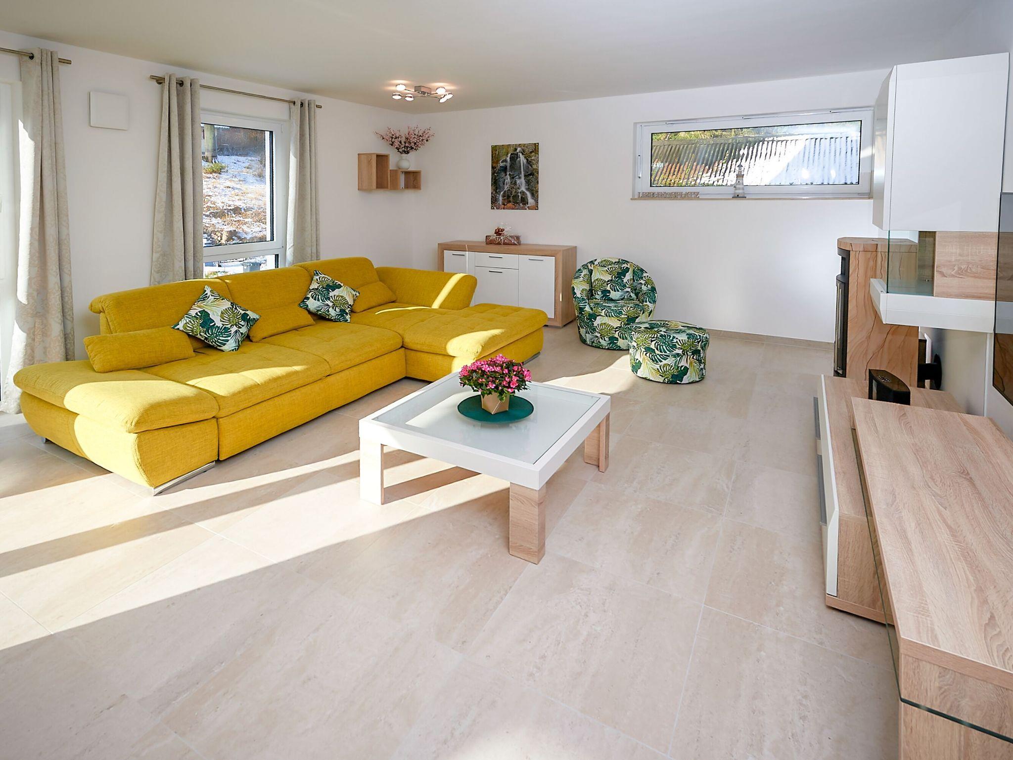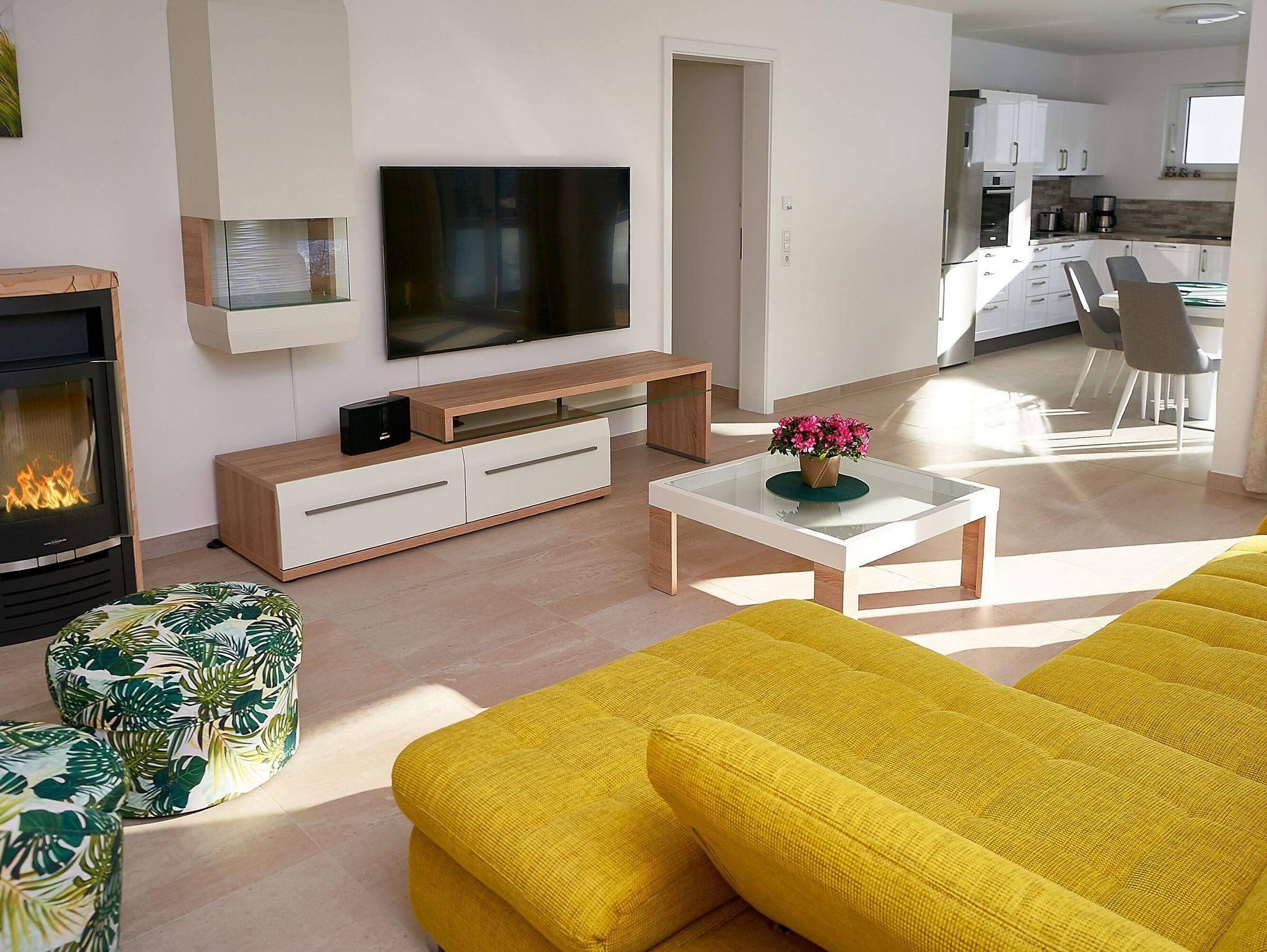 Das Herzstück Ihres Zuhauses auf Zeit ist der großzügige, modern ausgestattete Wohn-Essbereich, der mit einer Größe von ca. 42m² zum Entspannen auf dem gemütlichen Sofa und zum Genießen am großen Esstisch einlädt. Das Sofa kann zum Bett ausgezogen werden und bietet Platz für zwei Personen. Ferner verfügt der Wohnbereich über einen Kaminofen, einen Flachbild-Fernseher und eine BOSE Bluetooth-Soundanlage. W-LAN ist kostenfrei verfügbar.