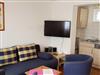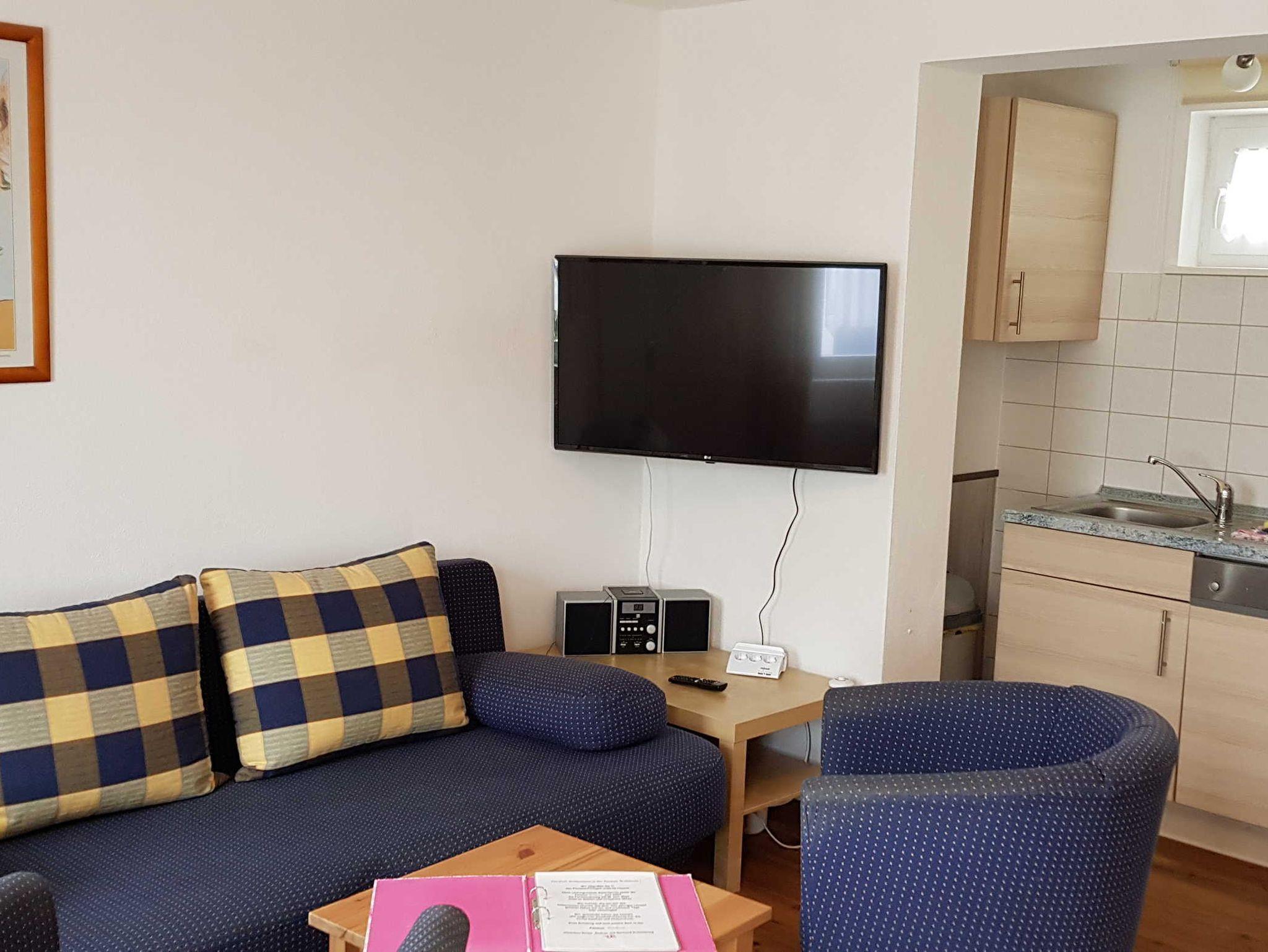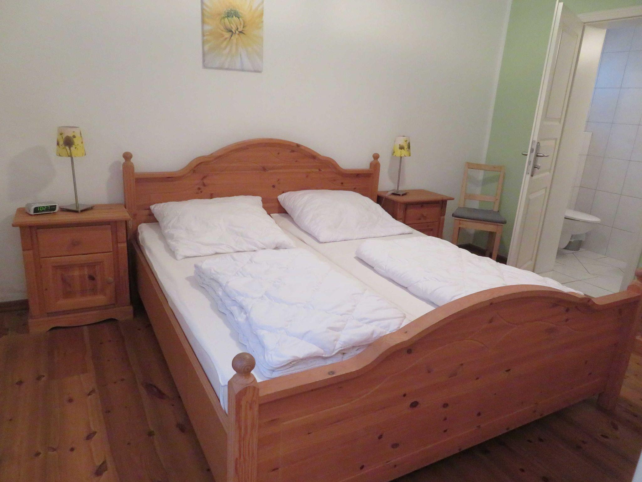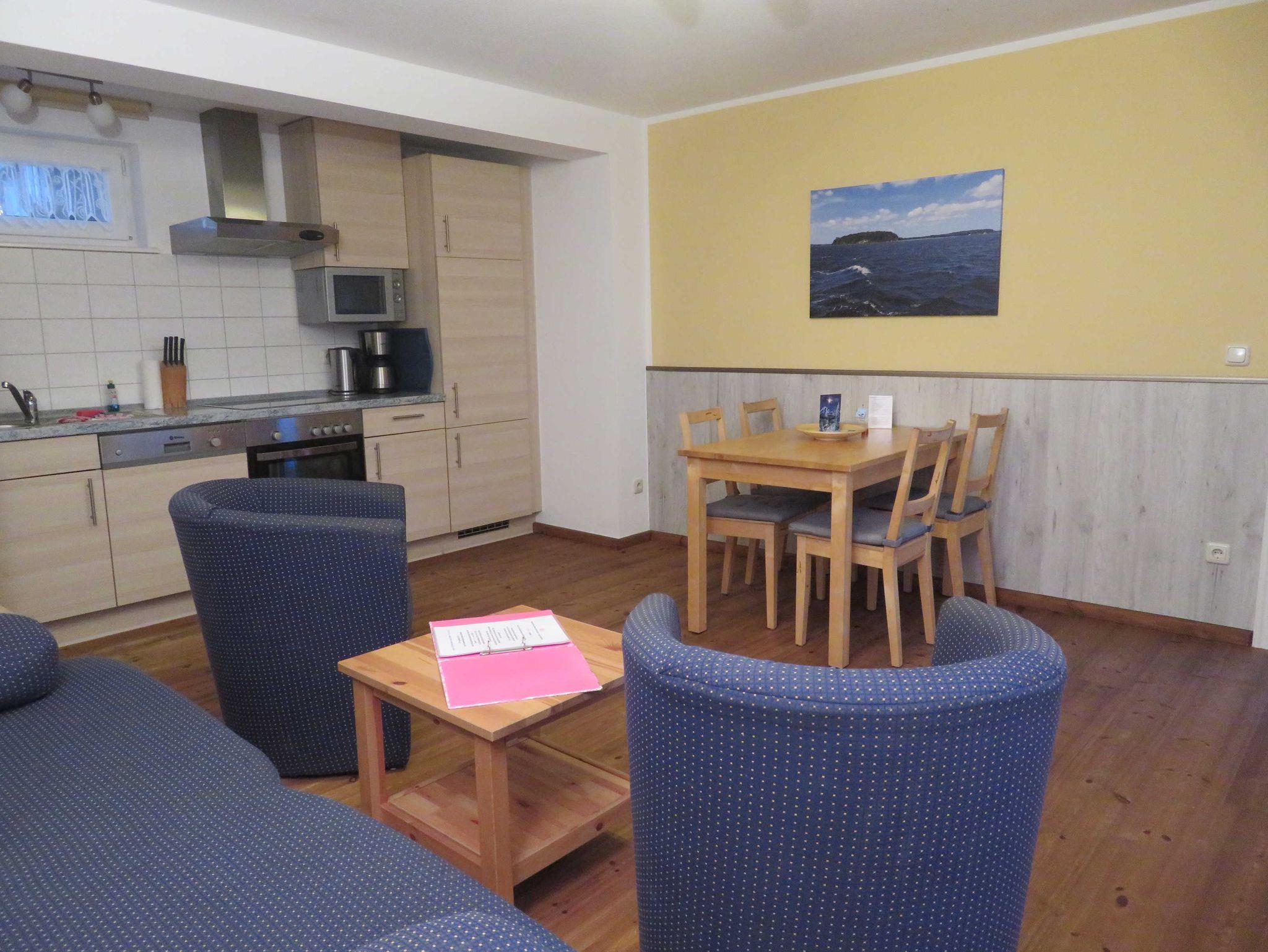 Die 3- Raum- Ferienwohnung hat zwei Schlafzimmer, eins mit einem Doppelbett und eins mit zwei Einzelbetten, und im Wohnzimmer ein Schlafsofa mit zwei weiteren Schlafplätzen. Im Wohnzimmer befindet sich die Küche mit Kühlschrank, Backofen, Geschirrspülmaschine, Mikrowelle, Kaffeemaschine, Toaster und Wasserkocher. Die Ferienwohnung hat zwei Bäder mit Dusche und WC. Sie ist mit Kabel- TV ausgestattet und hat eine eigene Terasse.