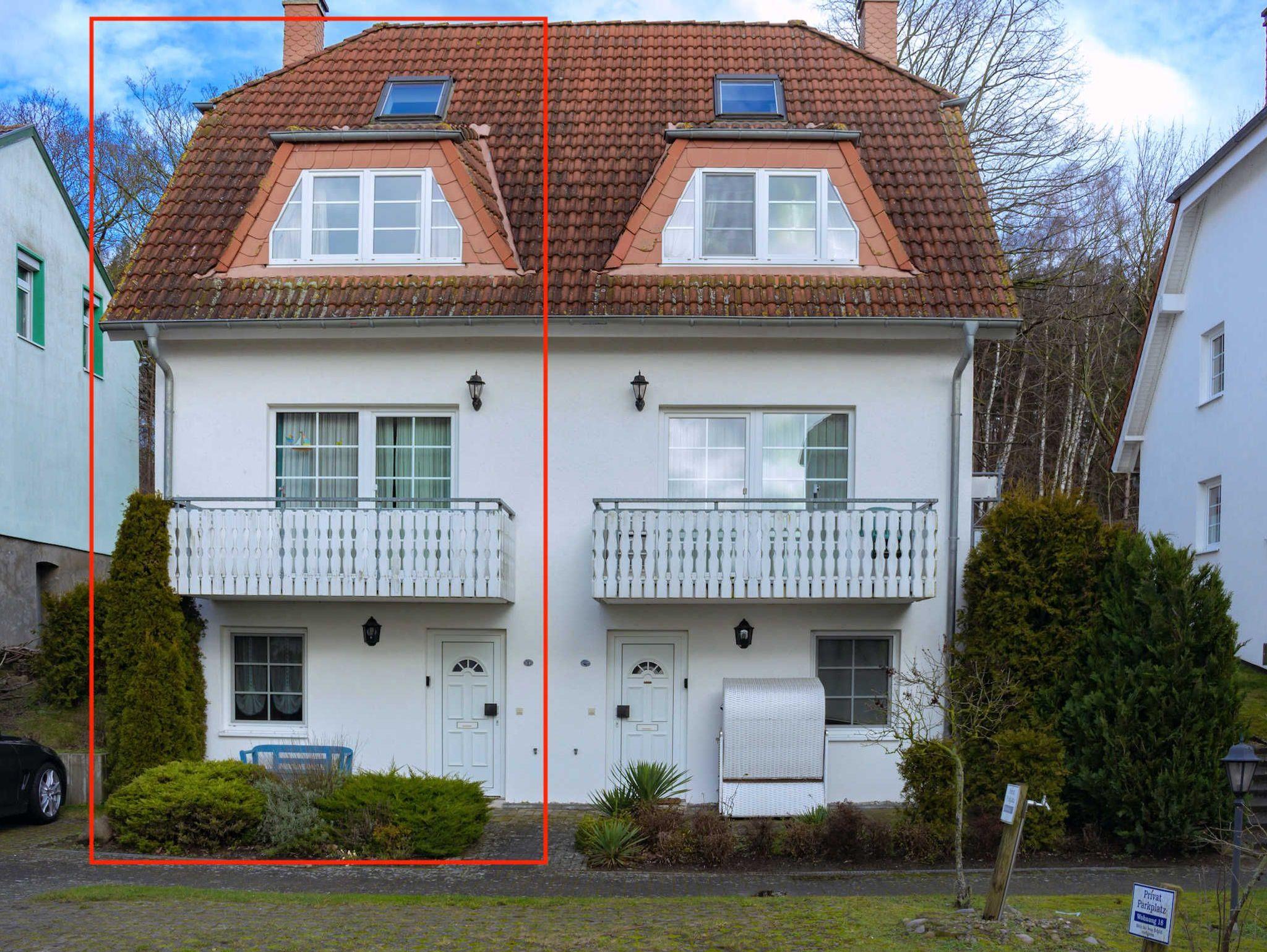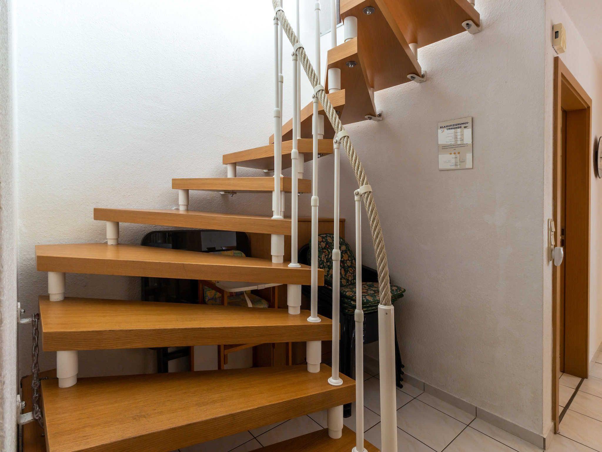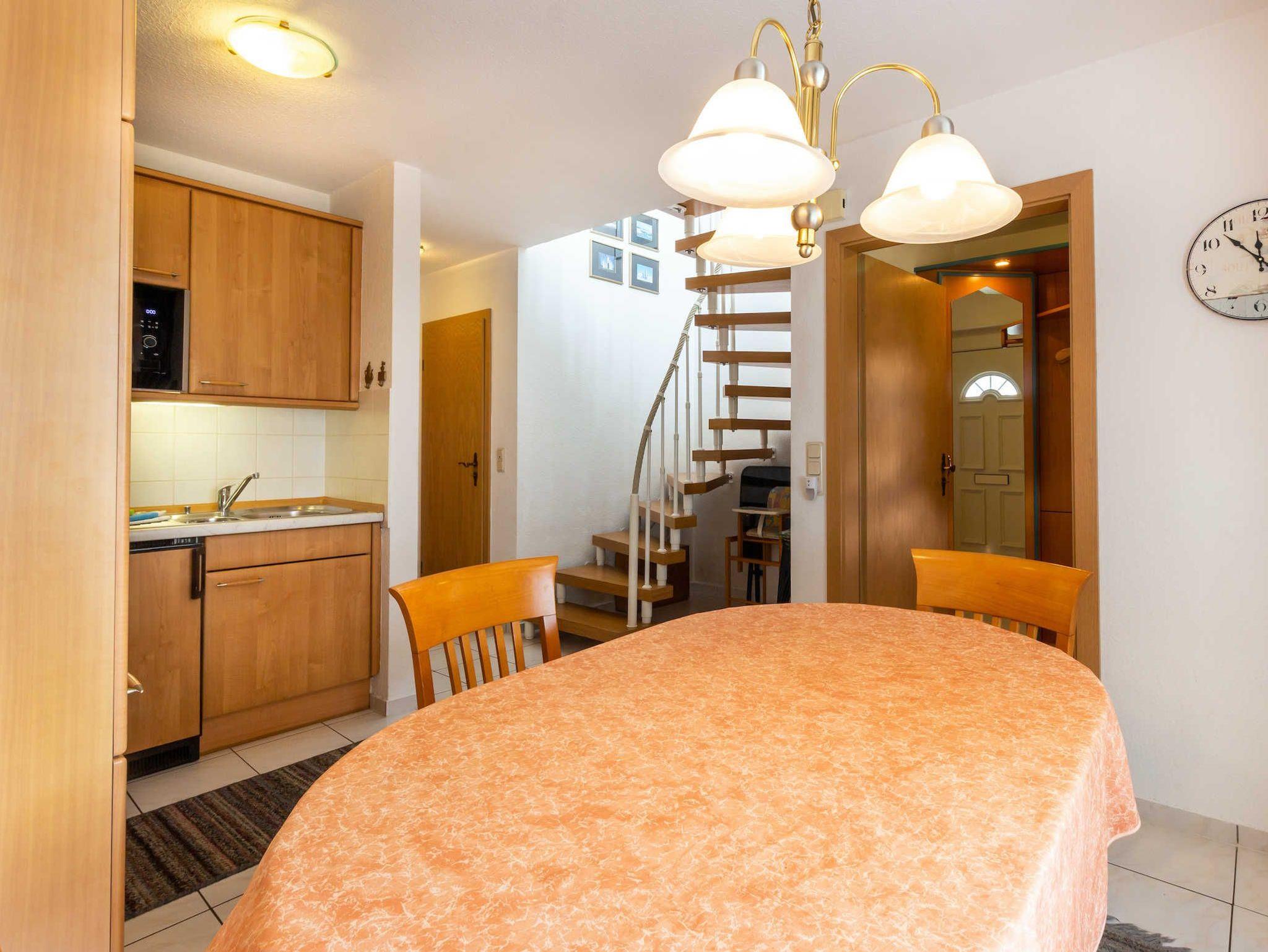 Die Ferienwohnung erstreckt sich über zwei Etagen und hat einen Südbalkon. Sie verfügt über ein Schlafzimmer mit Doppelbett und ein Wohnzimmer mit Doppelbettcouch. Der Fußboden ist mit Laminat bzw. Keramikfliesen verlegt. In der funktional eingerichteten Küche (ausgestattet mit Herd, Backofen, Kühlschrank, Mikrowelle, Kaffeemaschine sowie Toaster) befindet sich ein Esstisch.