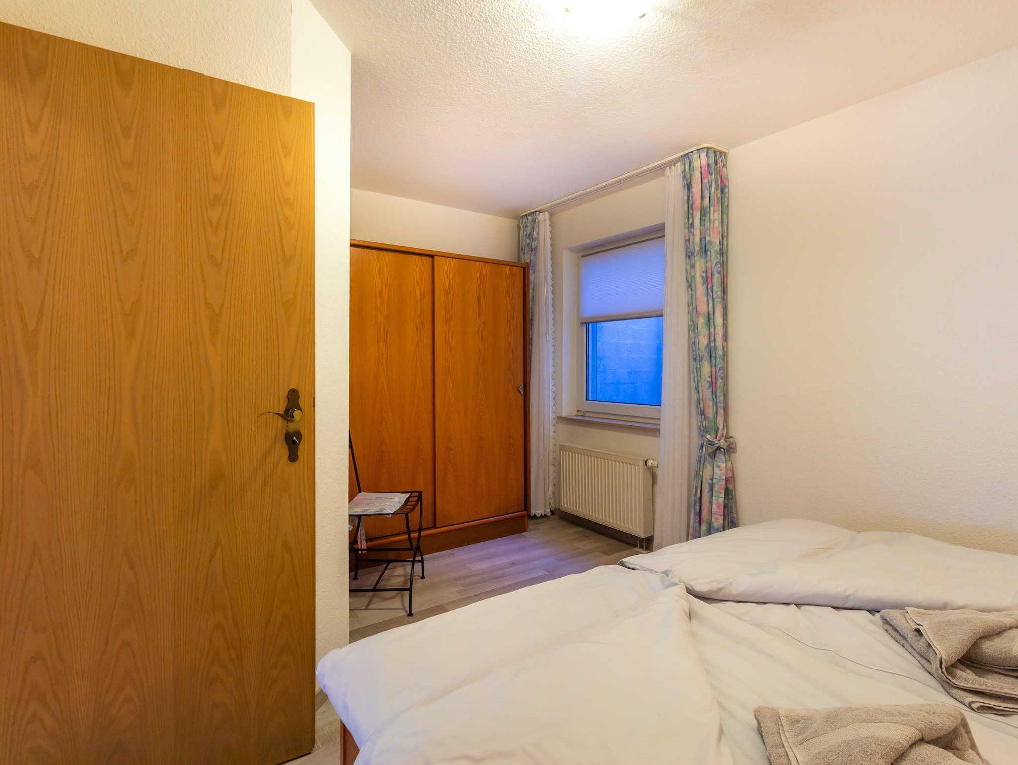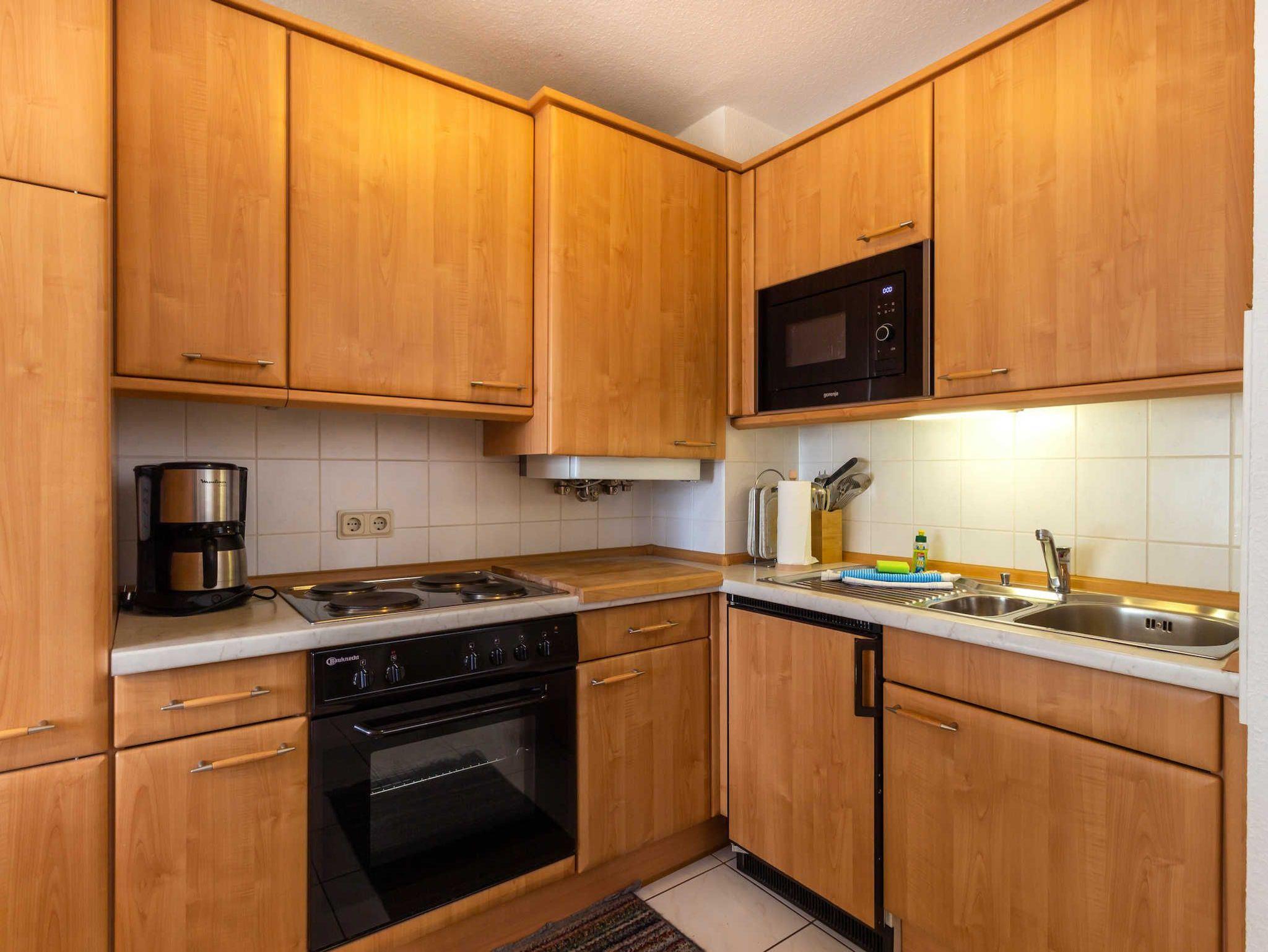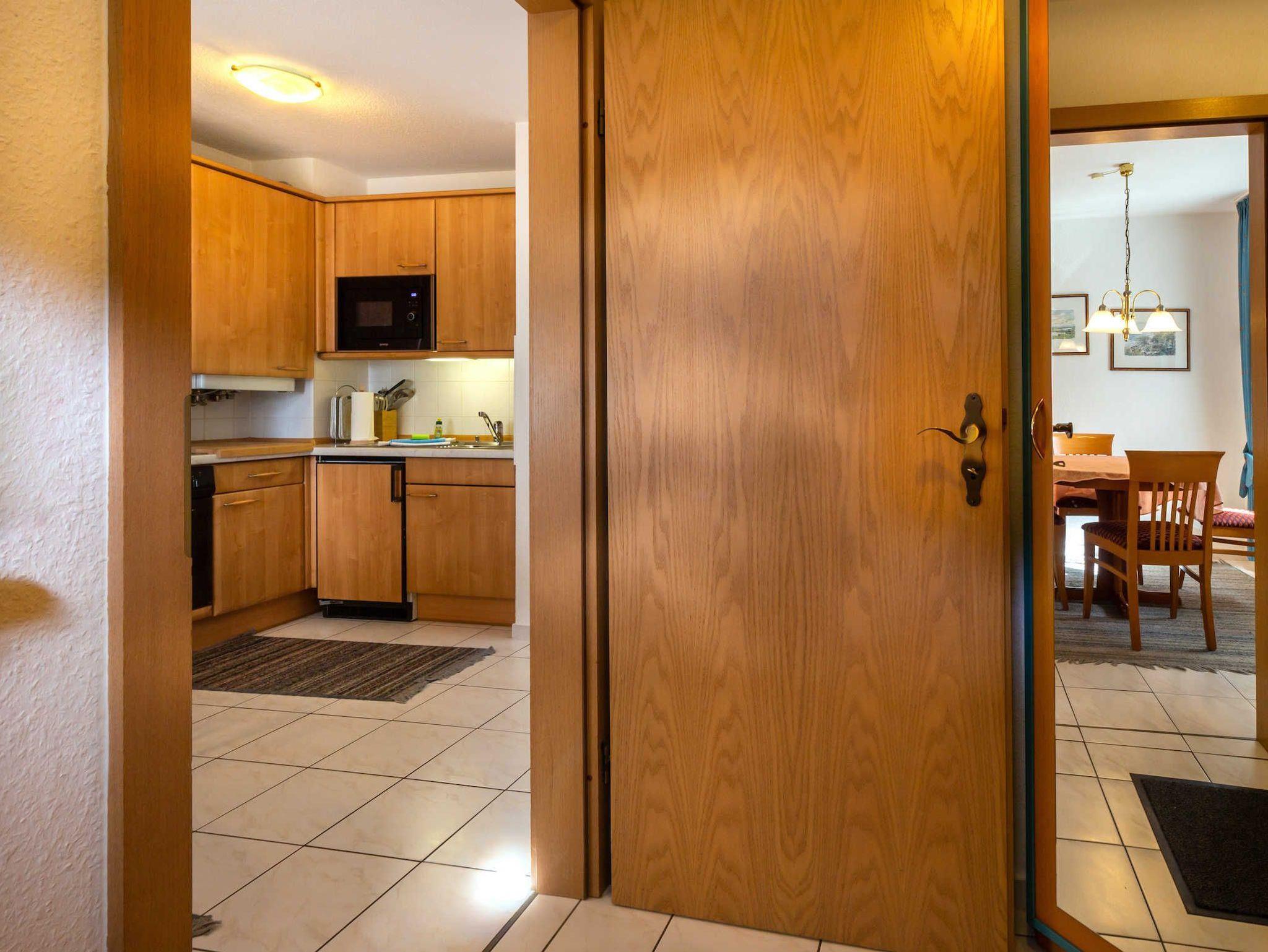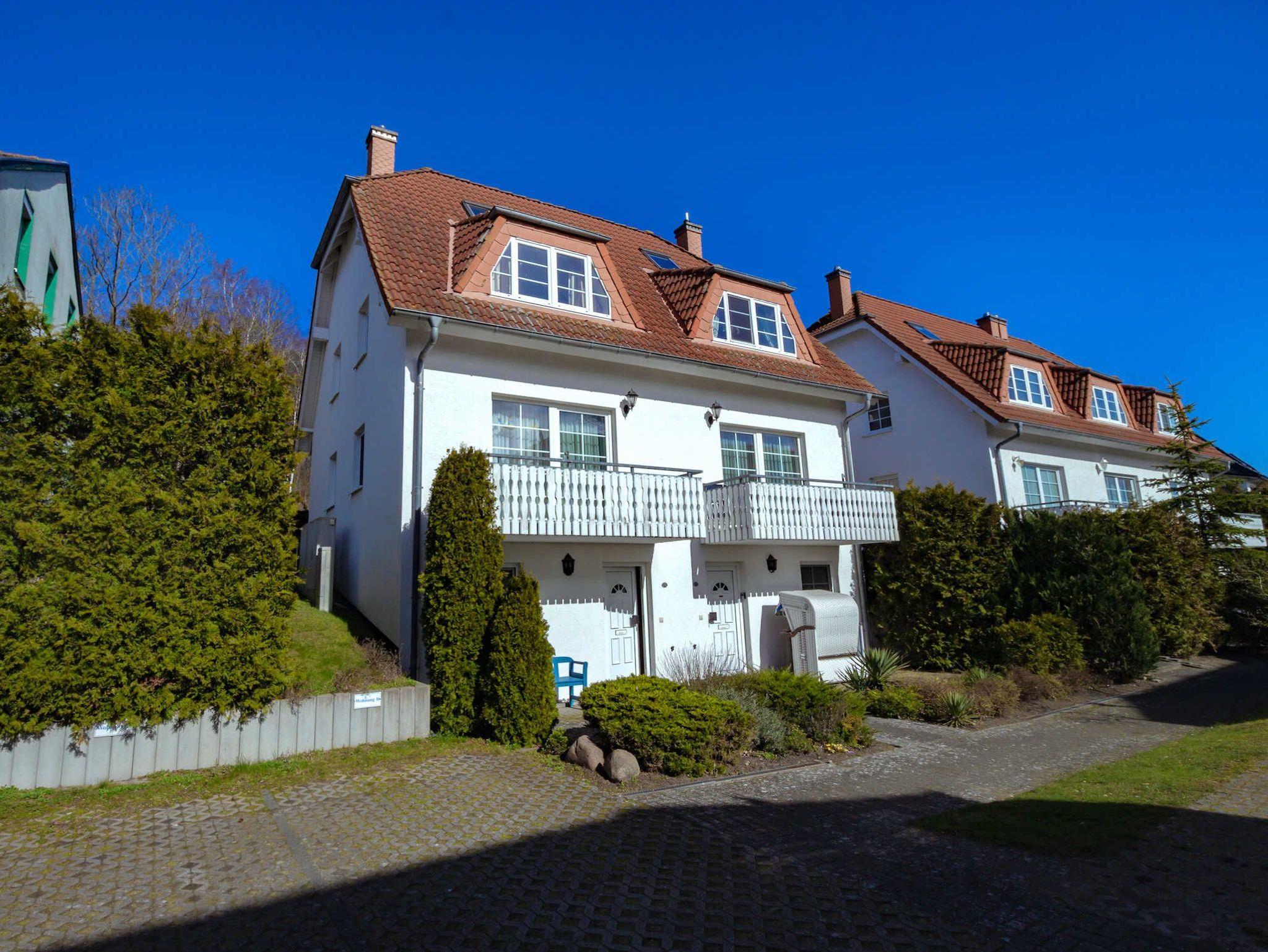 Die Ferienwohnung erstreckt sich über zwei Etagen und hat einen Südbalkon. Sie verfügt über ein Schlafzimmer mit Doppelbett und ein Wohnzimmer mit Doppelbettcouch. Der Fußboden ist mit Laminat bzw. Keramikfliesen verlegt. In der funktional eingerichteten Küche (ausgestattet mit Herd, Backofen, Kühlschrank, Mikrowelle, Kaffeemaschine sowie Toaster) befindet sich ein Esstisch.