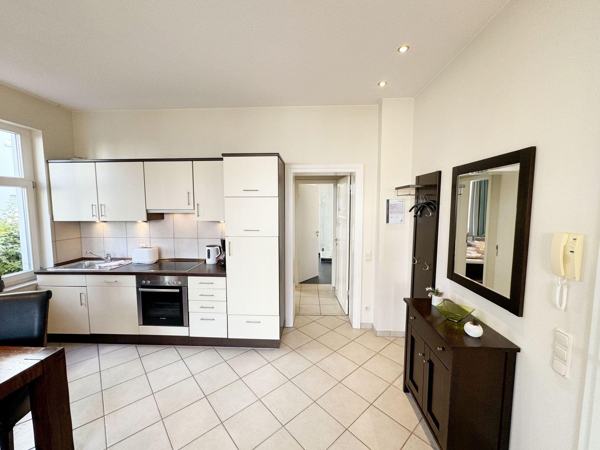 Die geschmackvolle und mit Liebe zum Detail eingerichtete 2-Raum / Nichtraucherwohnung befindet sich im Erdgeschoss der historischen Villa Möwe. Die Wohnung Nr. 2 umfasst eine Größe von ca. 52 qm und bietet genug Platz für 2 Personen und 2 Aufbettungen. Ein Kleinkind bis 3 Jahre kann im mitgebrachten bzw. dazugebuchten Kinderreisebett untergebracht werden. Der helle und großzügige Wohn-& Essbereich verfügt über einen gemütlichen Couchbereich mit einer hochwertigen Ausziehfunktion (1,60m x 2,00m), Couchtisch, 2 Sesseln, Leselampe, Anrichte mit einem Smart-TV, Blu Ray-Player, Radio mit CD-Player und Internetanschluss per WLAN (inklusive). Angrenzend finden Sie einen Holzesstisch mit 4 Stühlen, sowie eine komplett ausgestattete Küchenzeile mit Geschirrspüler, Ceranfeld, Backofen, Kühlschrank mit Eisfach, Mikrowelle, Kaffeemaschine, Nespresso Maschine, Toaster, Wasserkocher und diversen Küchenutensilien. Im separaten Schlafzimmer haben Sie ein Doppelbett (2x0,90m x 2,00m), Nachtischkonsolen, einen Kleiderschrank, Smart-TV, sowie Verdunklungsmöglichkeiten und Insektenschutzgitter, die für einen ruhigen Schlaf dienen. Der Sanitärbereich wird durch eine Dusche, WC, Fön, Kosmetikspiegel, Waschtisch, Fußbodenheizung und einen Handtuchtrockner abgerundet. Ihre bestuhlte Süd -Terrasse erreichen Sie durch den Wohnbereich. Die einem Wintergarten ähnelnden Wohnzimmerfenster sind komplett durch elektrische Rollläden abzudunkeln. Im Gemeinschafskeller können Sie gegen einen Aufpreis die gemeinschaftliche Waschmaschine und den Trockner nutzen. Die Wertmarken können Sie auf Nachfrage während Ihres Urlaubes erwerben. Die Erstausstattung eines Wäschepaketes (komplette Bettwäsche, 1 Duschhandtuch, 2 kleine Handtücher) können Sie bis 14 Tage vor Anreise gegen einen Aufpreis dazu buchen oder durch eigene ergänzen. Ab 2 gebuchten Paketen erhalten Sie einmalig 1 Geschirrhandtuch und 1 Duschvorleger hinzu. Ein eigener Pkw-Stellplatz Nr. 26 (Einfahrtshöhe Tiefgarage 2,10 m im Haus II) und ein Abstellraum im Keller (Haus I) gehören zur Wohnung. Haustiere sind in der Wohnung nicht erlaubt.