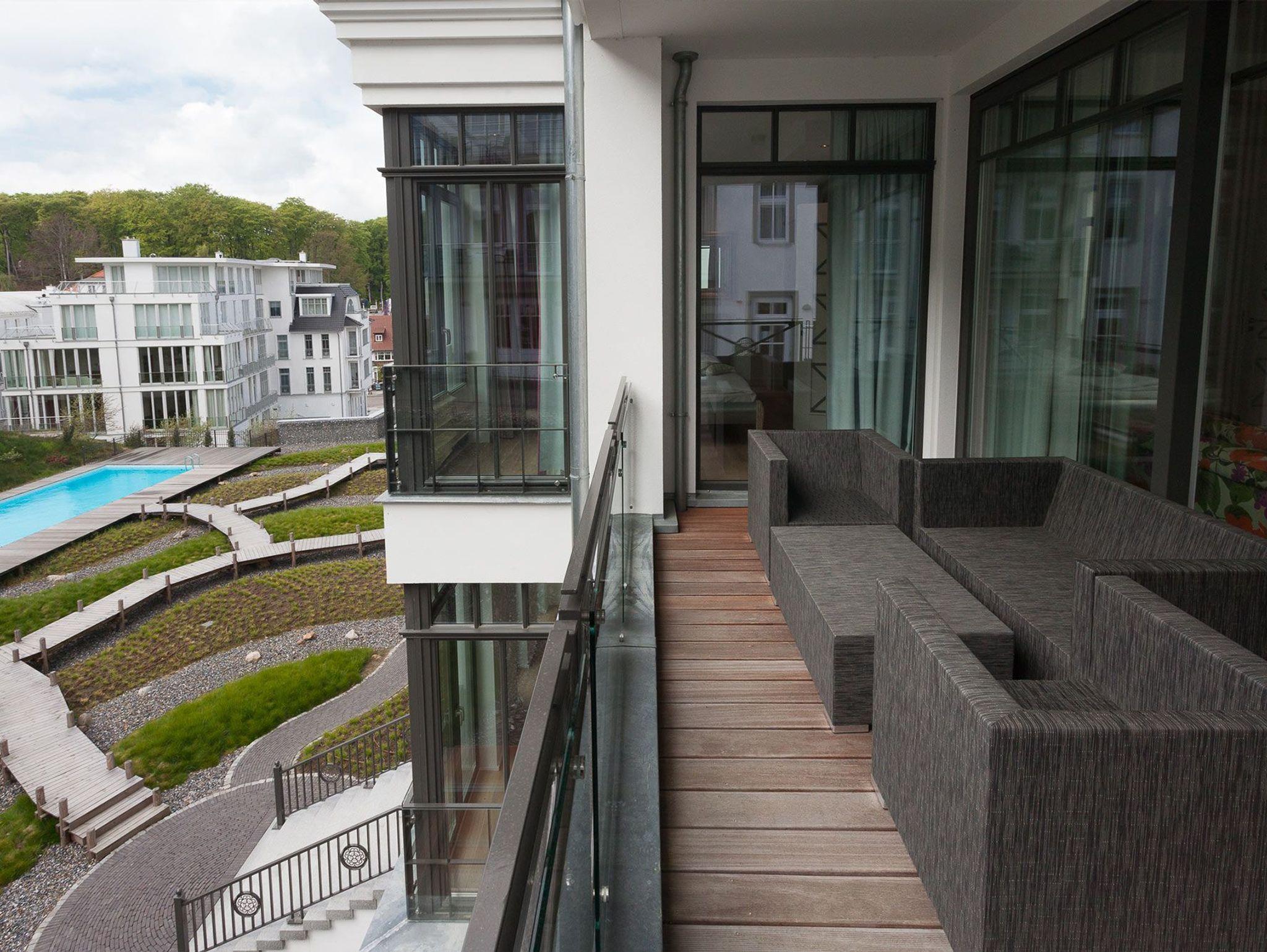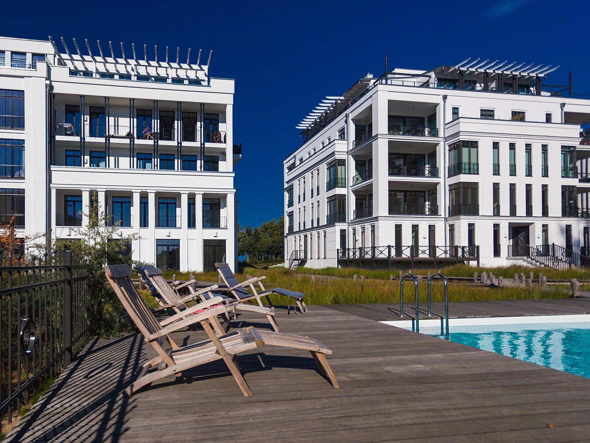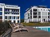 In der warmen Jahreszeit bietet auf der windgeschützten Landseite hinter dem FIRST, ein solarbeheizter Außenpool jede Menge Badespaß.