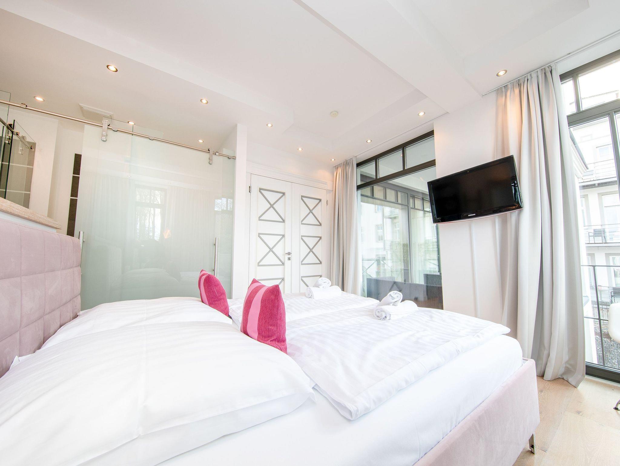 Die beiden Schlafzimmer sind mit jeweils einem Fernseher und einem dazugehörigen Ensuite-Bad ausgestattet. Die Badezimmer sind mit einer bodentiefen Dusche bzw. Badewanne, großzügigen Waschtischen, sowie Handtuchwärmer ausgestattet und lassen somit keine Wünsche offen.