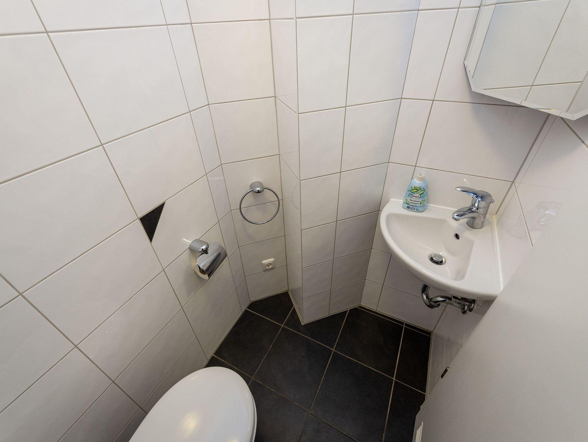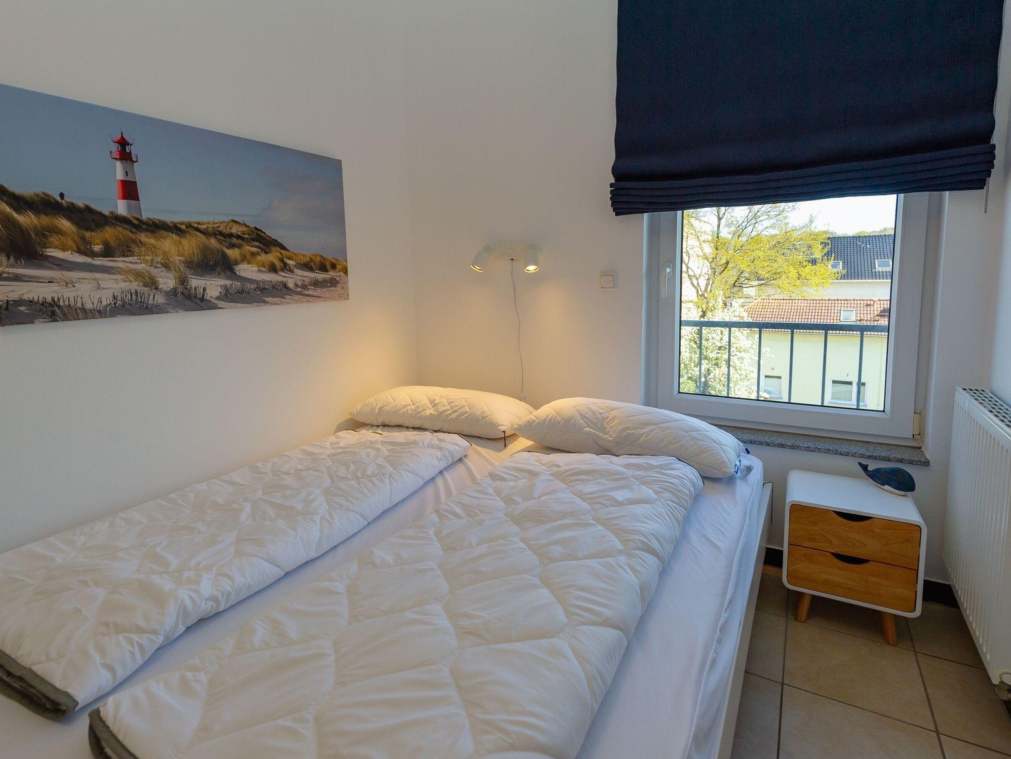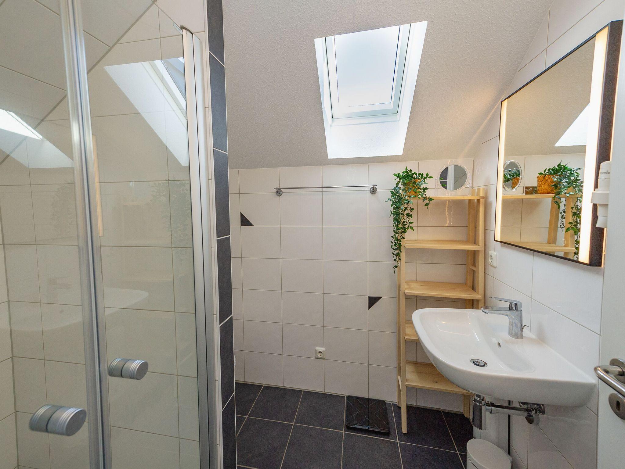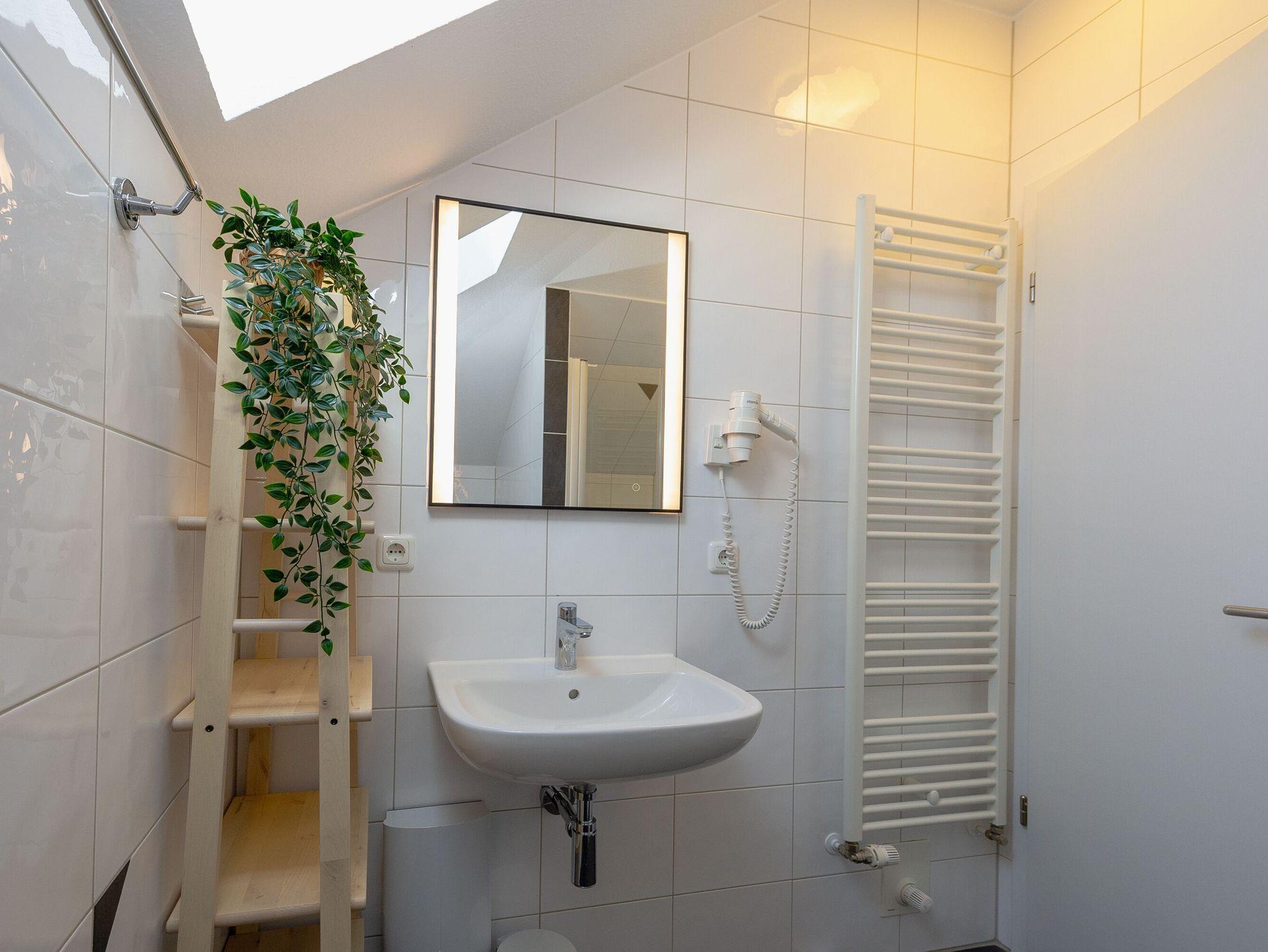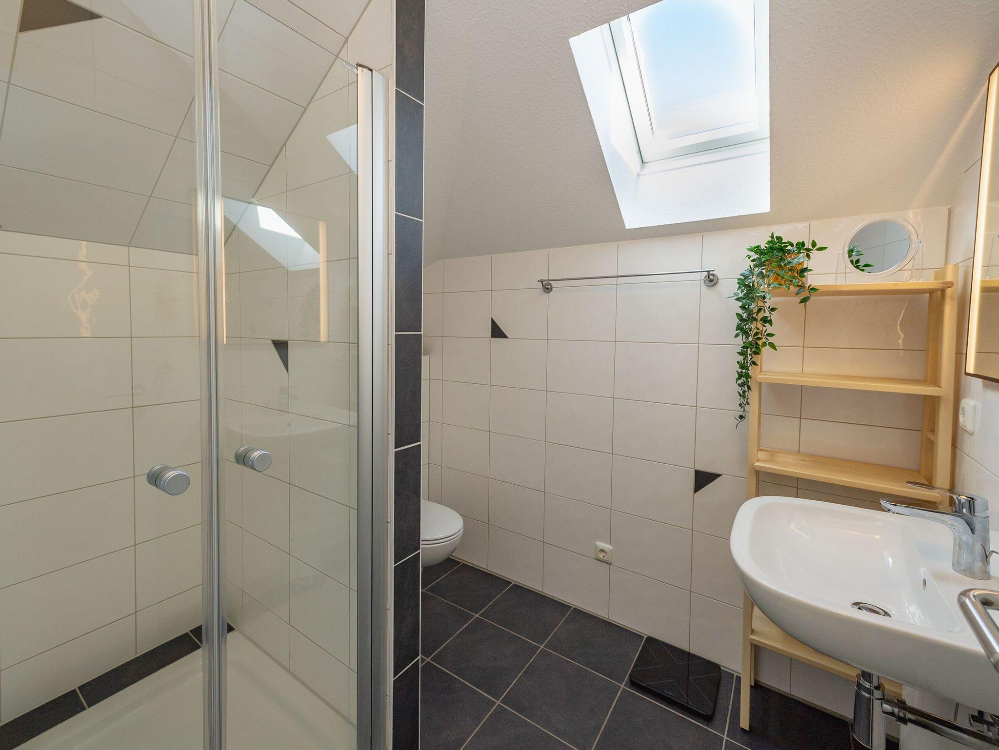 Ein paar Treppenstufen höher finden Sie unter leichten Dachschrägen das zweite Schlafzimmer - ebenfalls ausgestattet mit einem Doppelbett, einem Kleiderschrank und Fernseher - sowie das Badezimmer mit Dusche/WC, Waschtisch und Fön.