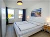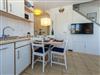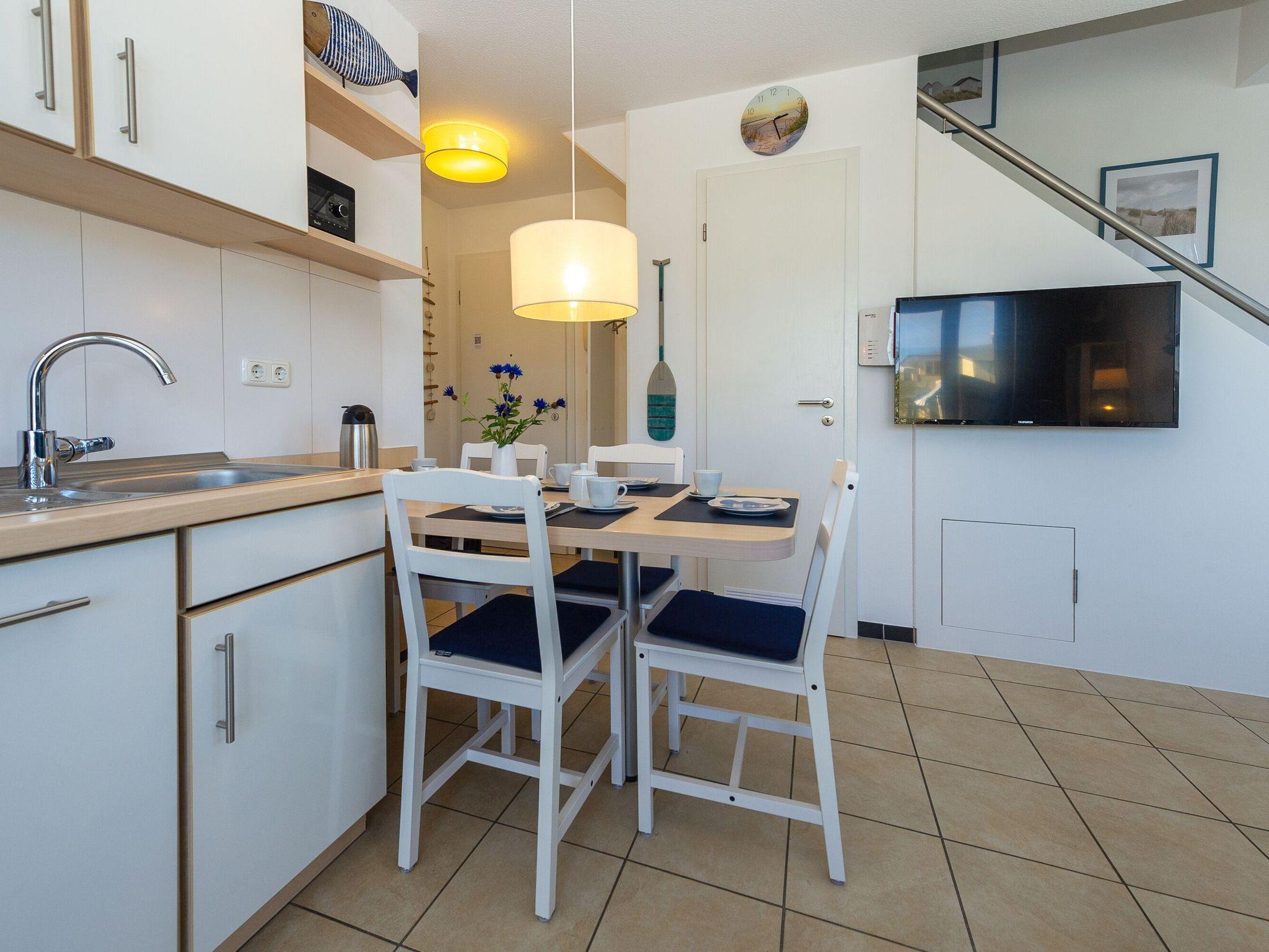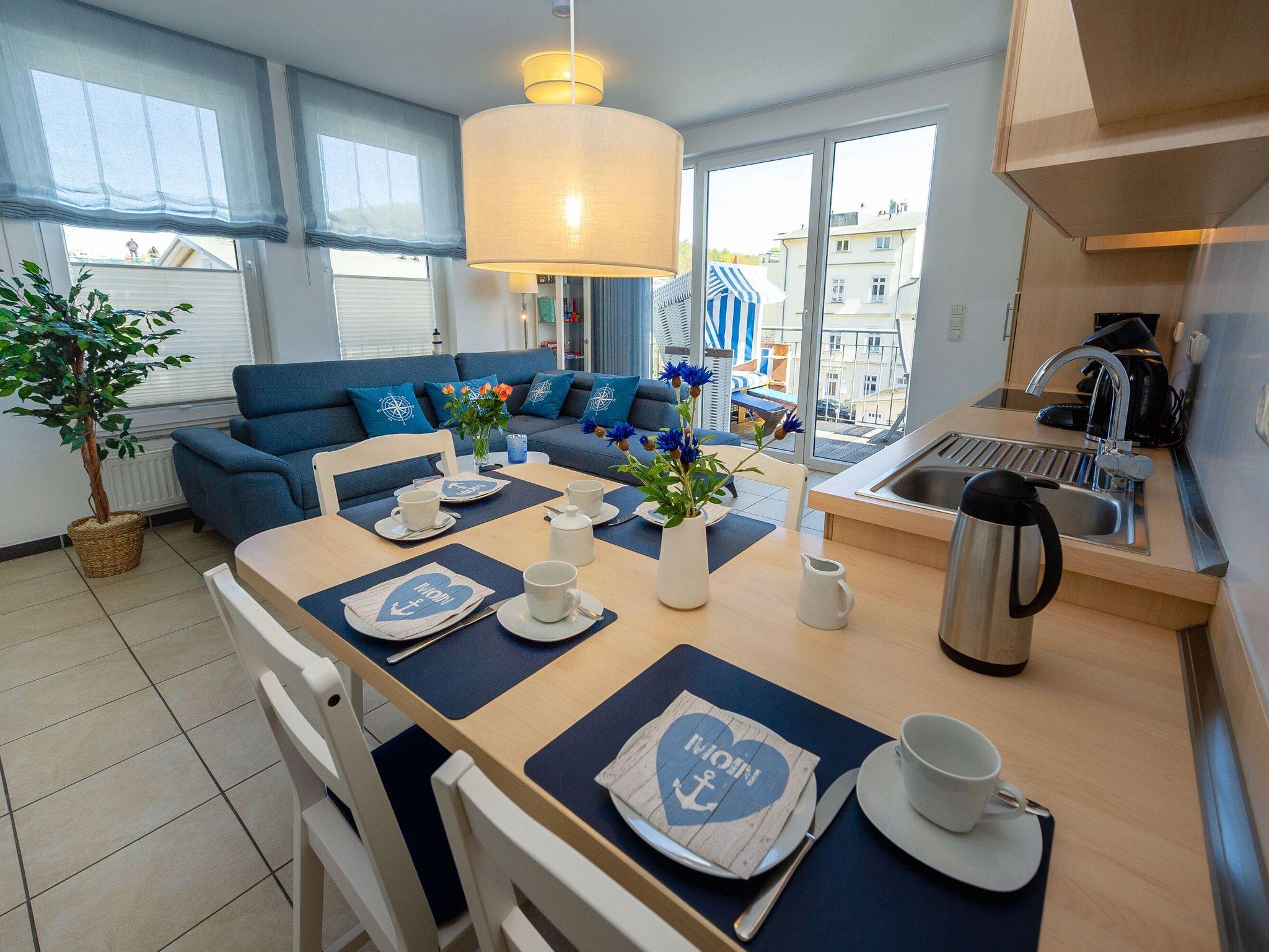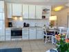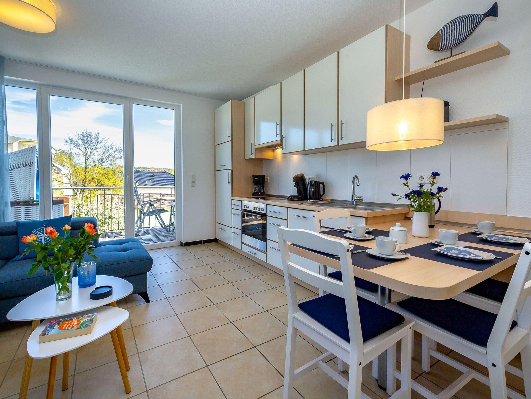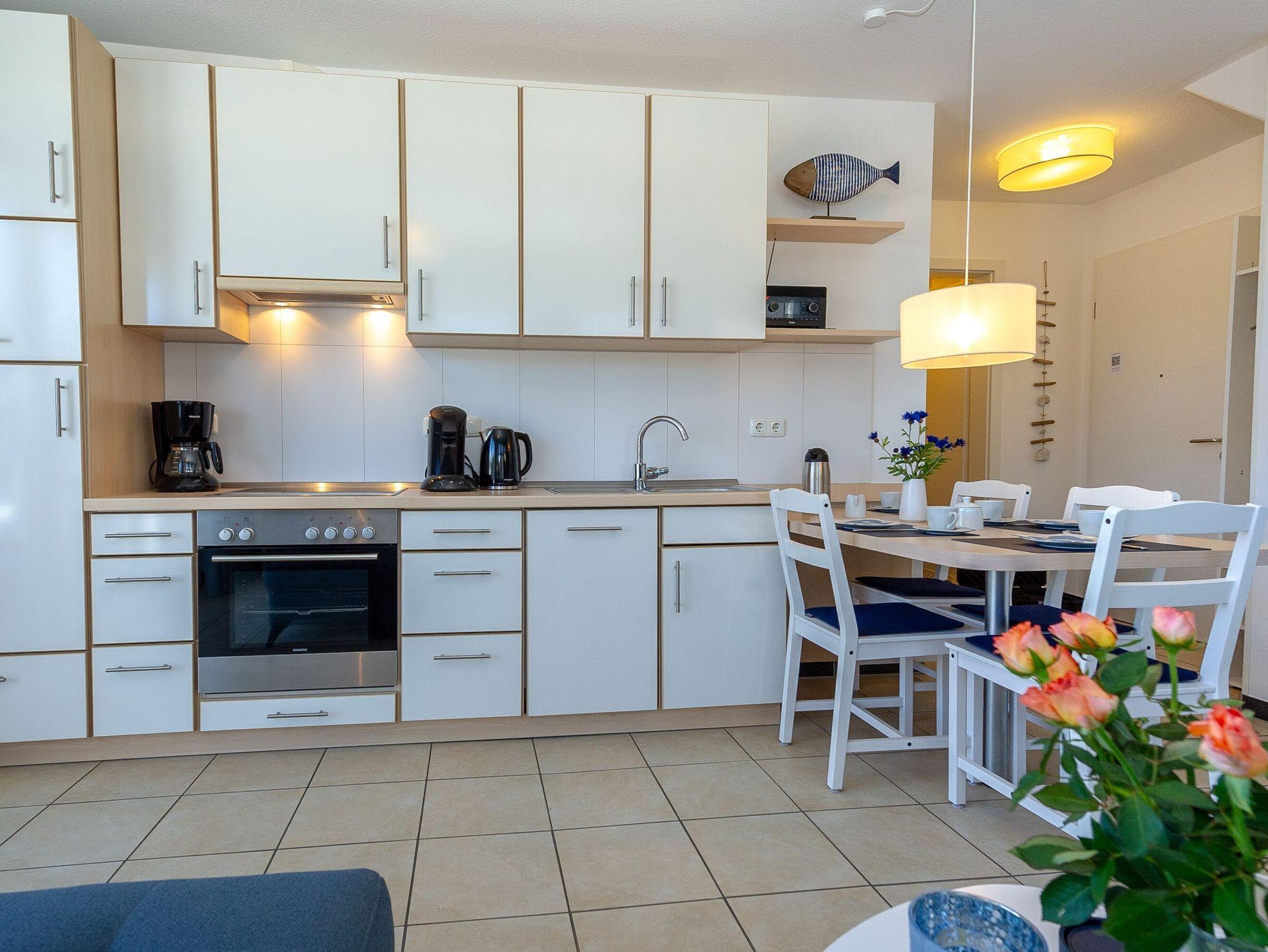 Die offene Küche verfügt über einen 4-Zonen-Ceranherd mit Backofen, einen Kühlschrank mit Gefrierfach, eine Spülmaschine, eine Mikrowelle sowie Kaffeemaschine, Wasserkocher und Toaster. Natürlich sind auch ausreichend Koch- und Essgeschirr und weiteres nützliches Kleininventar vorhanden. Bis zum nächsten Bäcker für die frischen Frühstücksbrötchen sind es nur rund zwei Gehminuten. Speisen können Sie ganz nach Belieben entweder am großen Esstisch im Wohnzimmer oder draußen auf dem Balkon, der zur sonnigen Südost-Seite ausgerichtet ist.