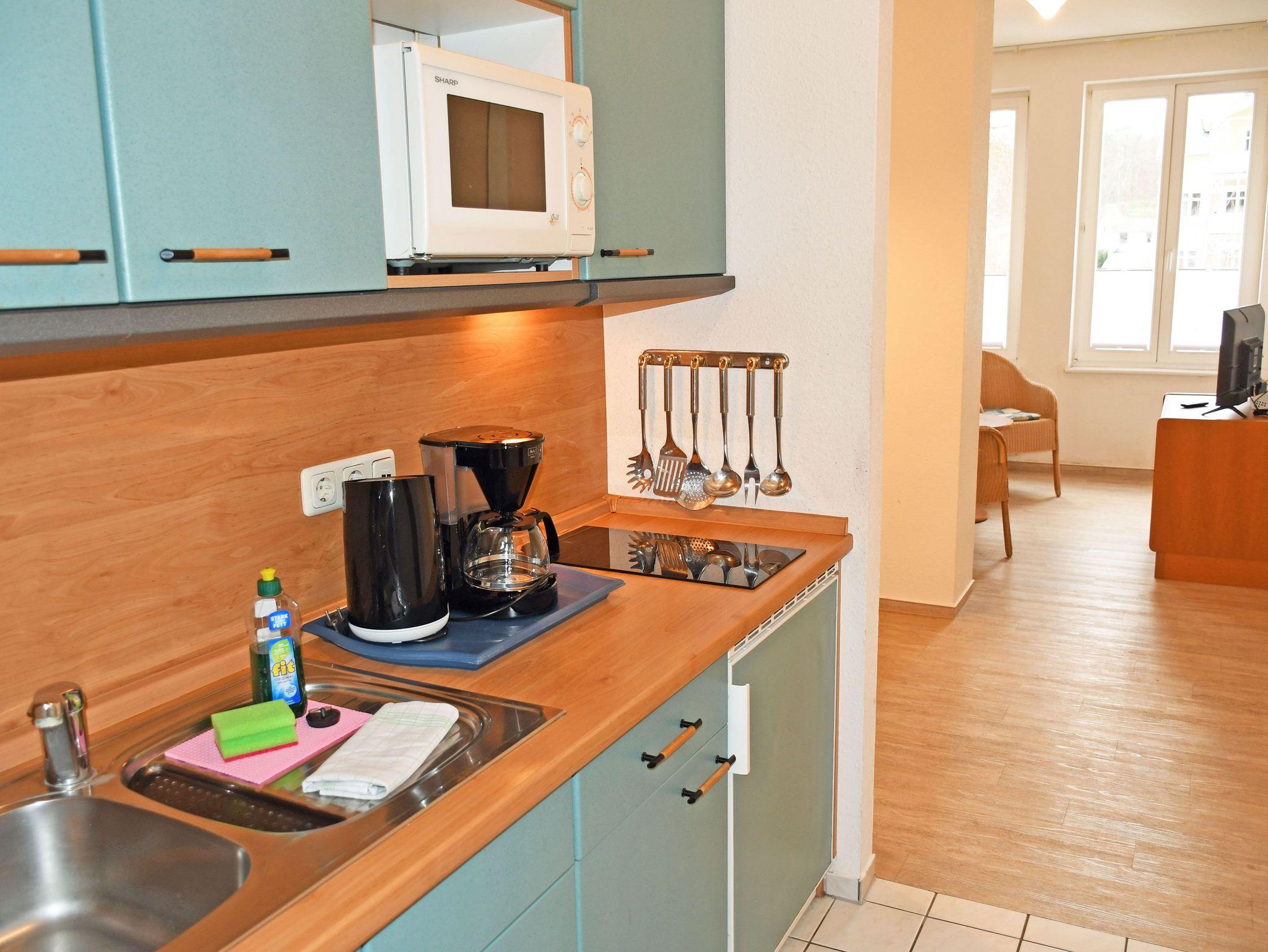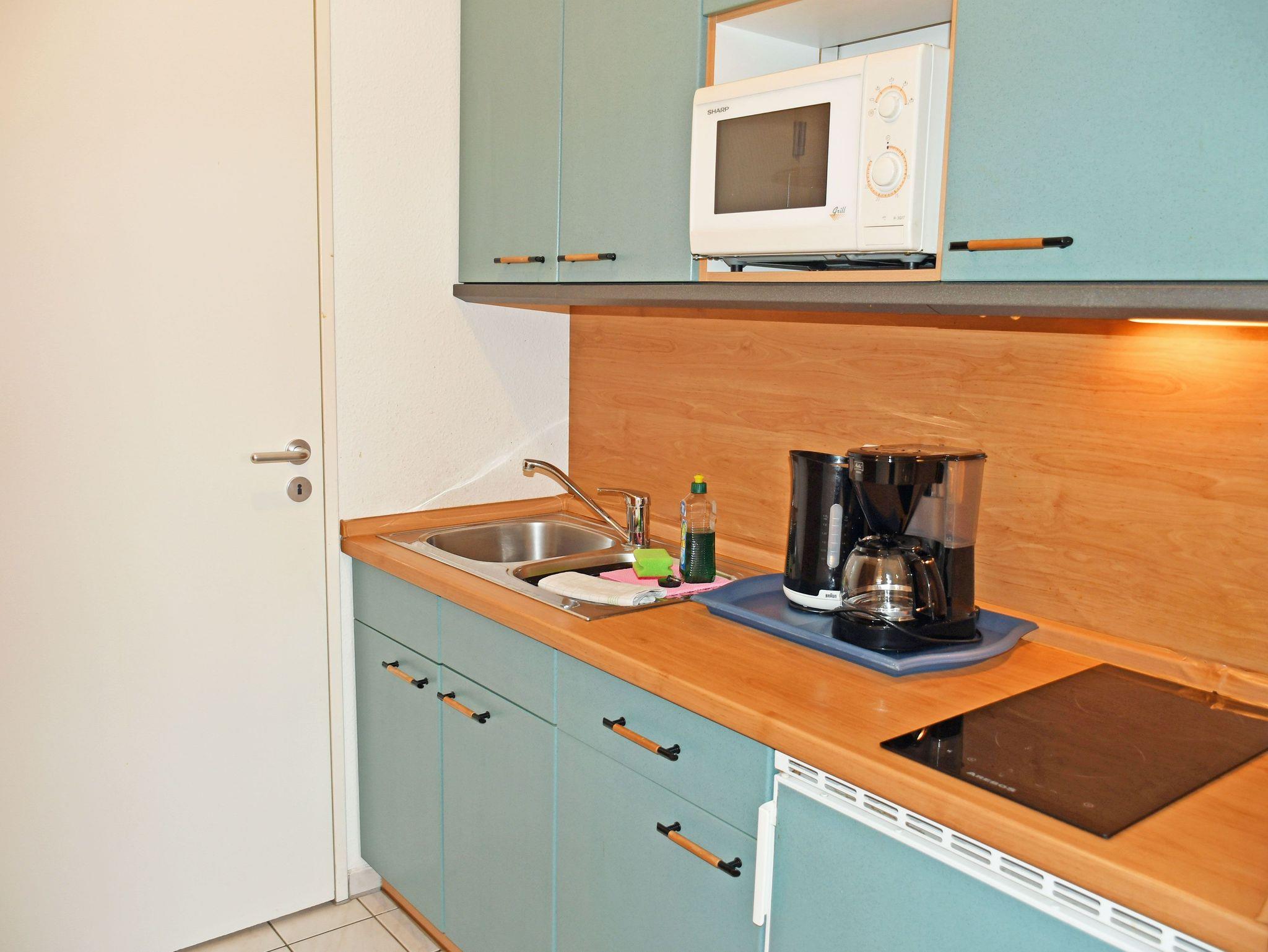Die Küchenzeile im Vorraum ist mit Herd, Wasserkocher, Kaffeemaschine, Mikrowelle, Toaster und Kühlschrank ausgestattet.
