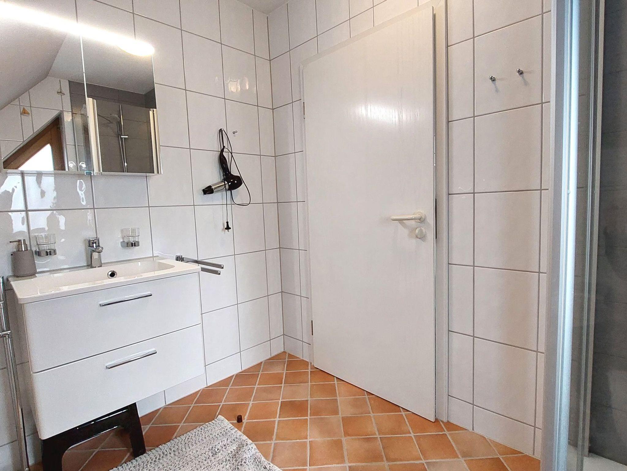 Vom Flurbereich samt Garderobe gelangen Sie ins Tageslichtbad, welches über WC, Dusche, Kosmetikspiegel und Fön verfügt.
