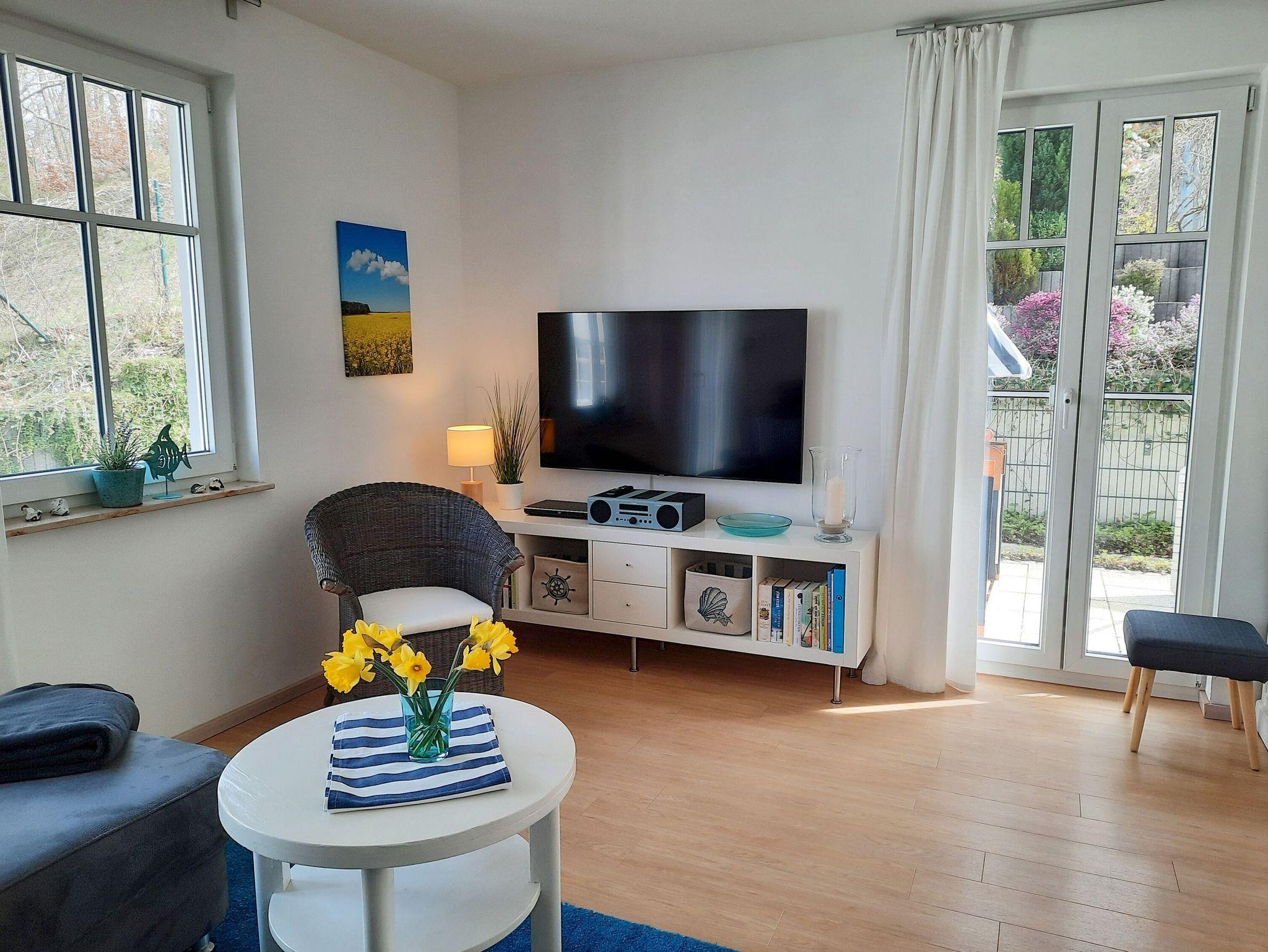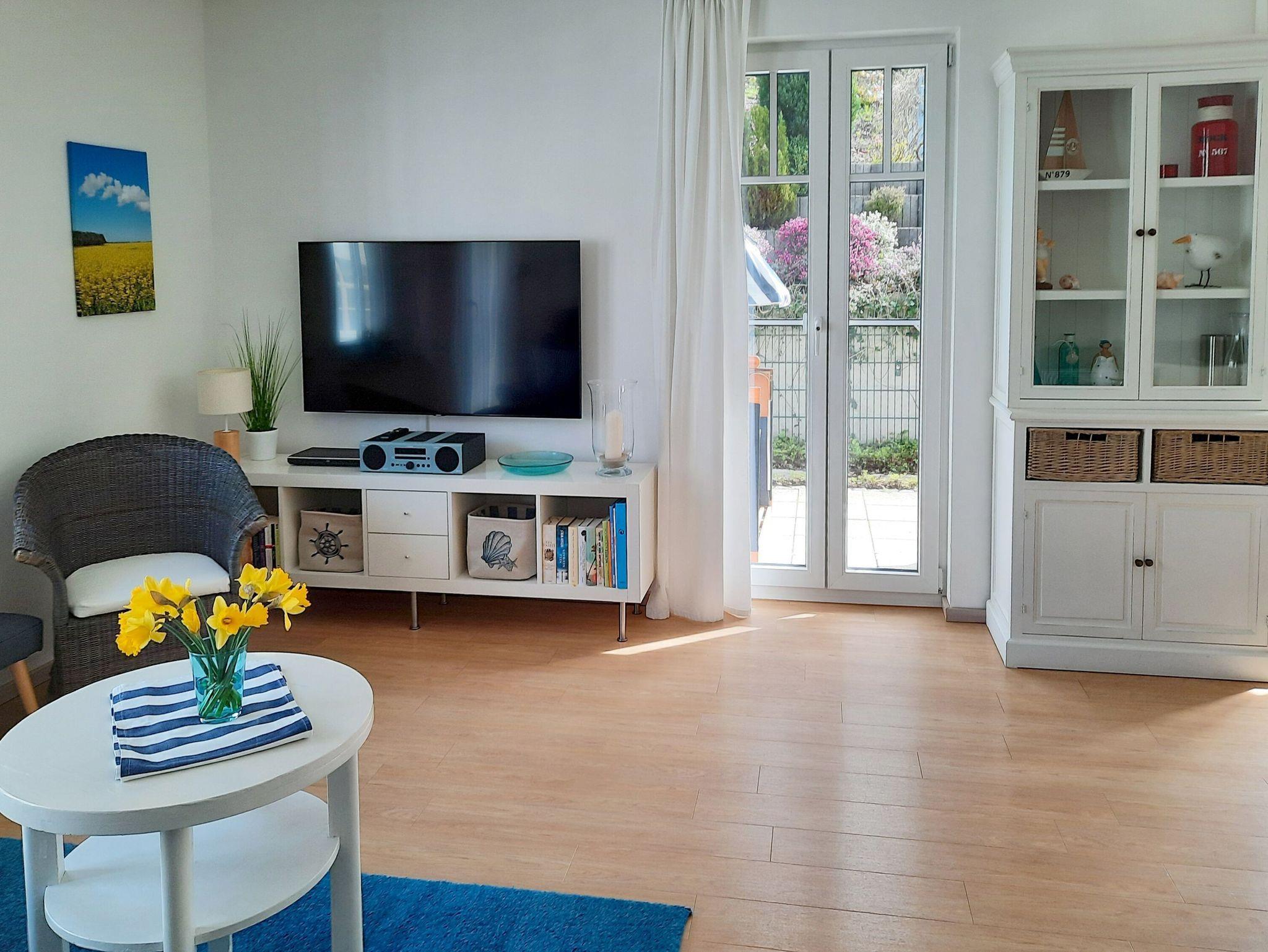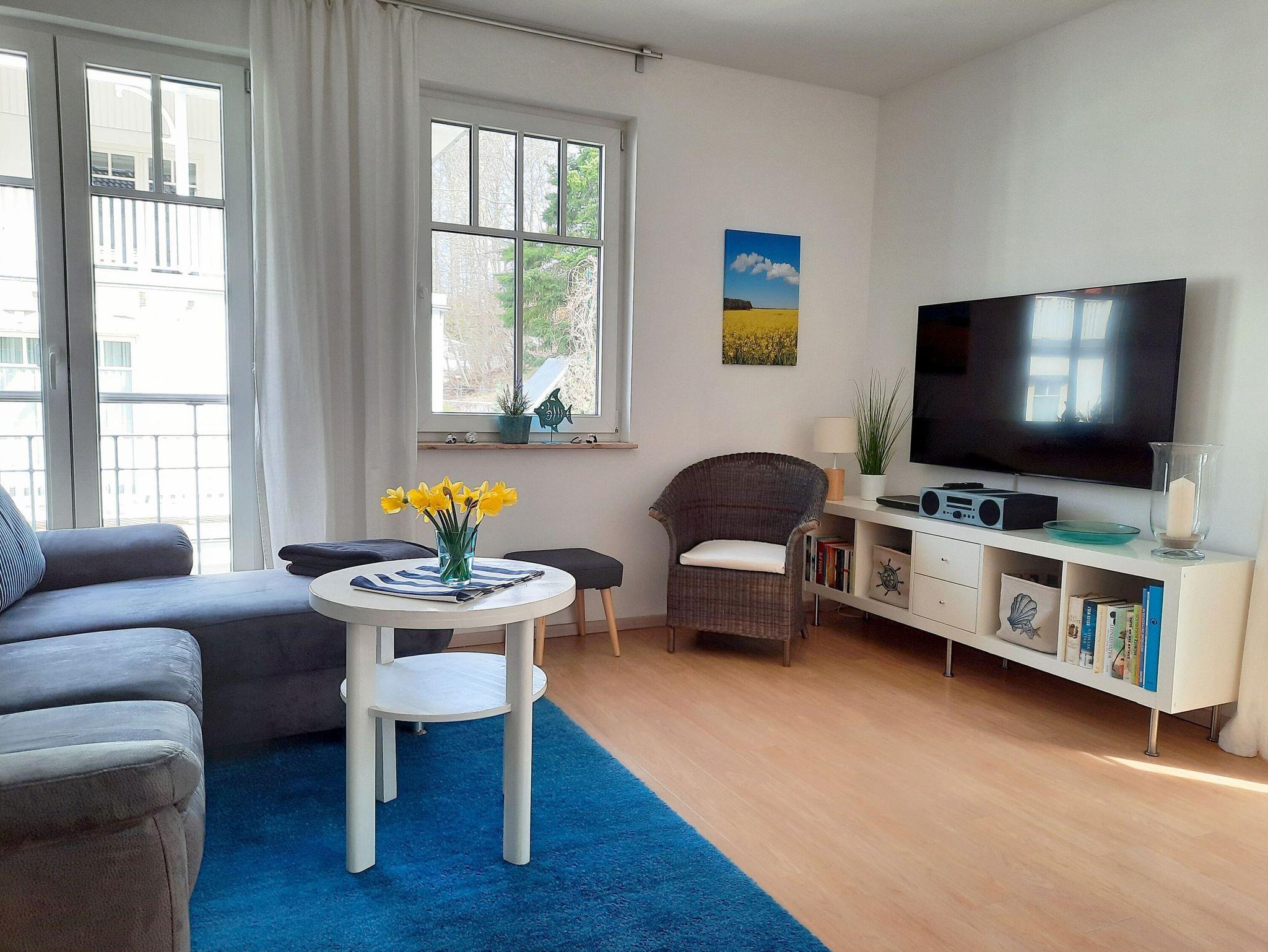 In ruhiger Lage mit Terrasse und Blick ins Grüne erwartet Sie im 2. Obergeschoss der Villa Rosa dieses ca. 56 m² große, sehr geschmackvoll eingerichtete 3-Raum-Appartement. Vom Eingangsbereich aus betreten Sie den komfortabel ausgestatteten Wohnbereich, der mit einem gemütlichen Sofa, einem riesigen 55 Zoll-Flachbild-TV, einem Bluray-DVD-Player und einer Stereo-Anlage mit CD-Player ausgestattet ist. Die Wohnung verfügt selbstverständlich auch über einen kostenfreien W-LAN-Anschluss.