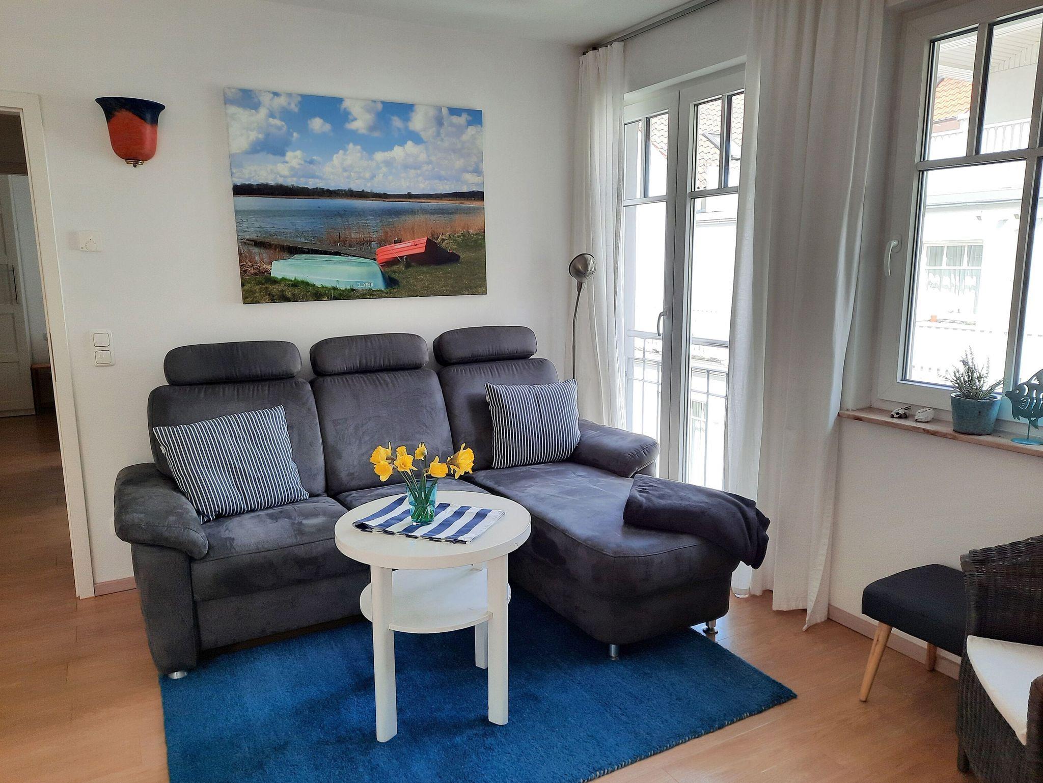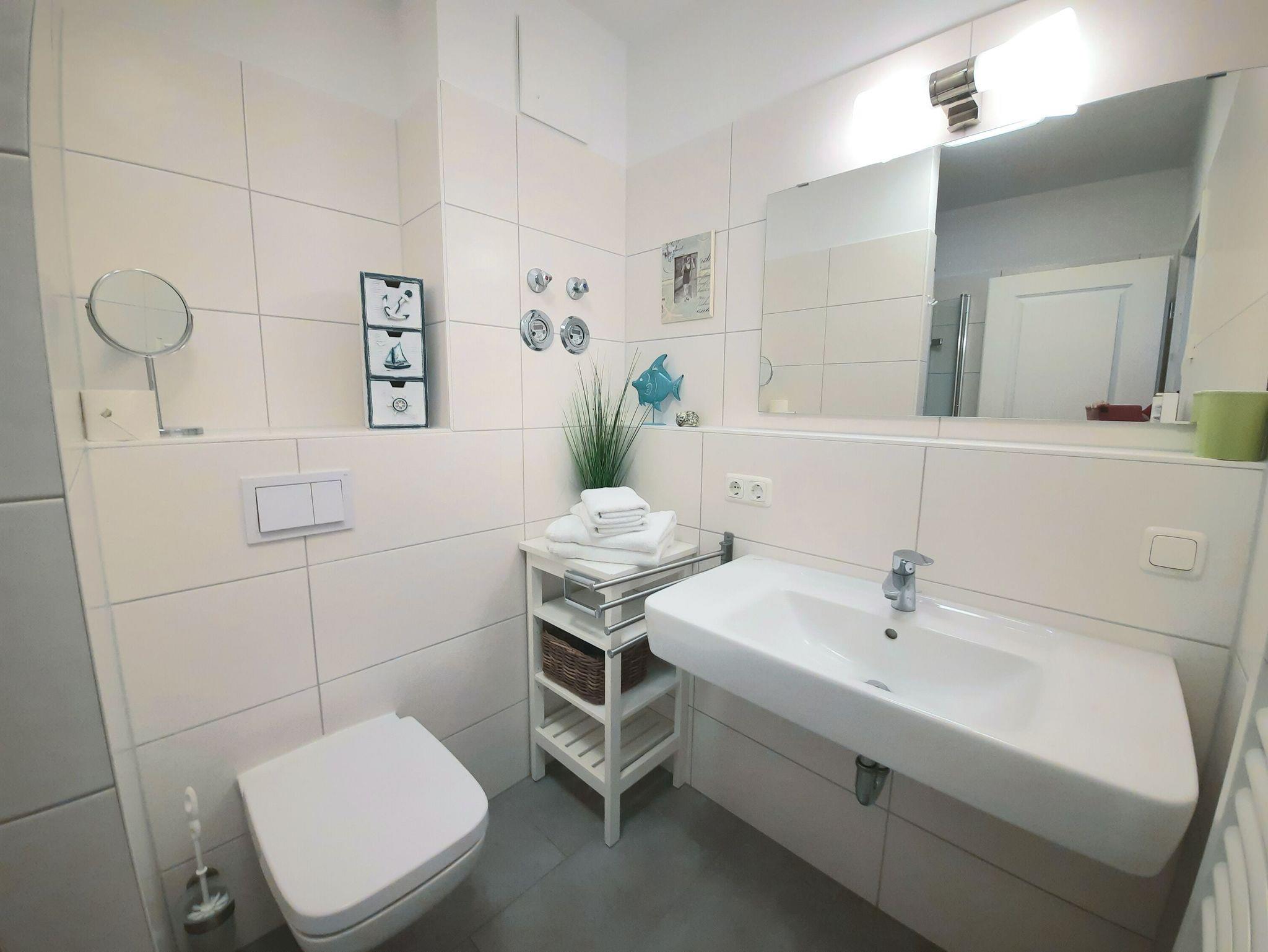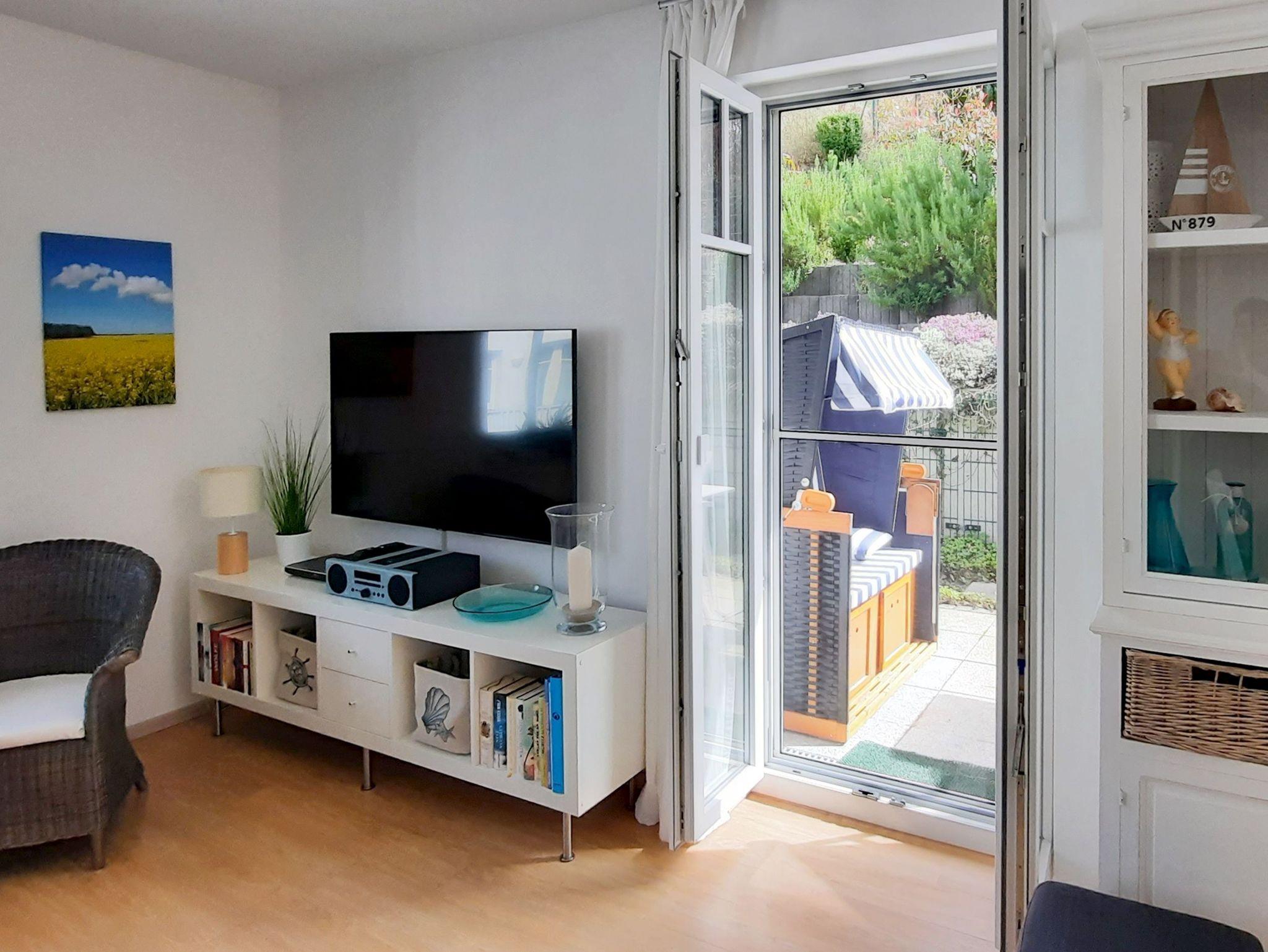 In ruhiger Lage mit Terrasse und Blick ins Grüne erwartet Sie im 2. Obergeschoss der Villa Rosa dieses ca. 56 m² große, sehr geschmackvoll eingerichtete 3-Raum-Appartement. Vom Eingangsbereich aus betreten Sie den komfortabel ausgestatteten Wohnbereich, der mit einem gemütlichen Sofa, einem riesigen 55 Zoll-Flachbild-TV, einem Bluray-DVD-Player und einer Stereo-Anlage mit CD-Player ausgestattet ist. Die Wohnung verfügt selbstverständlich auch über einen kostenfreien W-LAN-Anschluss.