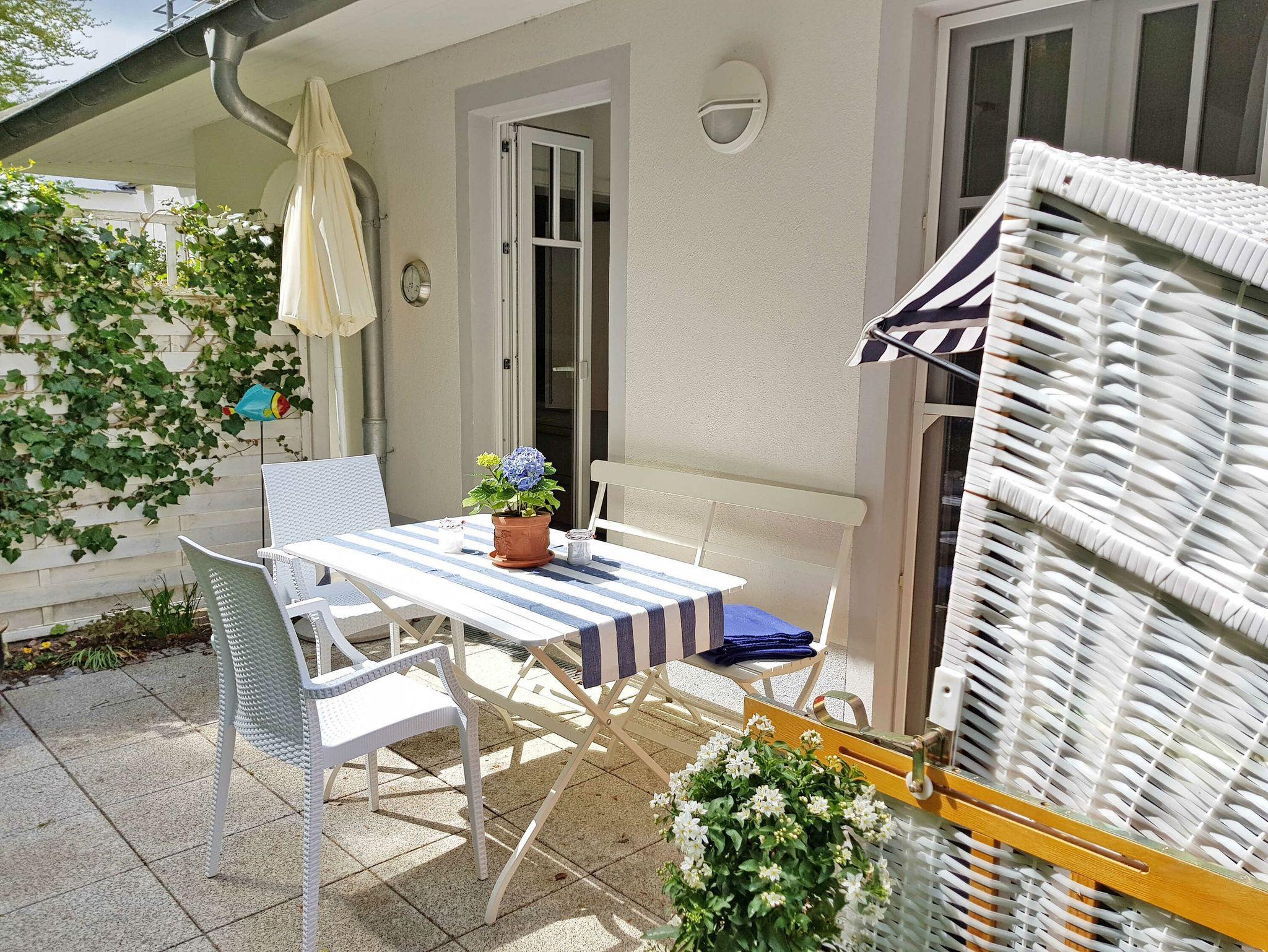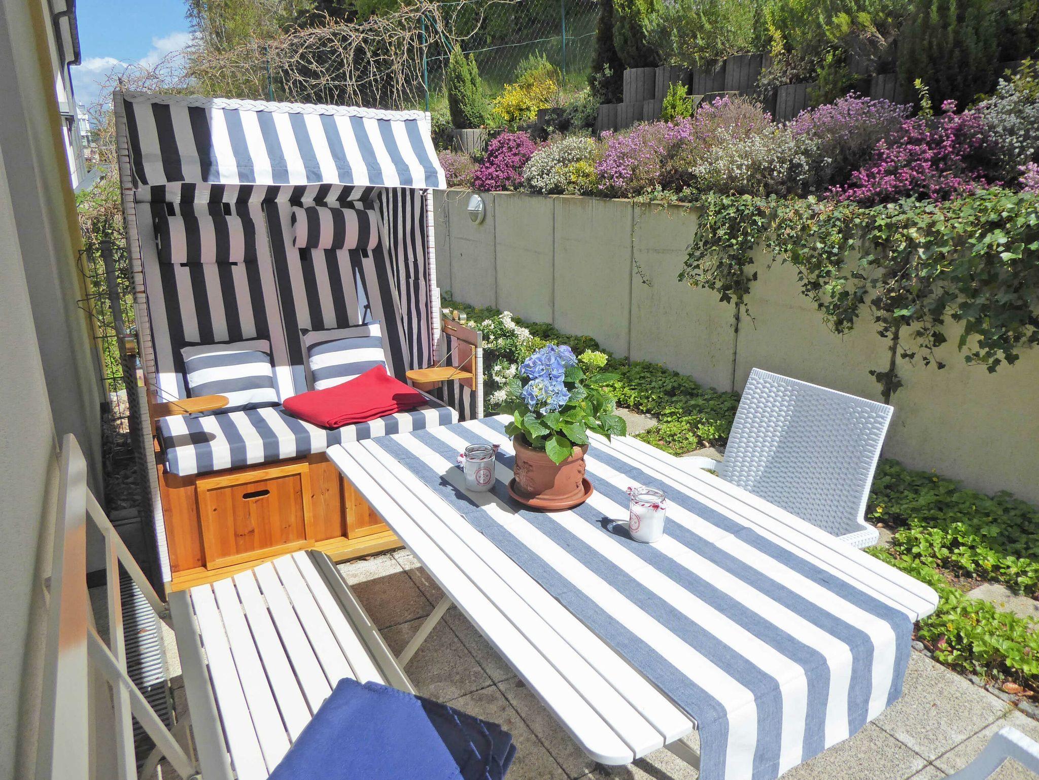 Durch den Bau des Hauses am Hang finden Sie hier eine möblierte Terrasse zur Ost-Seite vor, wo Sie beim Frühstück die Morgensonne genießen und aus dem Strandkorb den Blick ins Grüne schweifen lassen können.