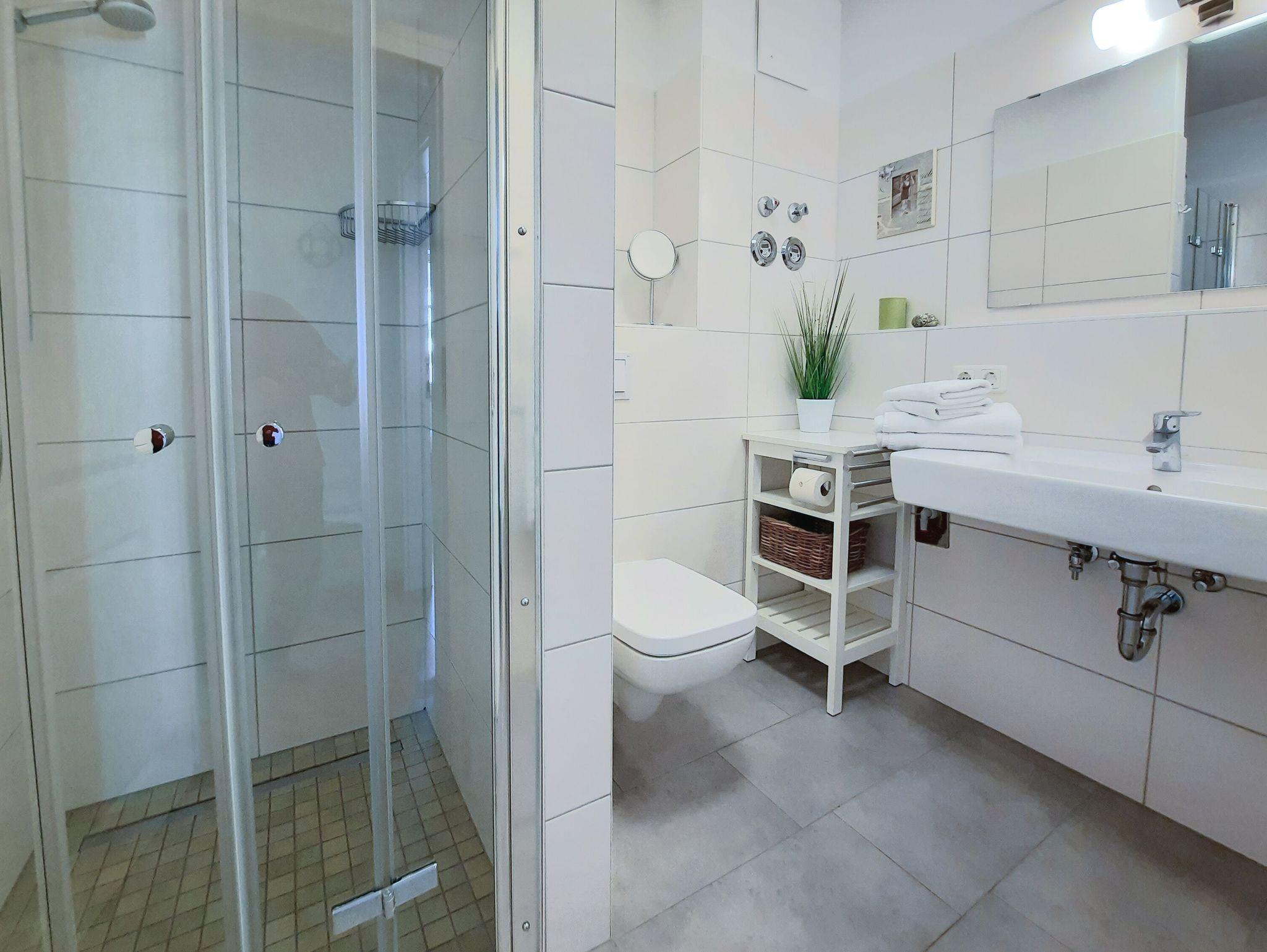 Eines der beiden Schlafzimmer verfügt über ein Doppelbett der Größe 180 x 200cm, das andere über ein Doppelbett der Größe 140 x 200cm sowie ausreichend Stauraum für Ihre Garderobe. Ein modernes Duschbad mit WC, Waschtisch, Handtuchwärmer und Fön ist natürlich auch vorhanden.