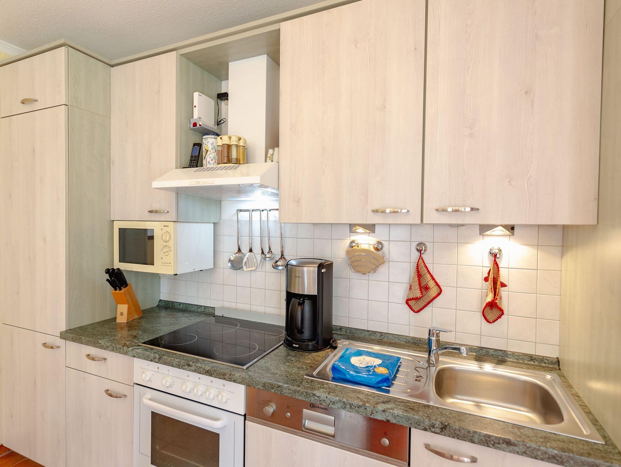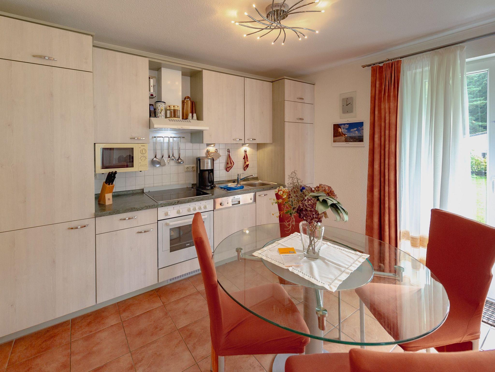 Das 2-Raum-Appartement besteht aus einem Wohnzimmer mit einer gemütlichen Couch, einem Esstisch und einer Küchenzeile. In dieser befinden sich eine Spülmaschine, Kühlschrank mit Gefrierfach, 4-Platten-Cerankochfeld, Backofen und diverse Kleingeräte, die die Ausstattung komplettieren.