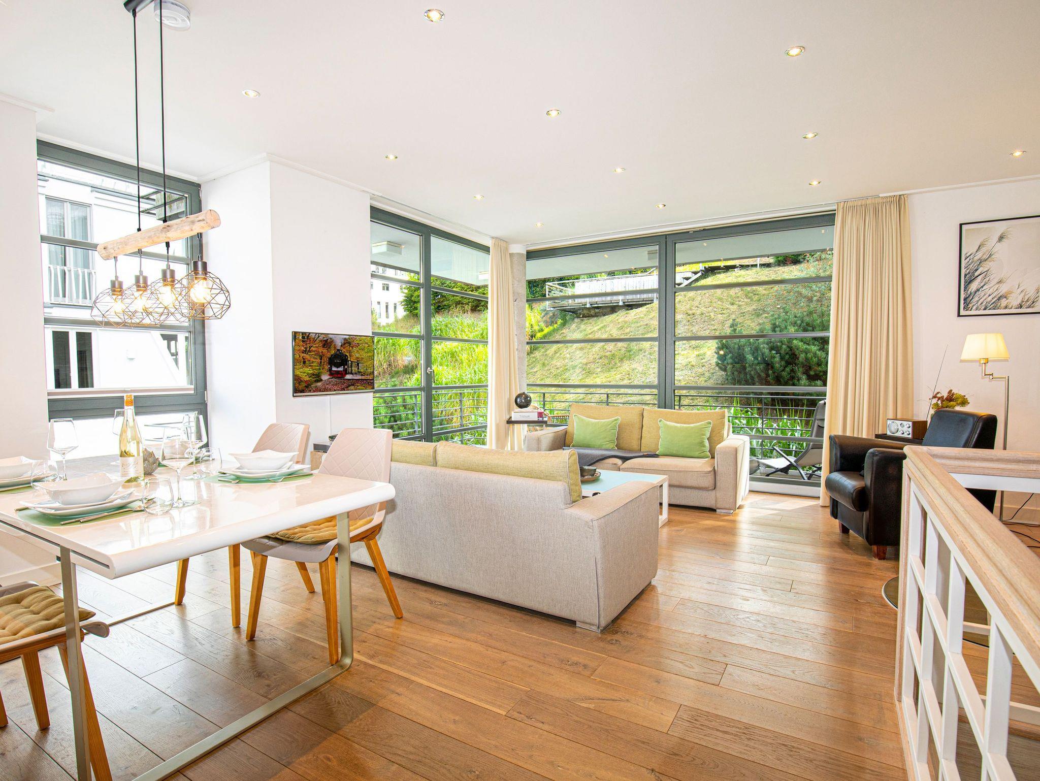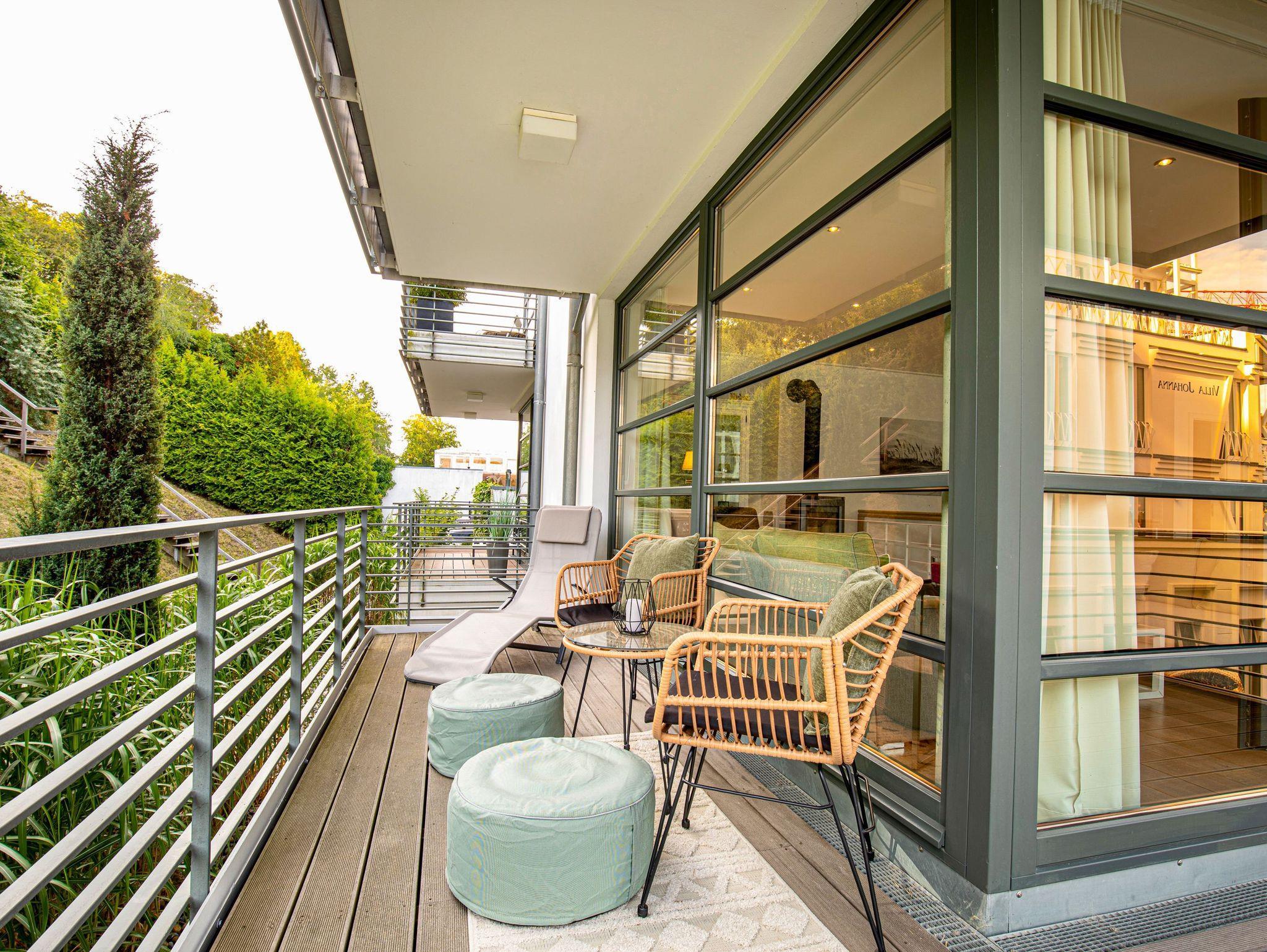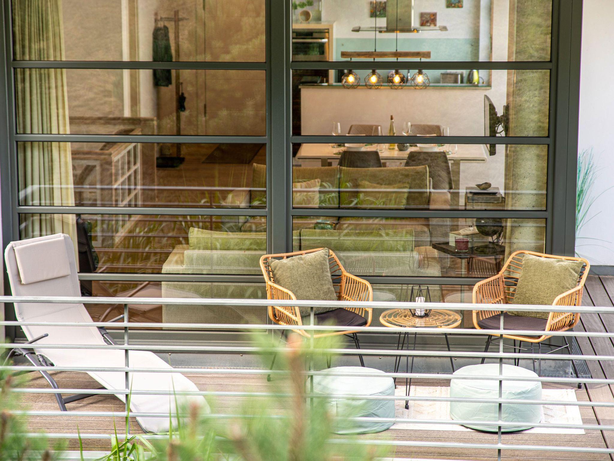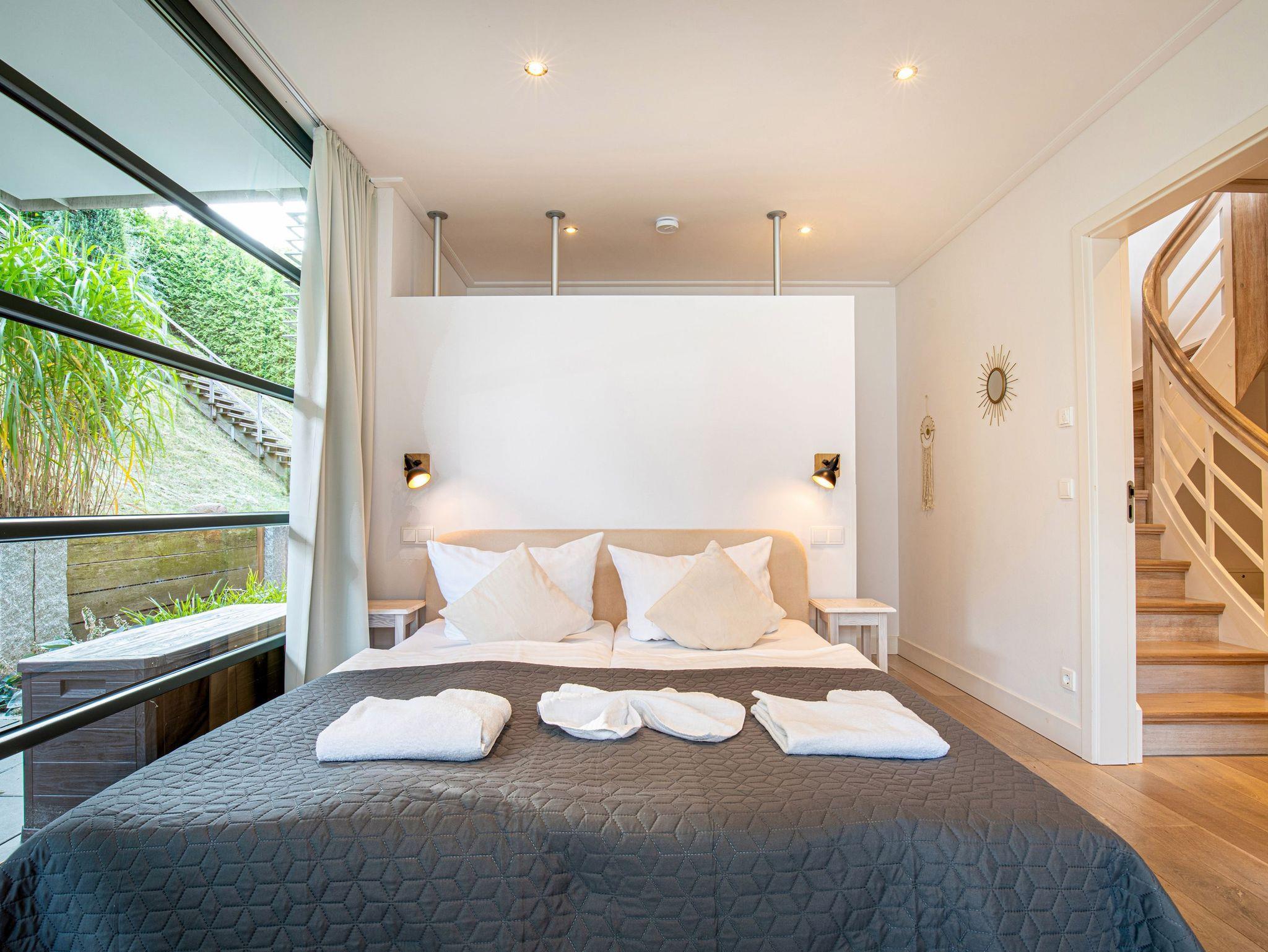 Der großzügige Wohnbereich der Wohnung ist durch viele bodentiefe Fenster lichtdurchflutet. Das besondere Highlight dieser Ferienwohnung ist die Möglichkeit, sowohl von der Terrasse als auch dem großen Balkon im Obergeschoss die herrliche Ruhe und den Blick in den eigens angelegten Garten des Hauses zu genießen. In den Sommermonaten lässt sich außerdem herrlich im Pool entspannen.