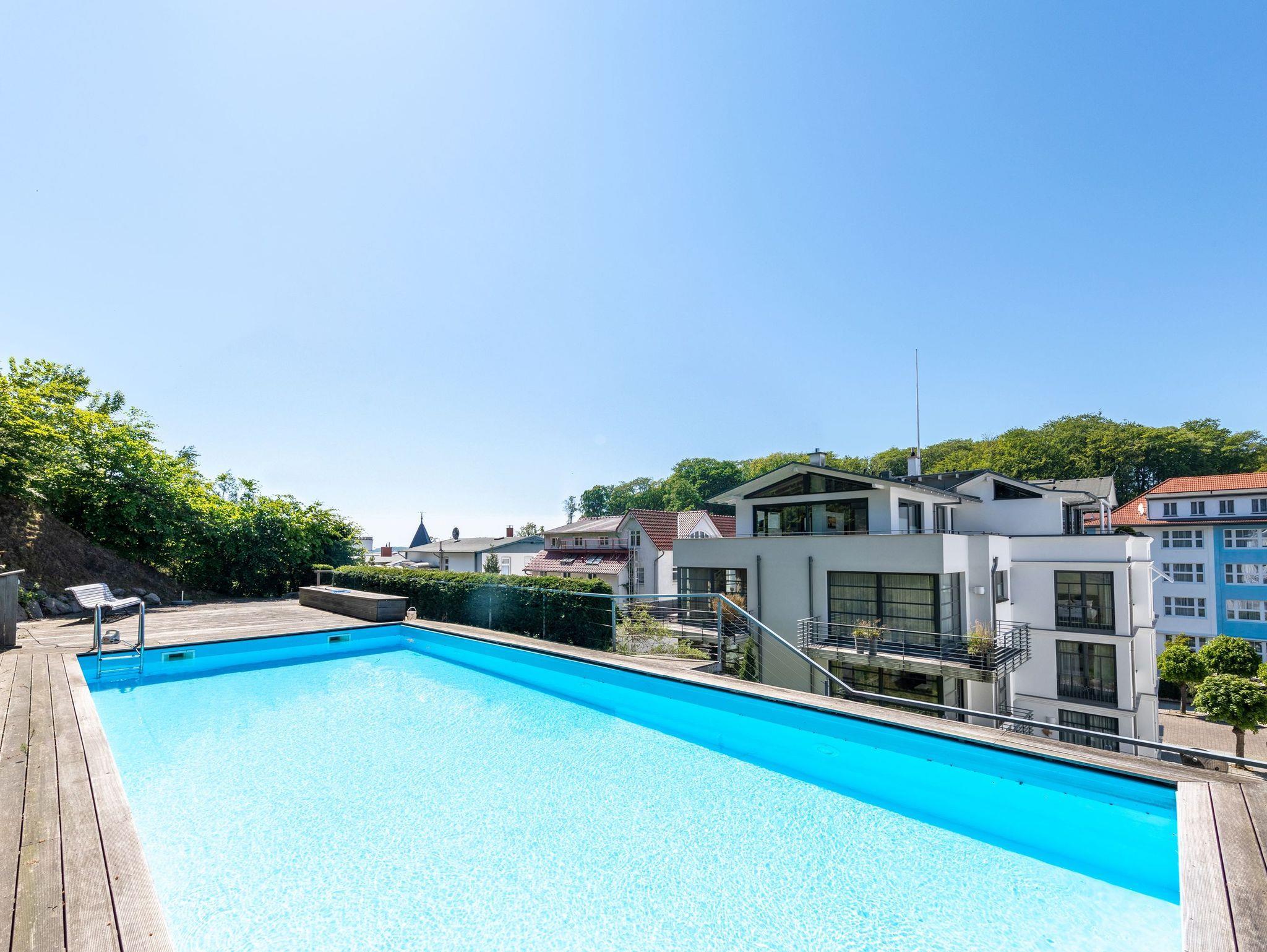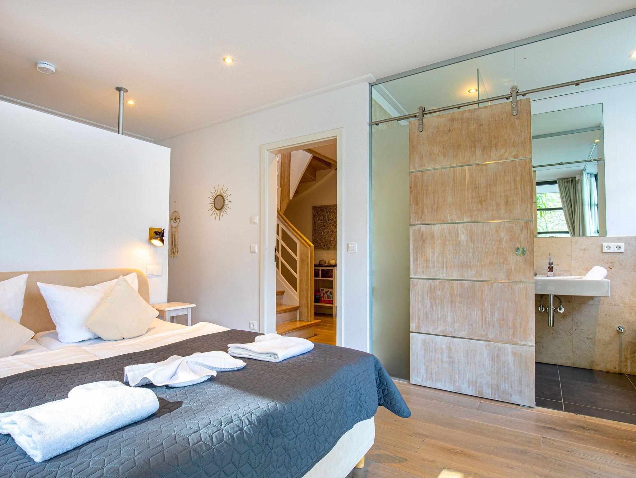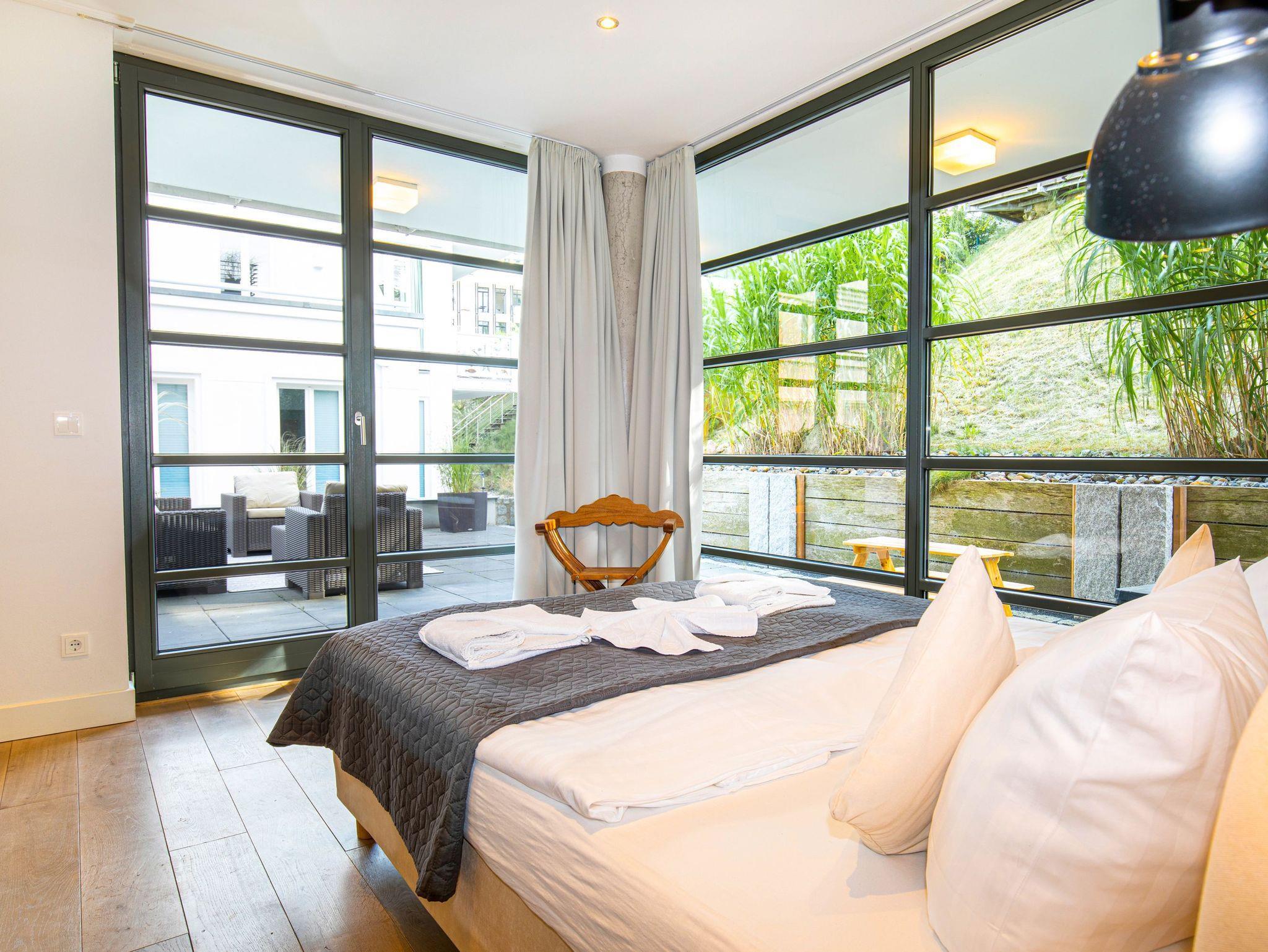 Der großzügige Wohnbereich der Wohnung ist durch viele bodentiefe Fenster lichtdurchflutet. Das besondere Highlight dieser Ferienwohnung ist die Möglichkeit, sowohl von der Terrasse als auch dem großen Balkon im Obergeschoss die herrliche Ruhe und den Blick in den eigens angelegten Garten des Hauses zu genießen. In den Sommermonaten lässt sich außerdem herrlich im Pool entspannen.